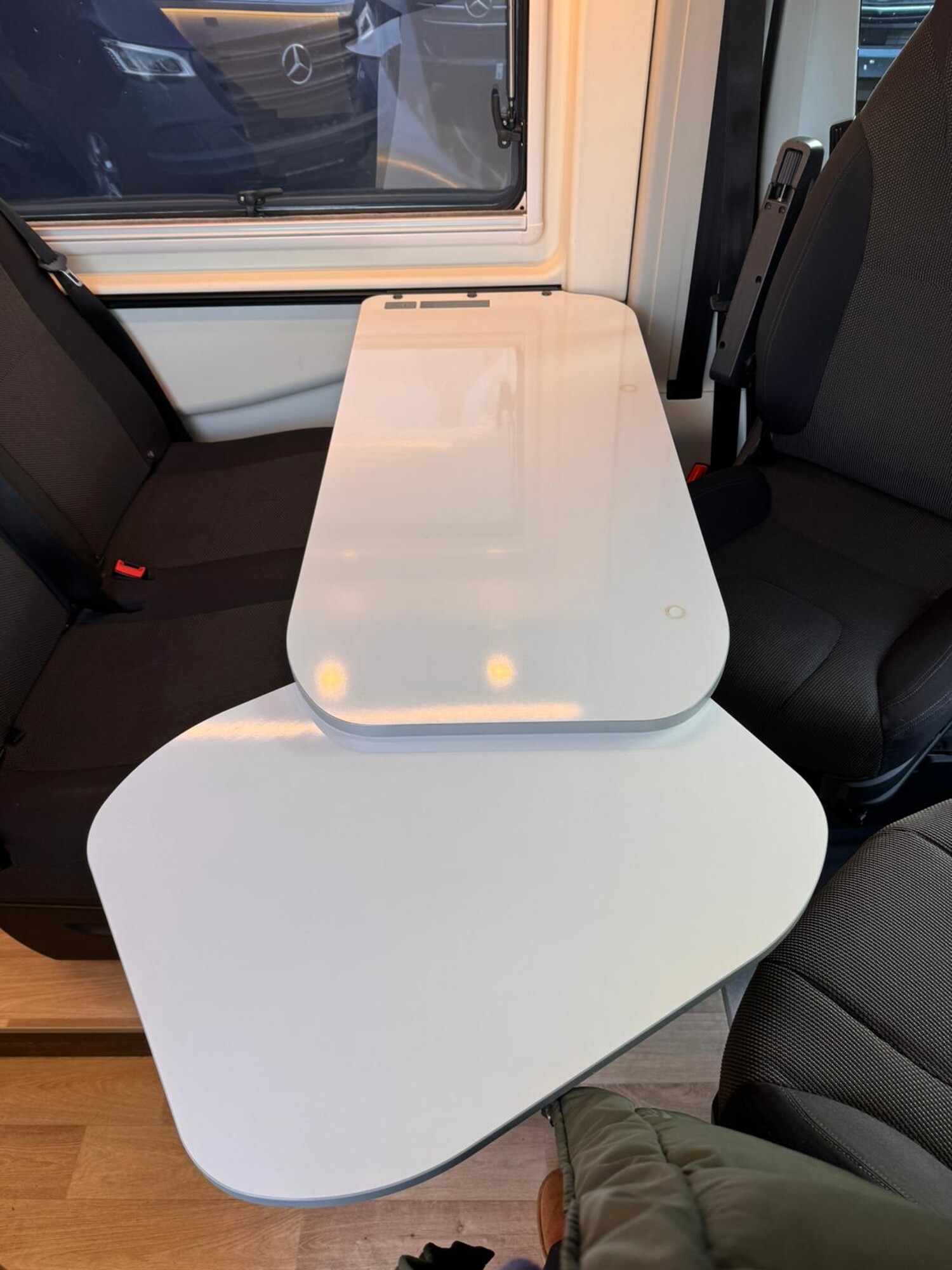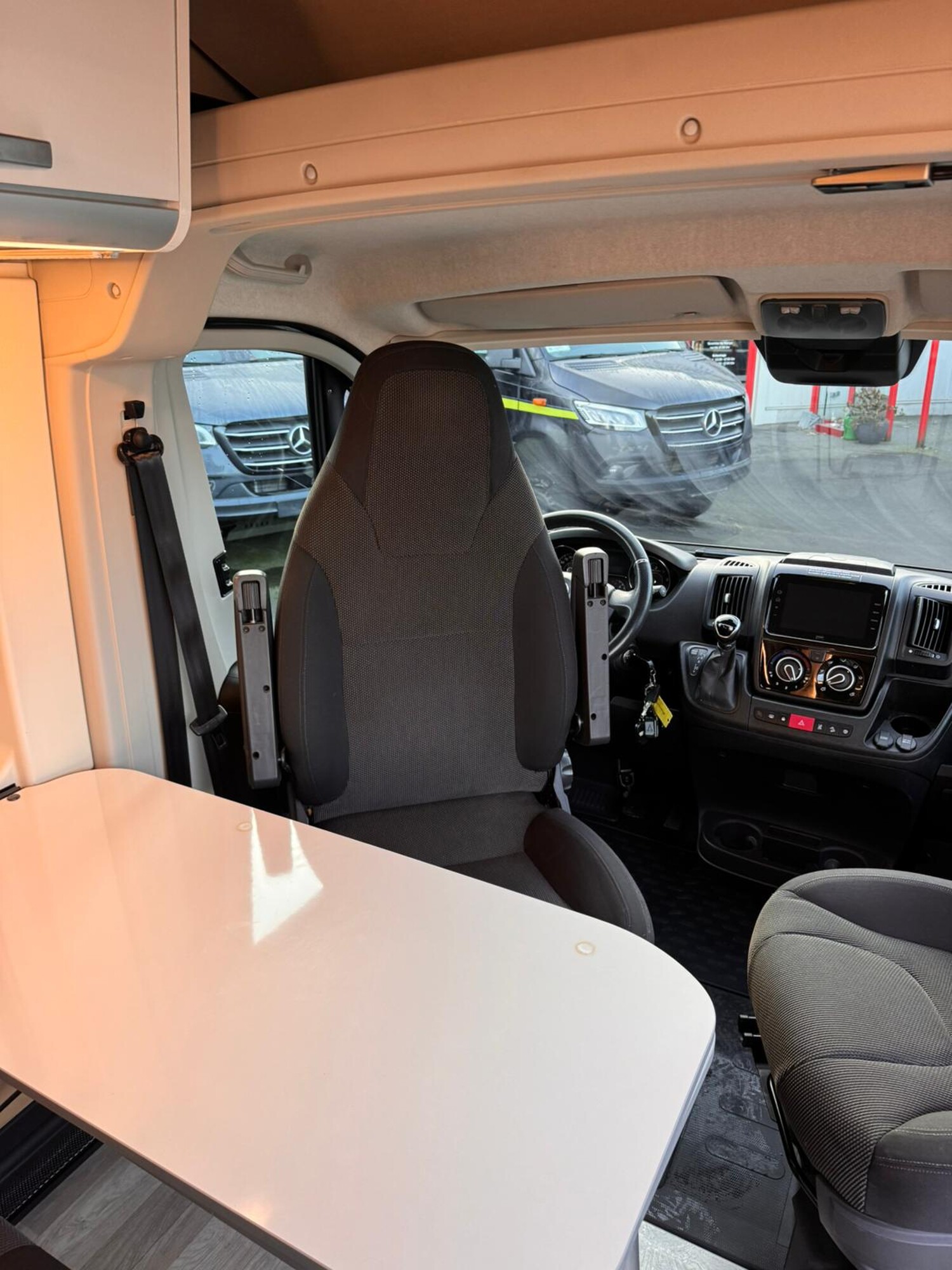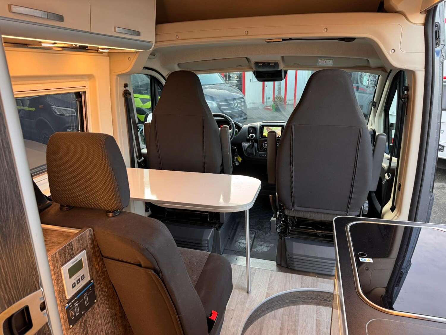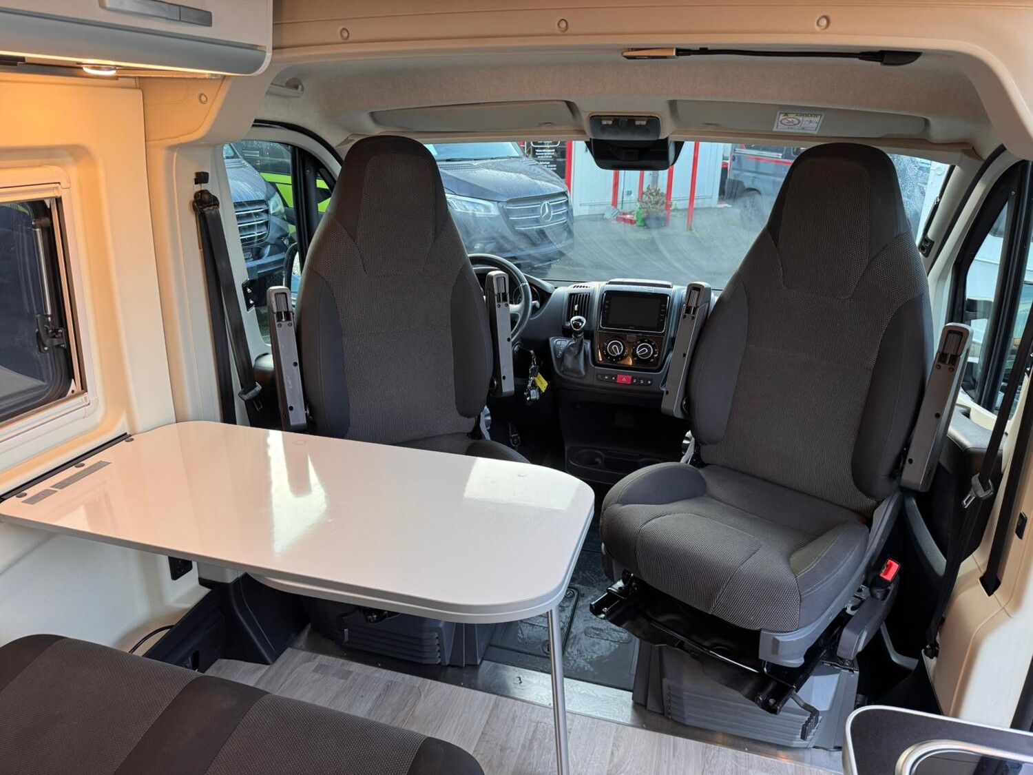 - Seitensitzgruppe mit einem abbaubaren Tisch inkl. drehbarer Tischerweiterung, einer Steckdose, Stauschränke und einem Fenster