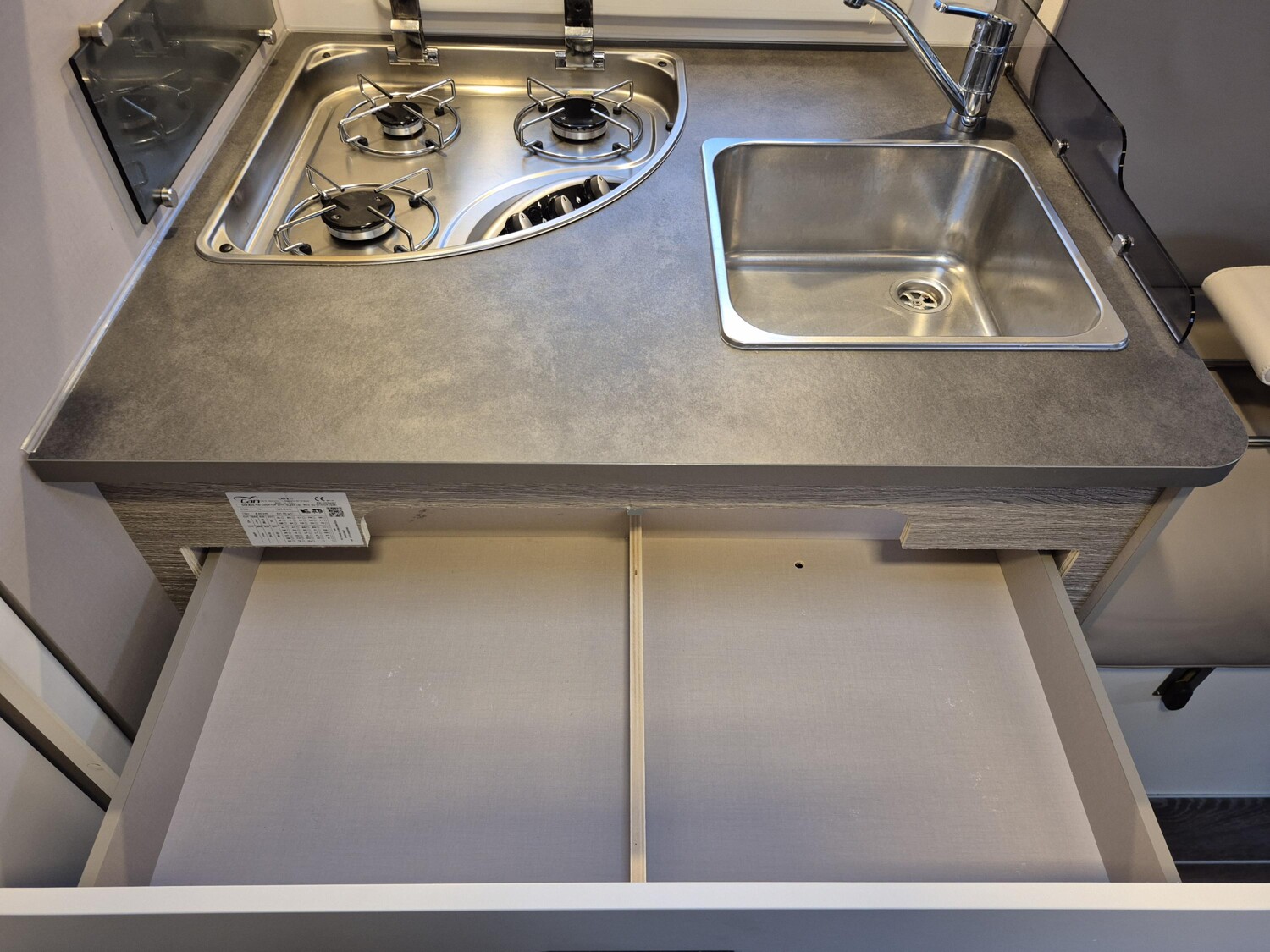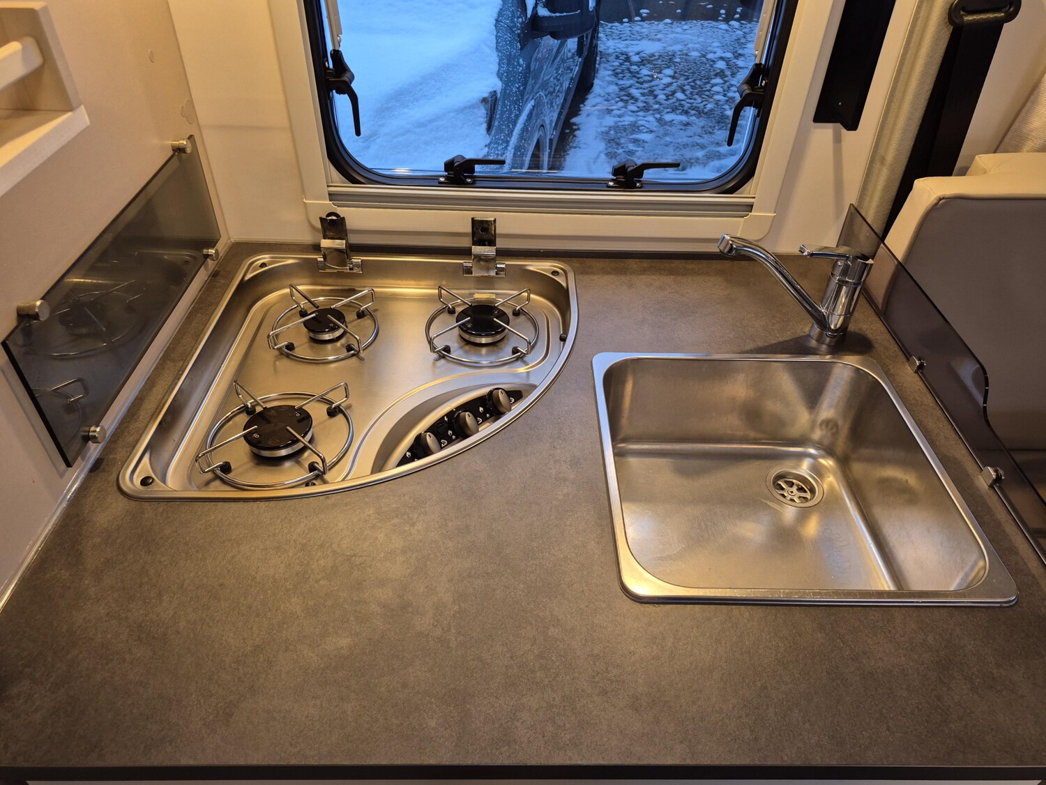 - Küchenzeile mit einem 3-Flammenkocher, einem Spülbecken, Spritzschutz, Staufächern und Stauschränke