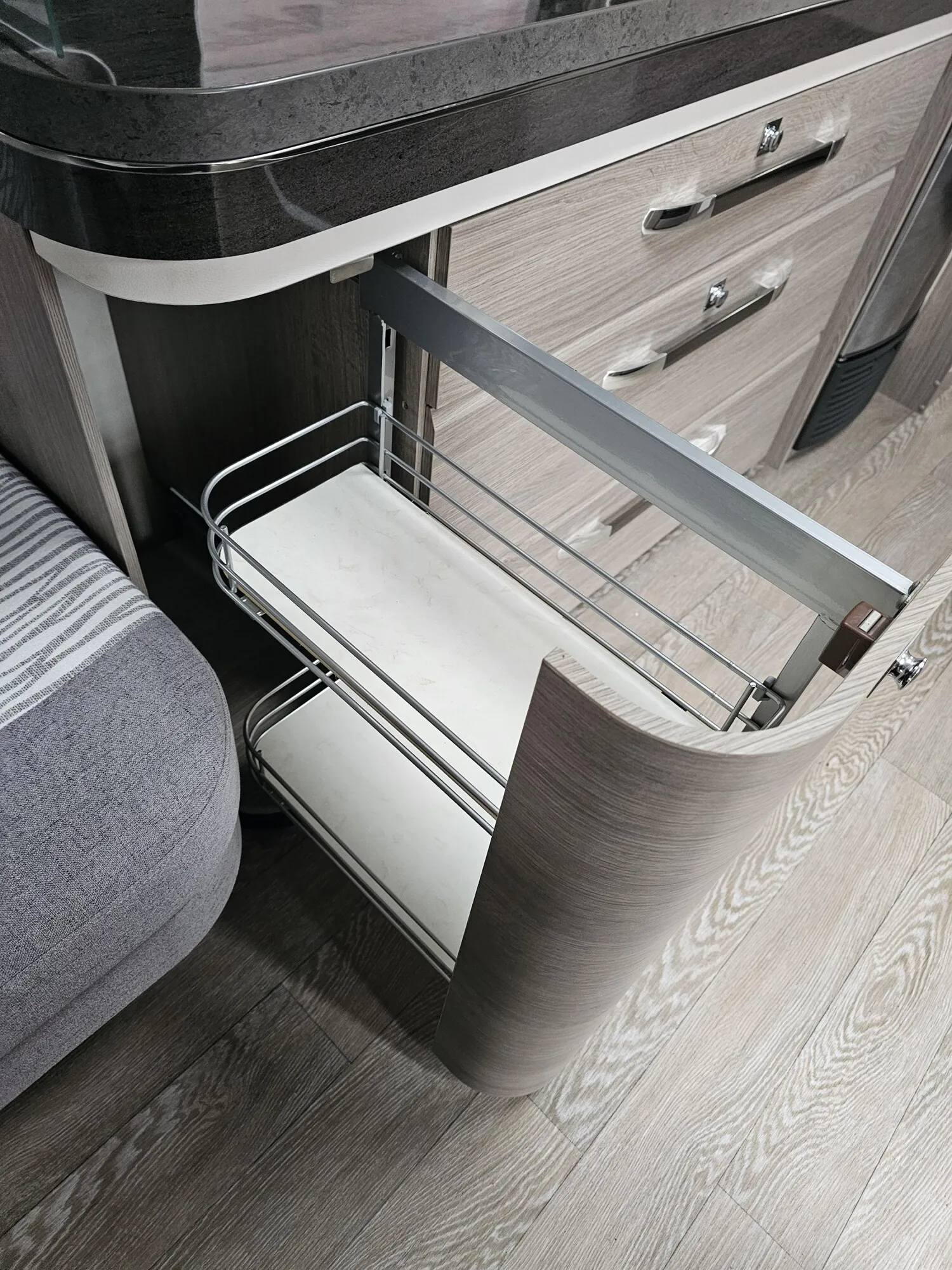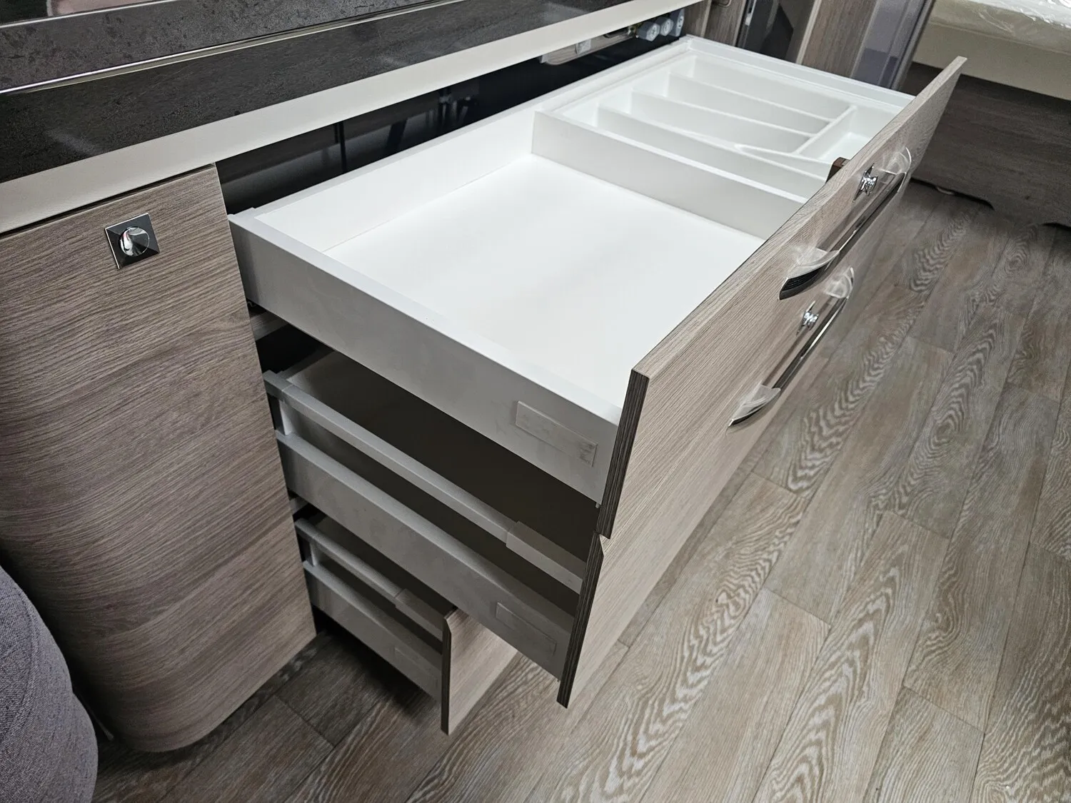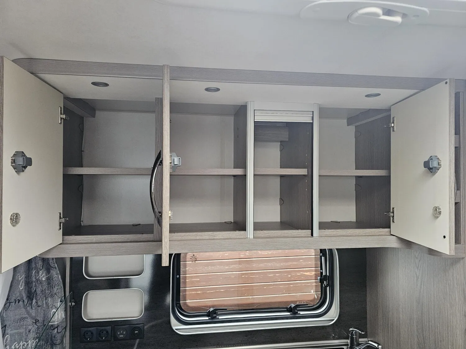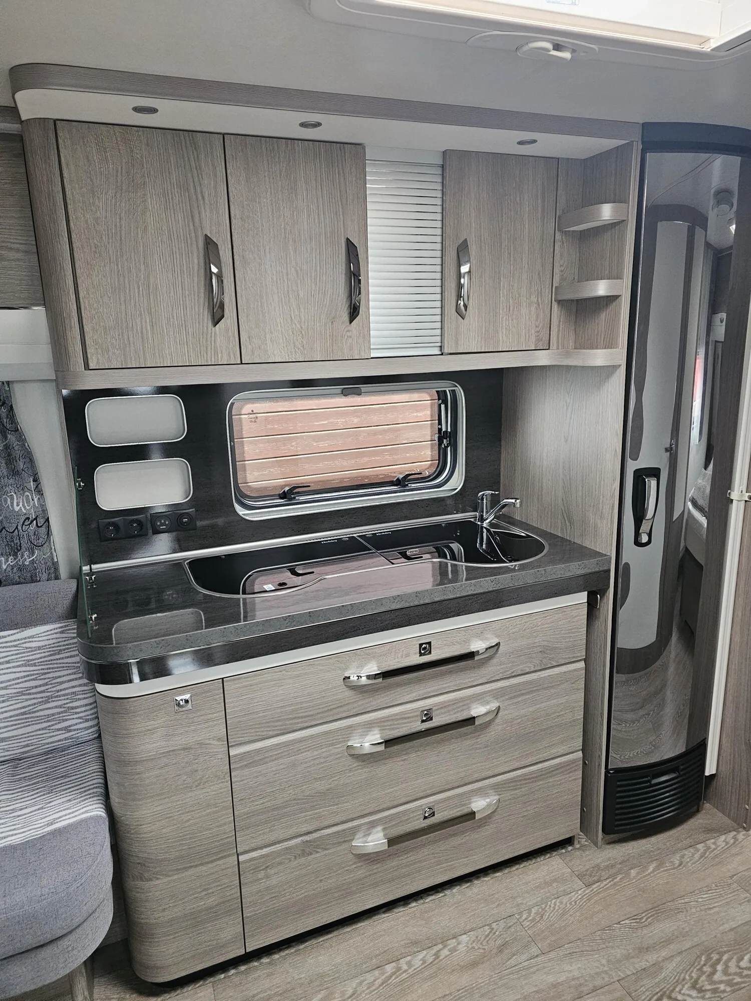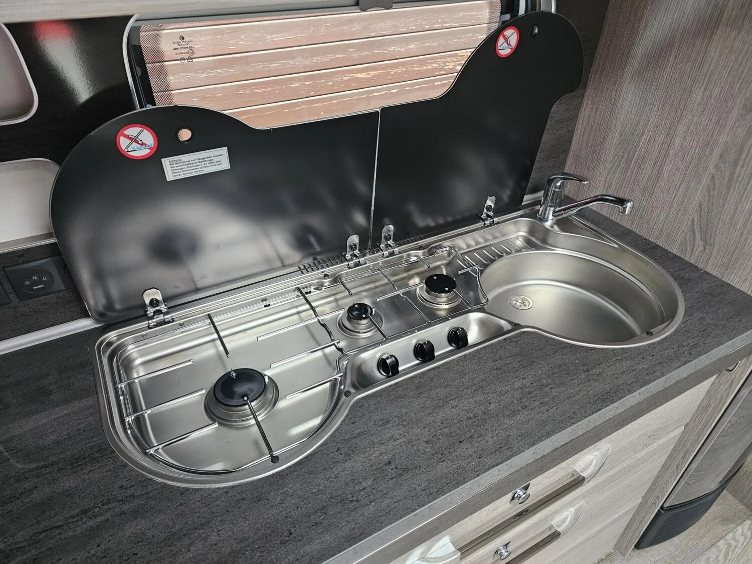 - Küchenzeile mit einem 3-Flammenkocher, Spüle, Glasabdeckungen, Apothekerauszug, Schubladen, Staufächer und großem Kühlschrank