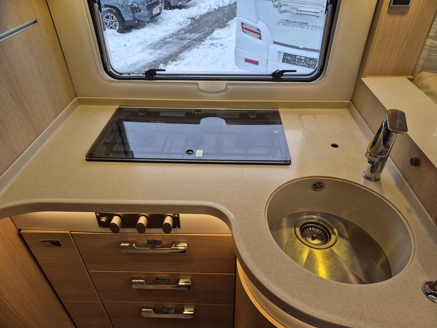 - Küchenzeile mit einem Dometickühlschrank inkl. Titan Lüfter, Tiefkühler und Backofen, einem Dachventilator über der Küchenzeile, 3-Flammen-Kocher inkl. Glasabdeckung und Staufächern