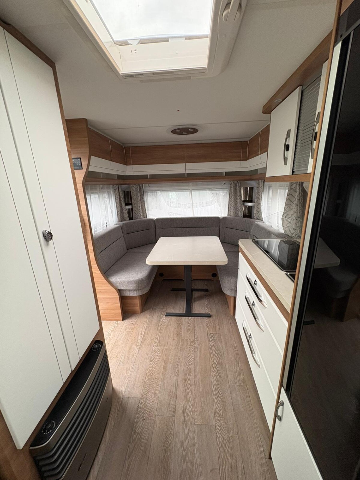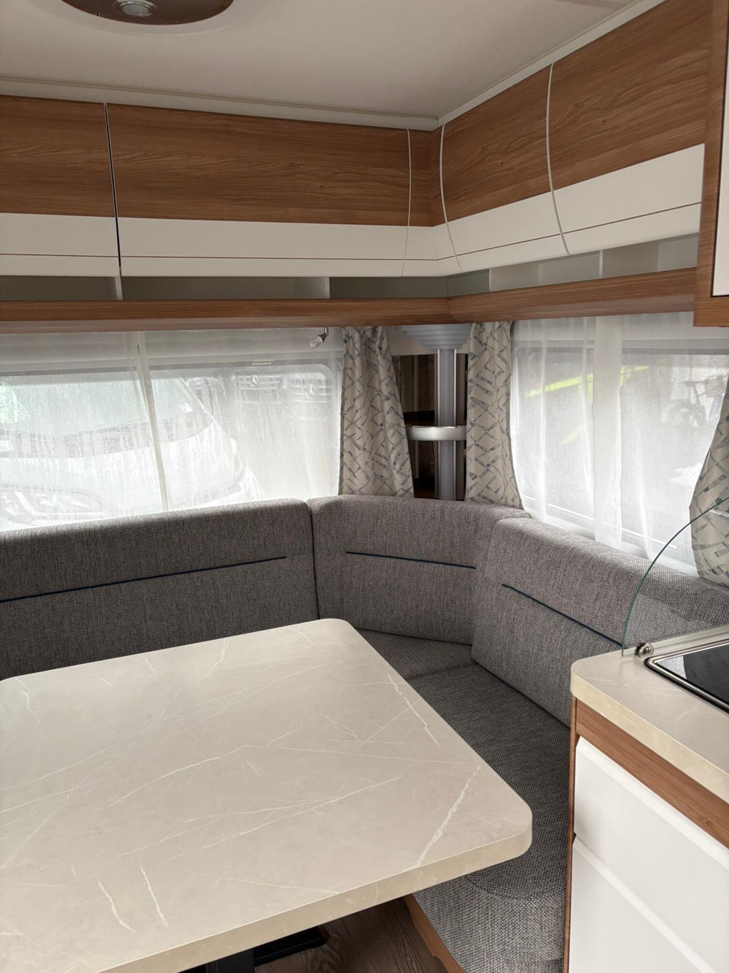 - Rundsitzgruppe im Heck, umbaubar zur Schlafwiese, umliegende Stauschränke, Einsäulentisch, Staufläche unter der Sitzgruppe