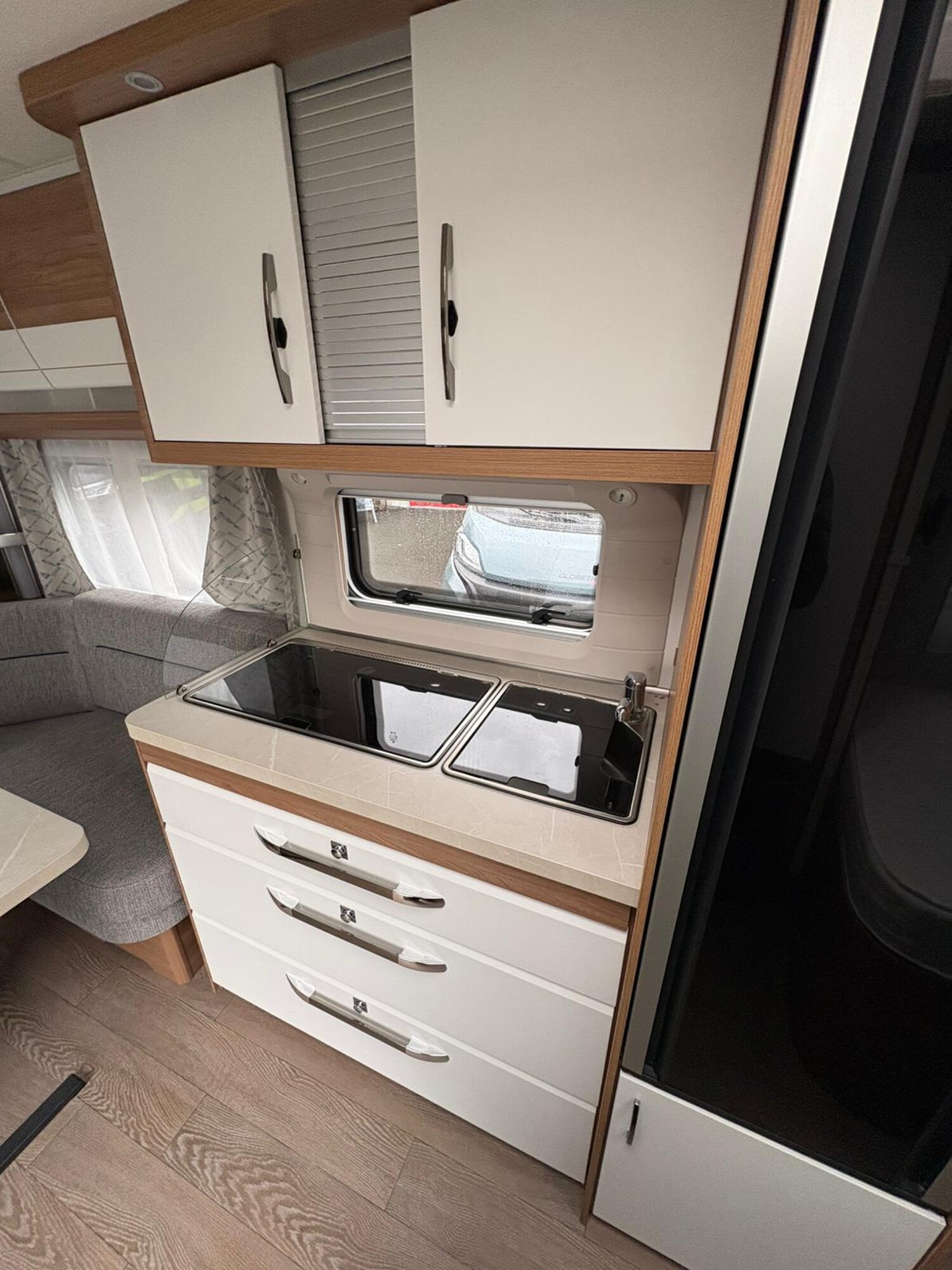 - Nasszelle mit Duscharmatur mit Duschvorhang, Verdunkelungsrollo inkl. Insektenschutz und separatem Waschbecken mit Spiegel
