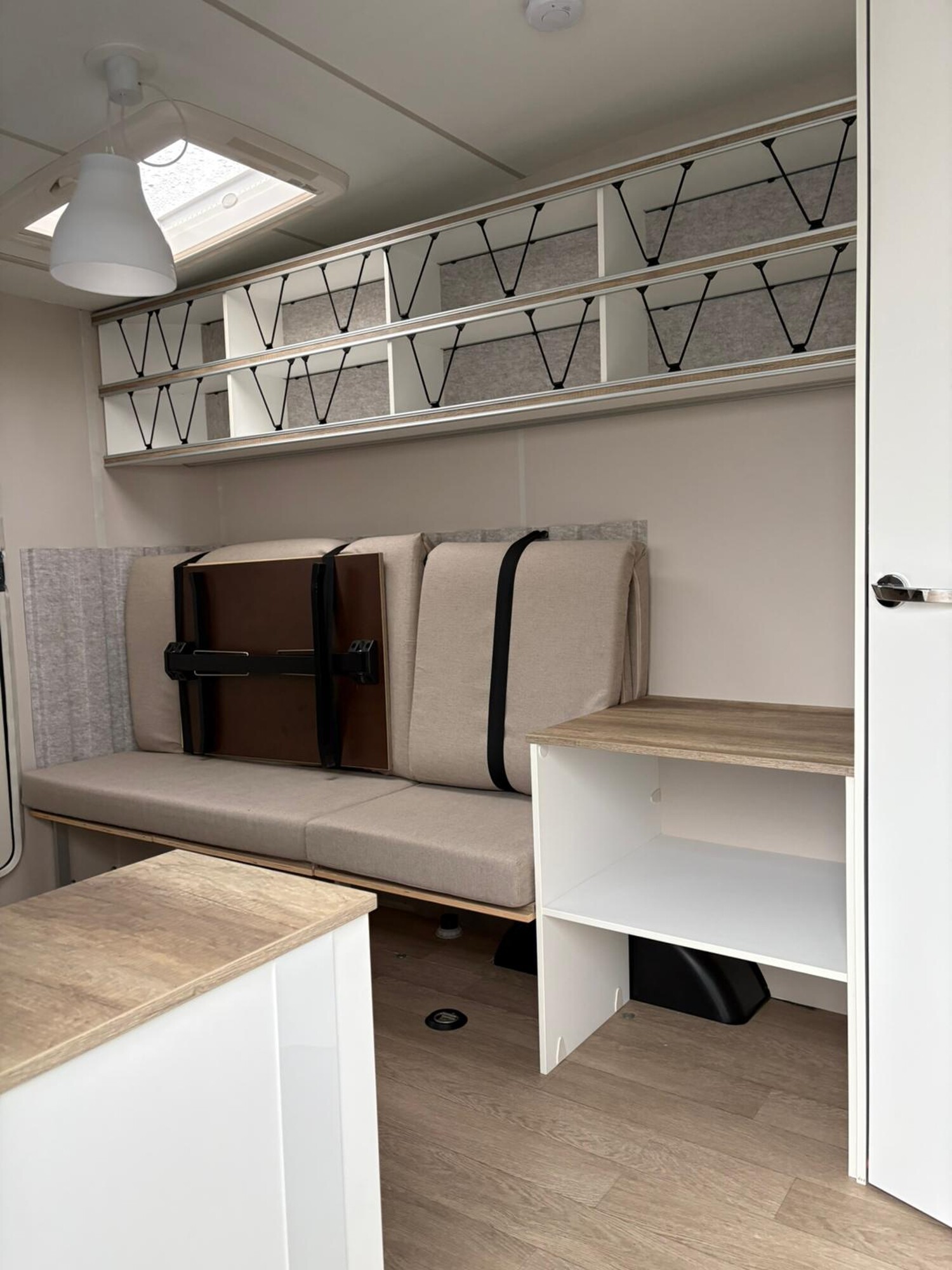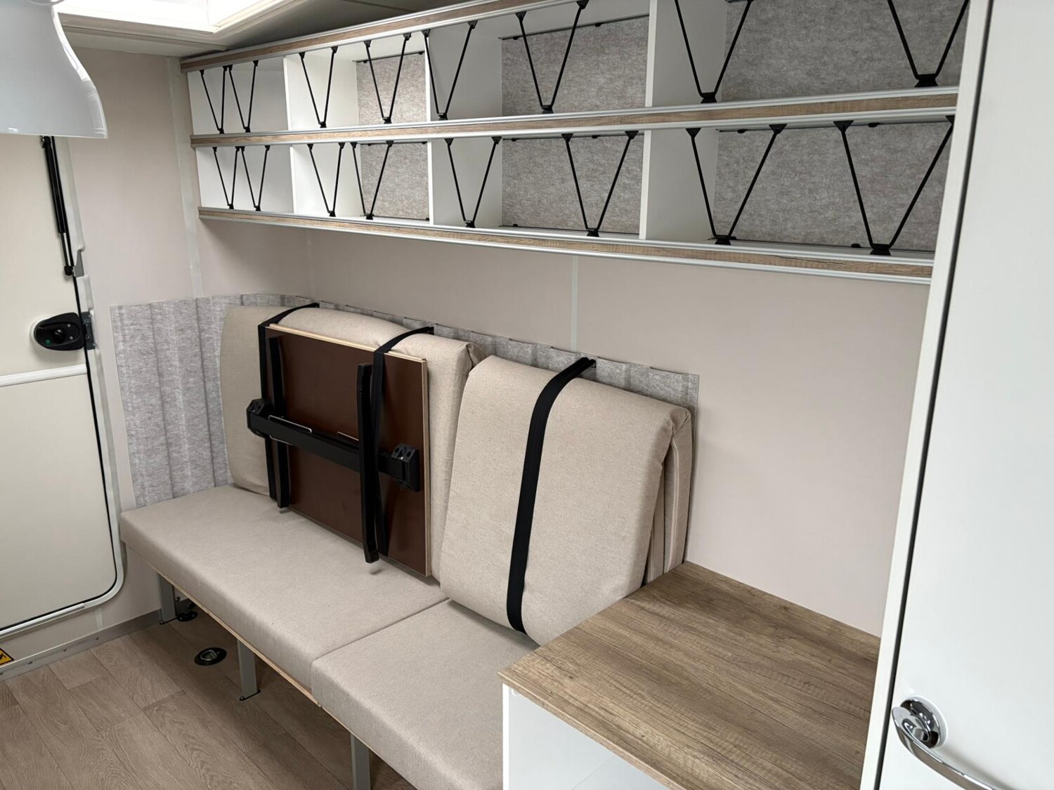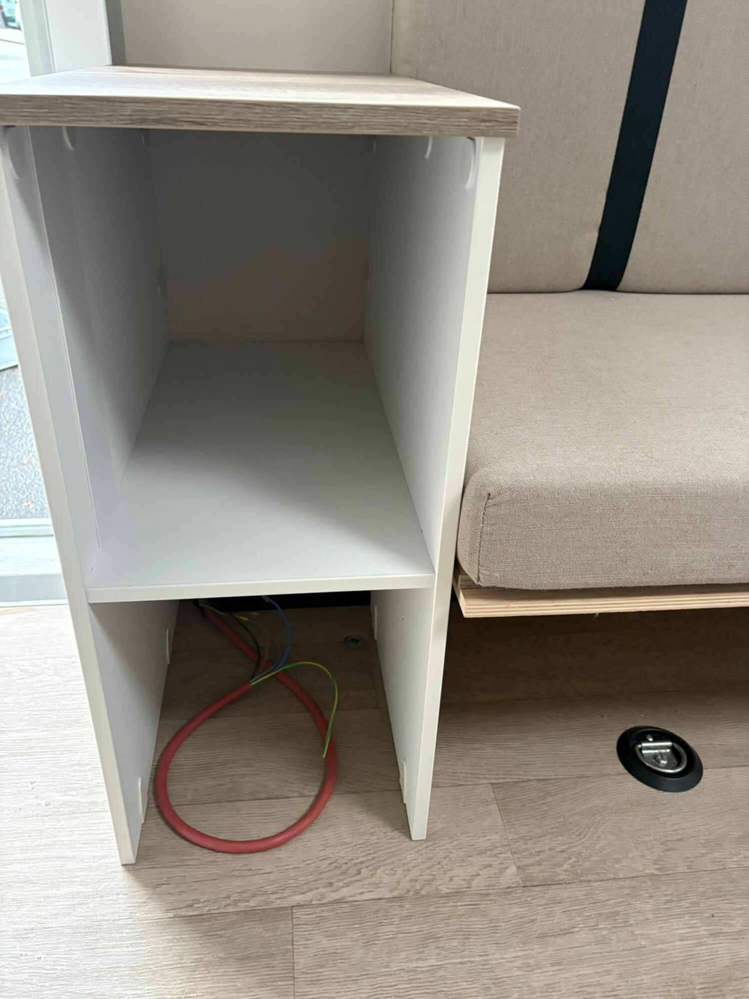 - Stauschränke oberhalb und neben der Sitzgruppe