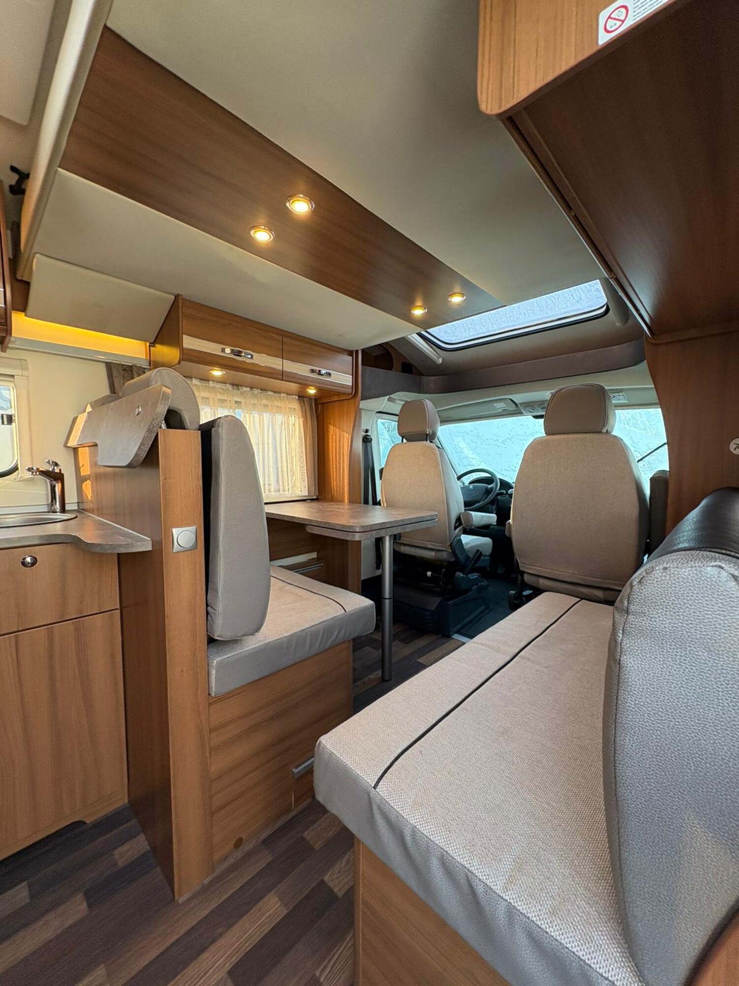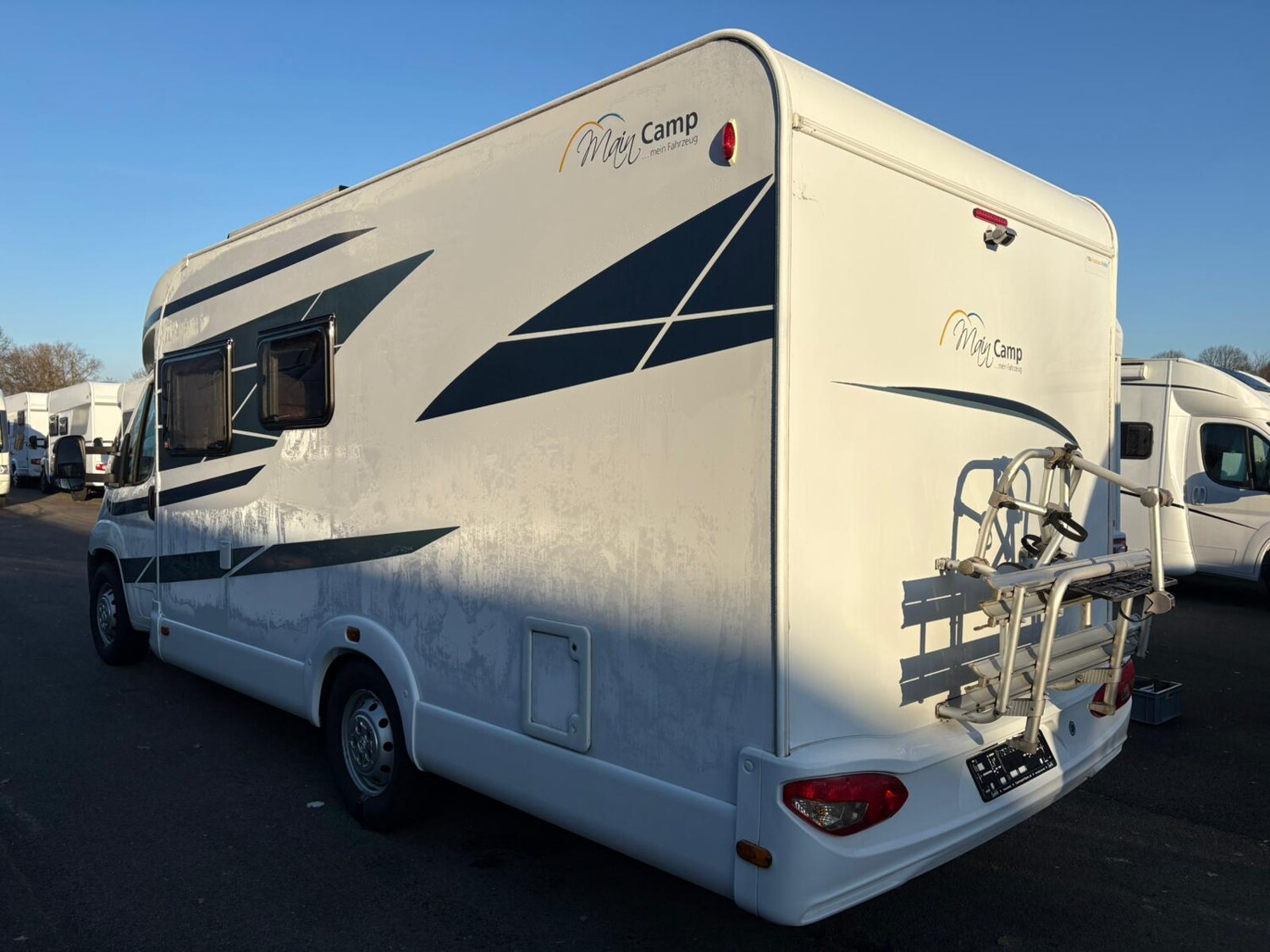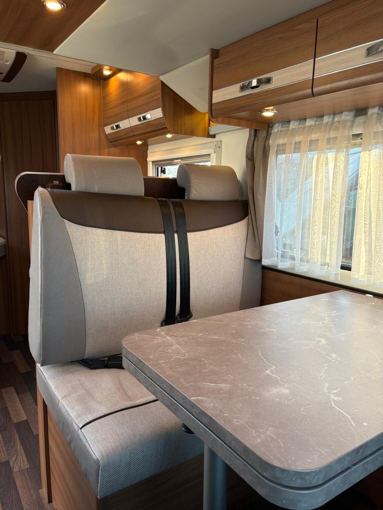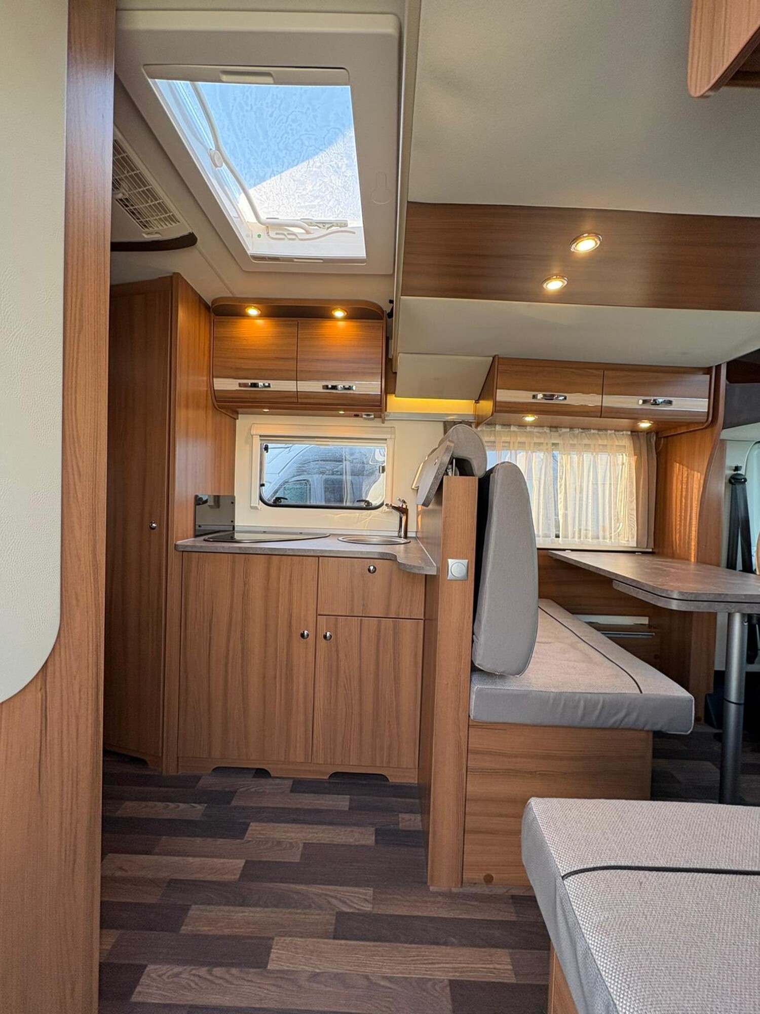 - Französisches Bett im Heck mit Staufläche darunter und umliegenden Stauschränken