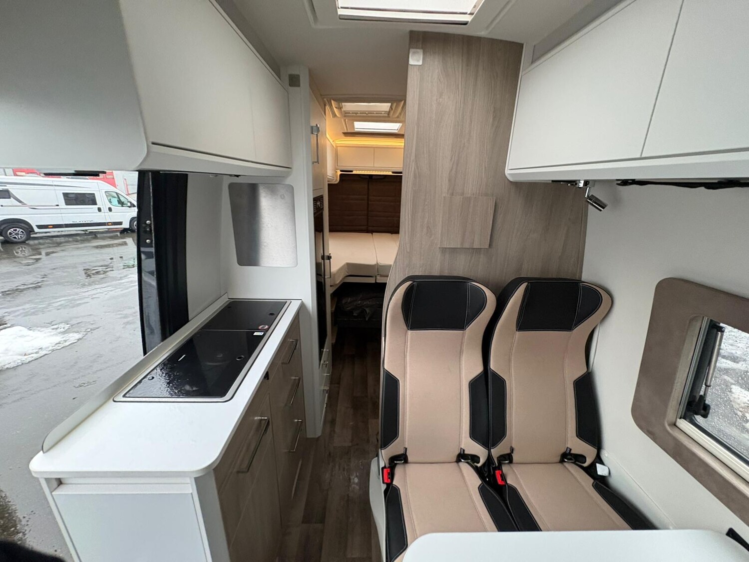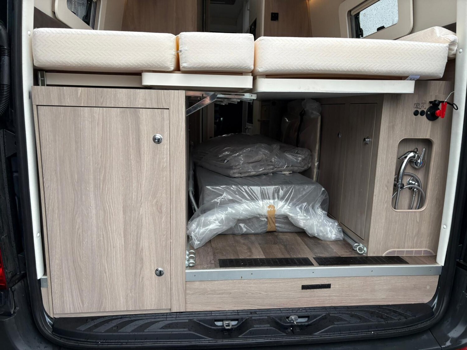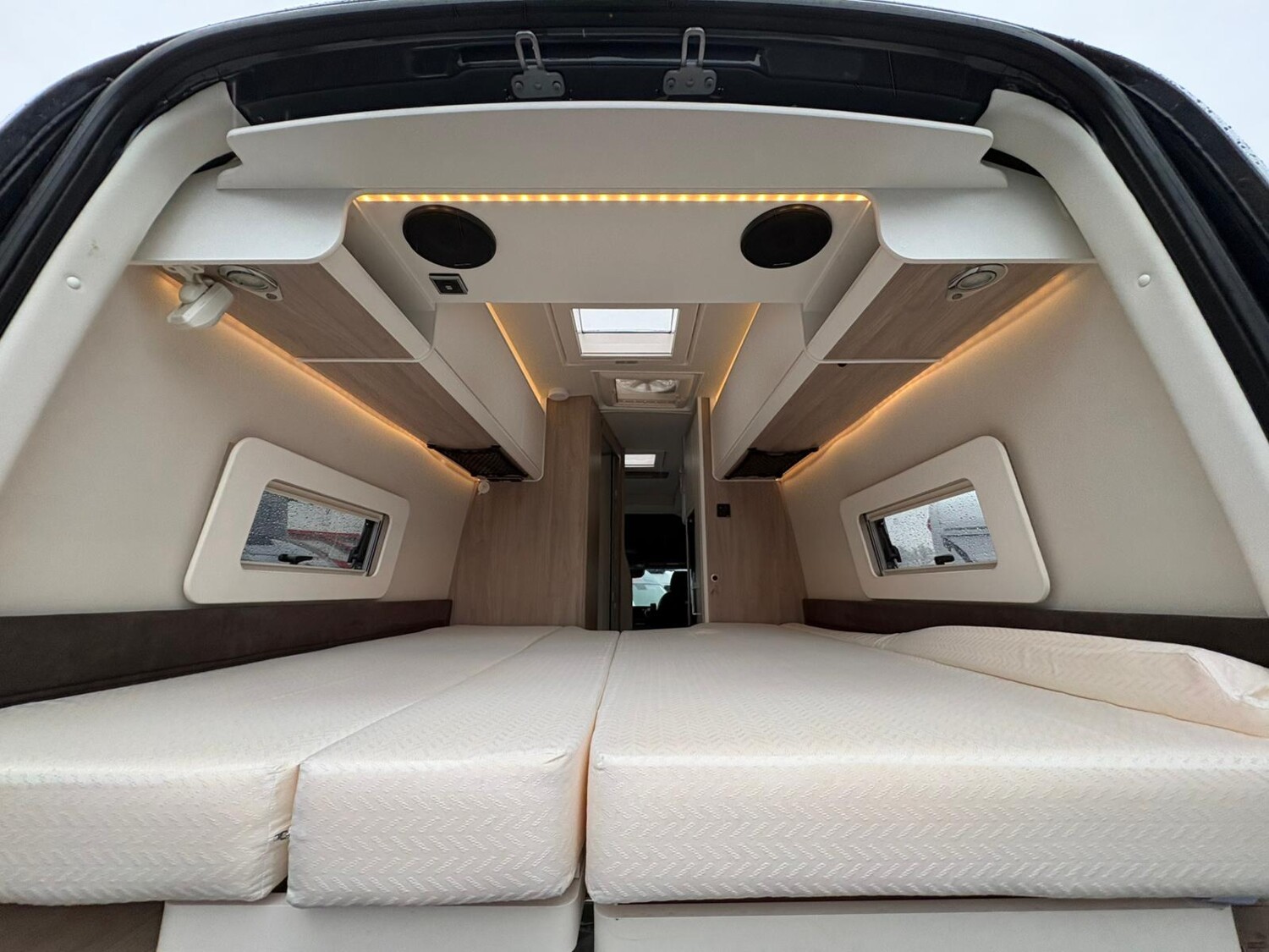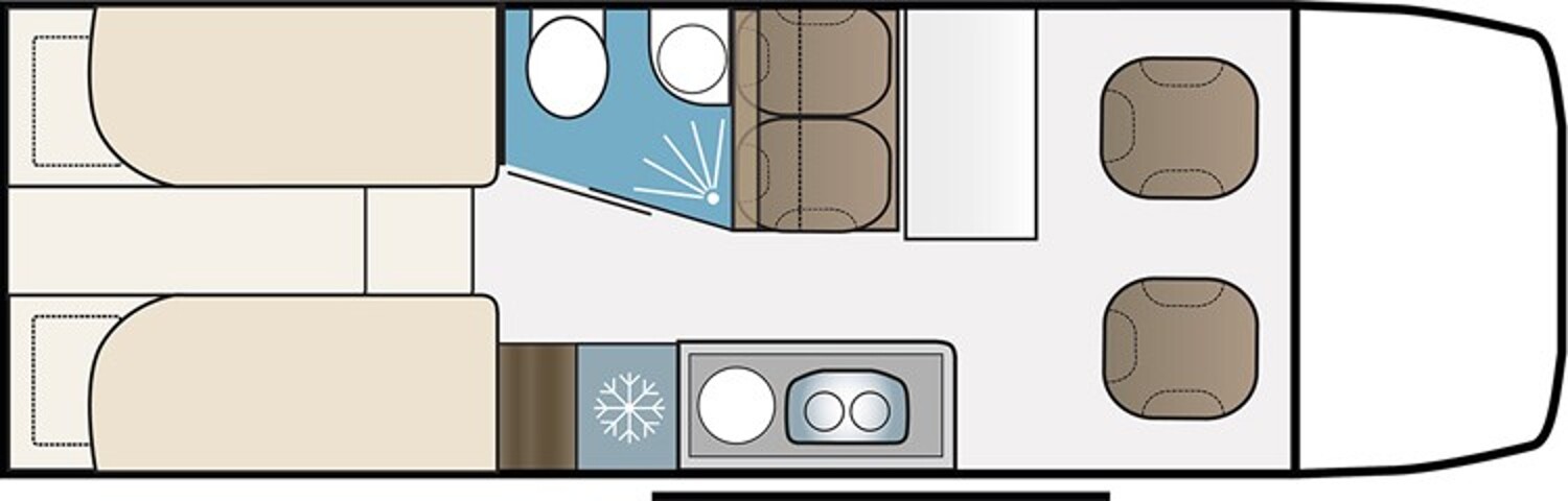 - Einzelbetten im Heck mit Staufläche darunter, zwei Fenster, umliegende Stauschränke, ausziehbare Treppe