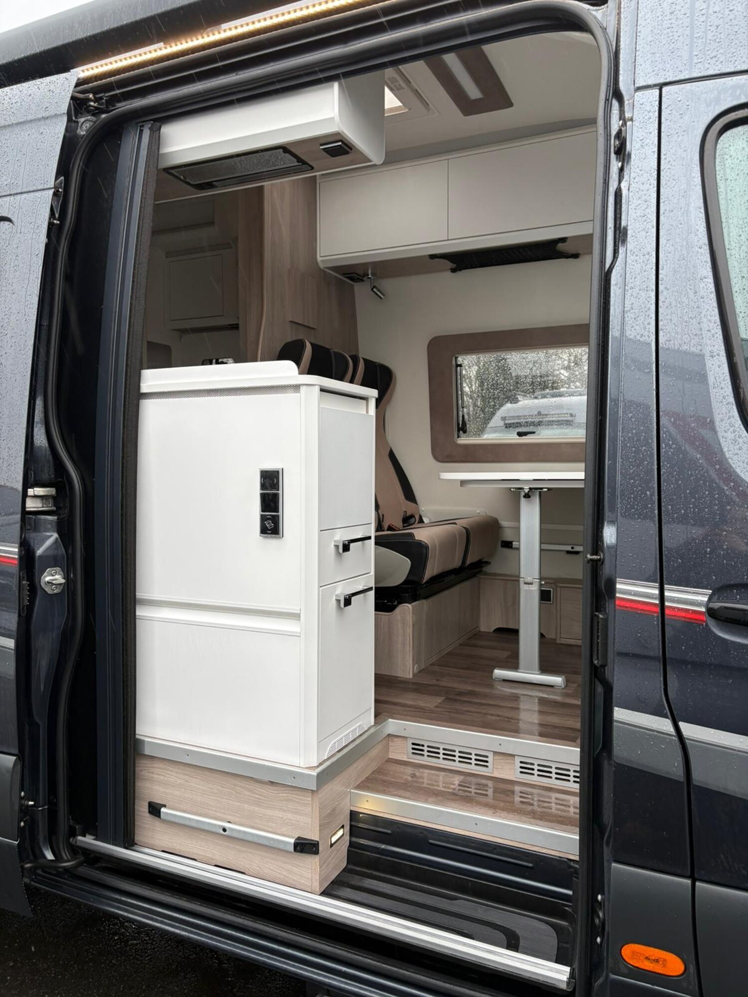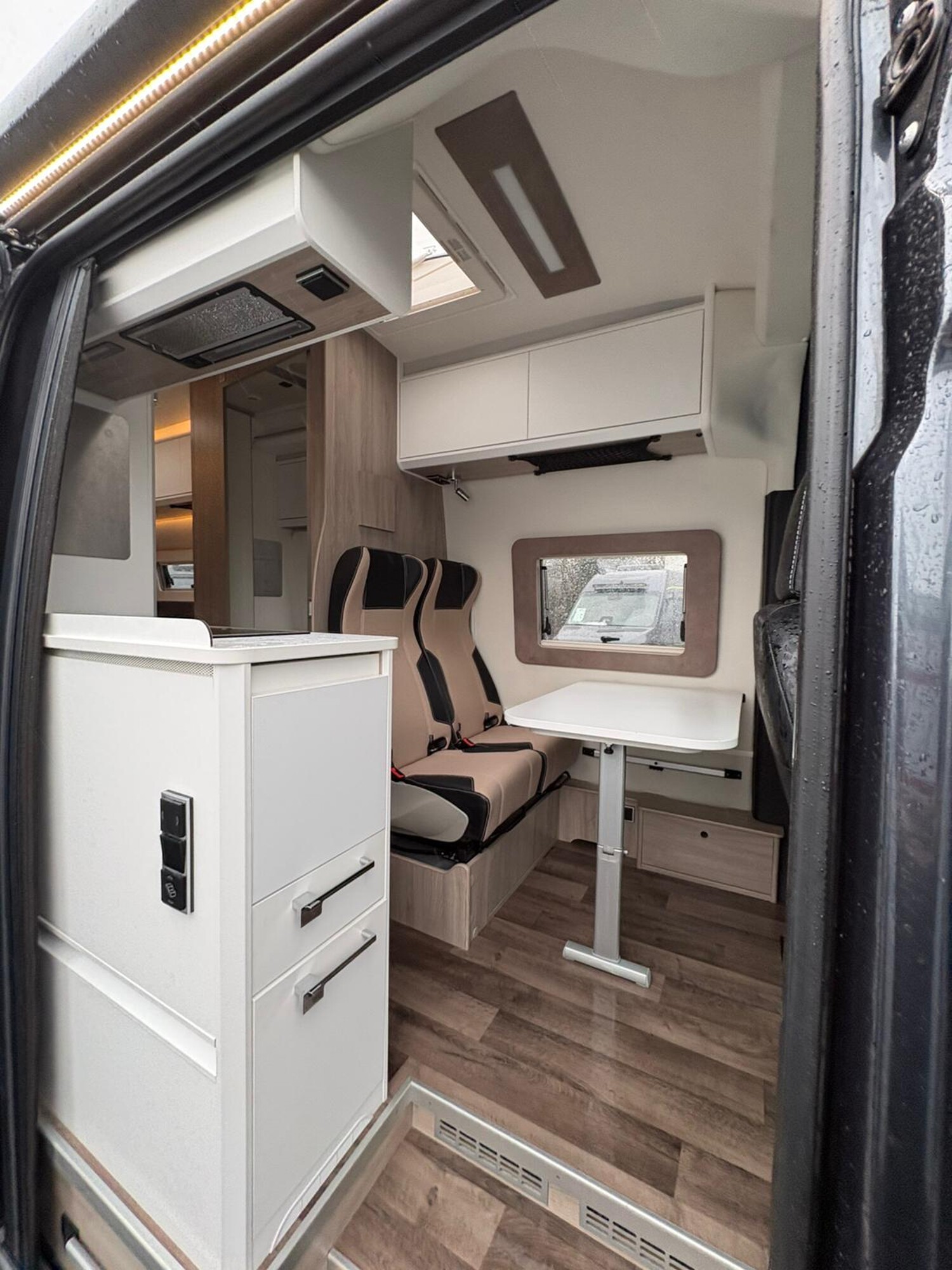 - Küchenzeile mit einem 2-Flammkocher und einer Spüle inkl. Glasabdeckung, Dunstabzugshaube, Schubladen, Stauschränke, Kühlschrank mit Eisfach