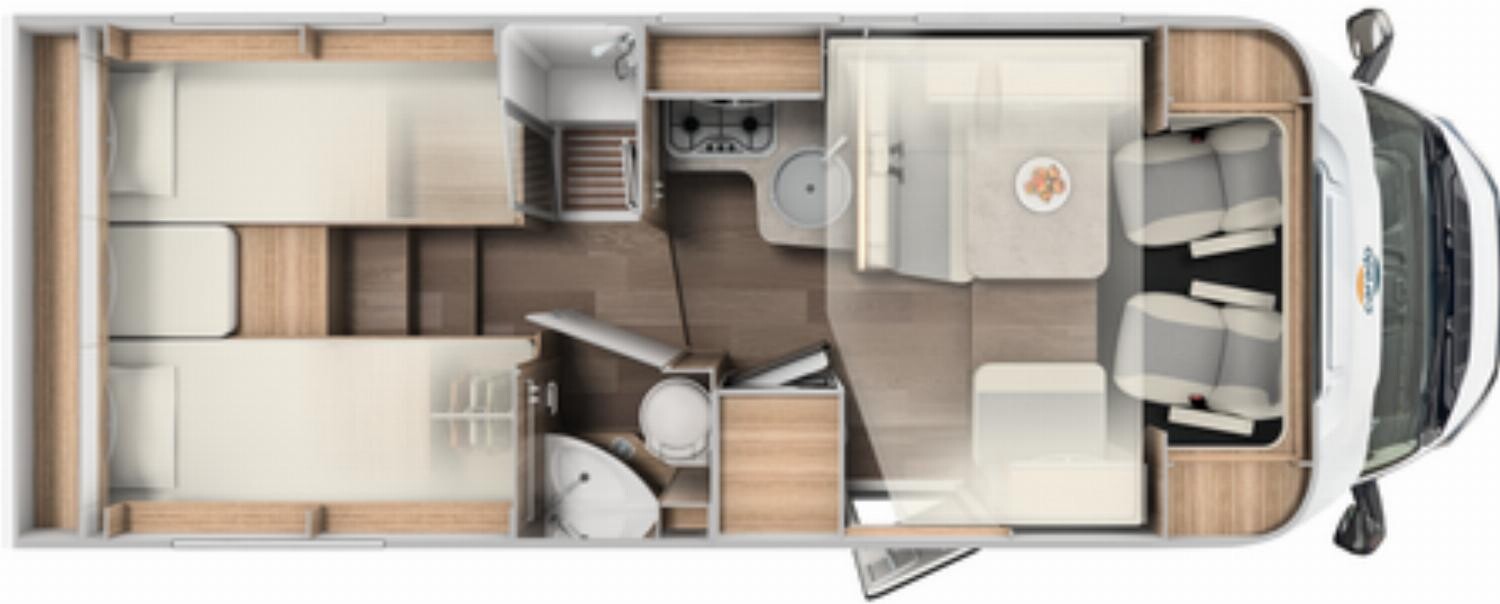- Einzelbetten im Heck inkl. Polster für eine Bettverbreiterung, Leselampen, Stauschränke, Stauraum unter dem Bett