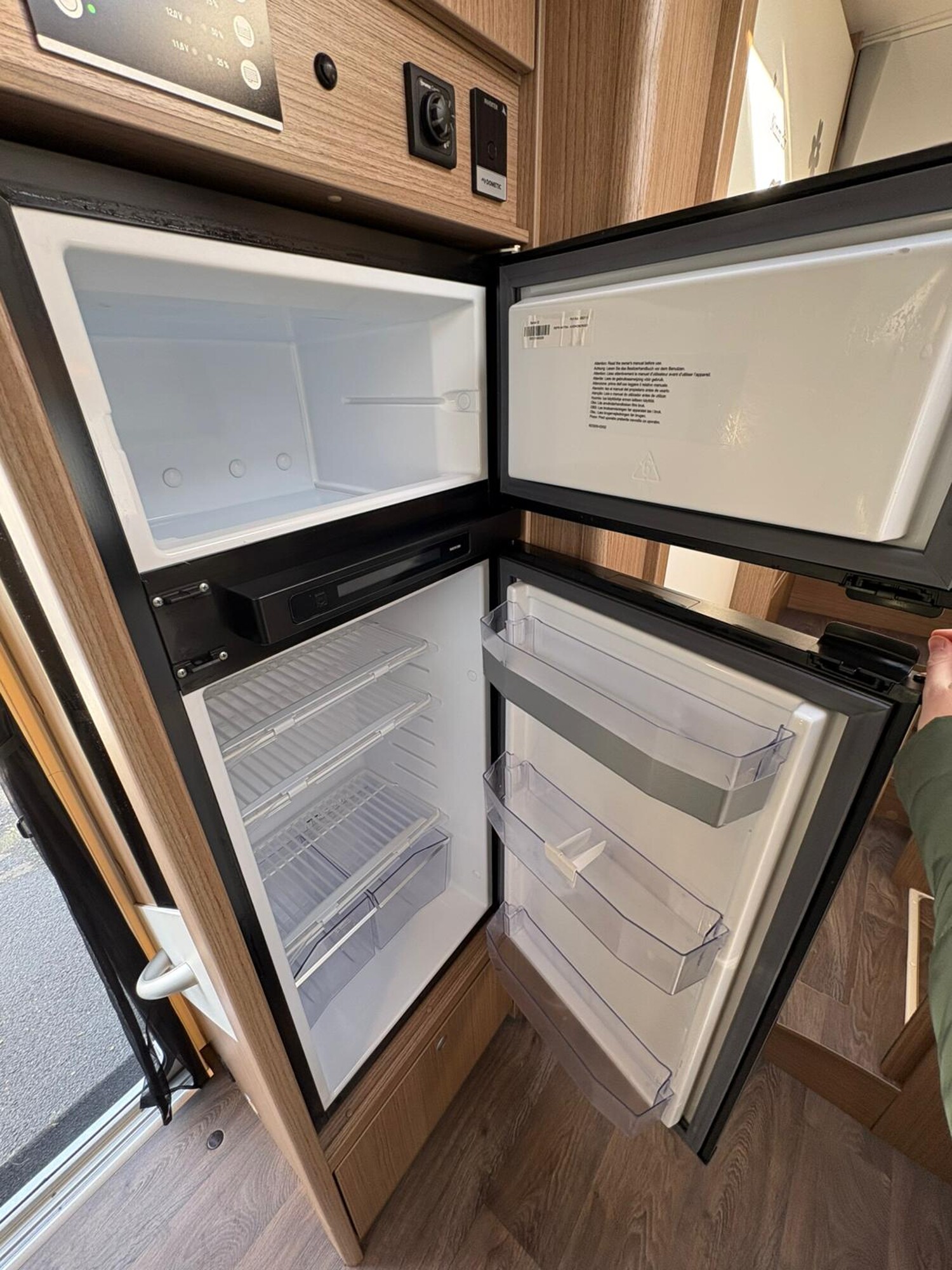 - Küchenzeile mit einem 3-Flammkocher und Spüle inkl. Glasabdeckung, Schubladen, Stauschränke, Großer Kühlschrank mit separatem Eisfach