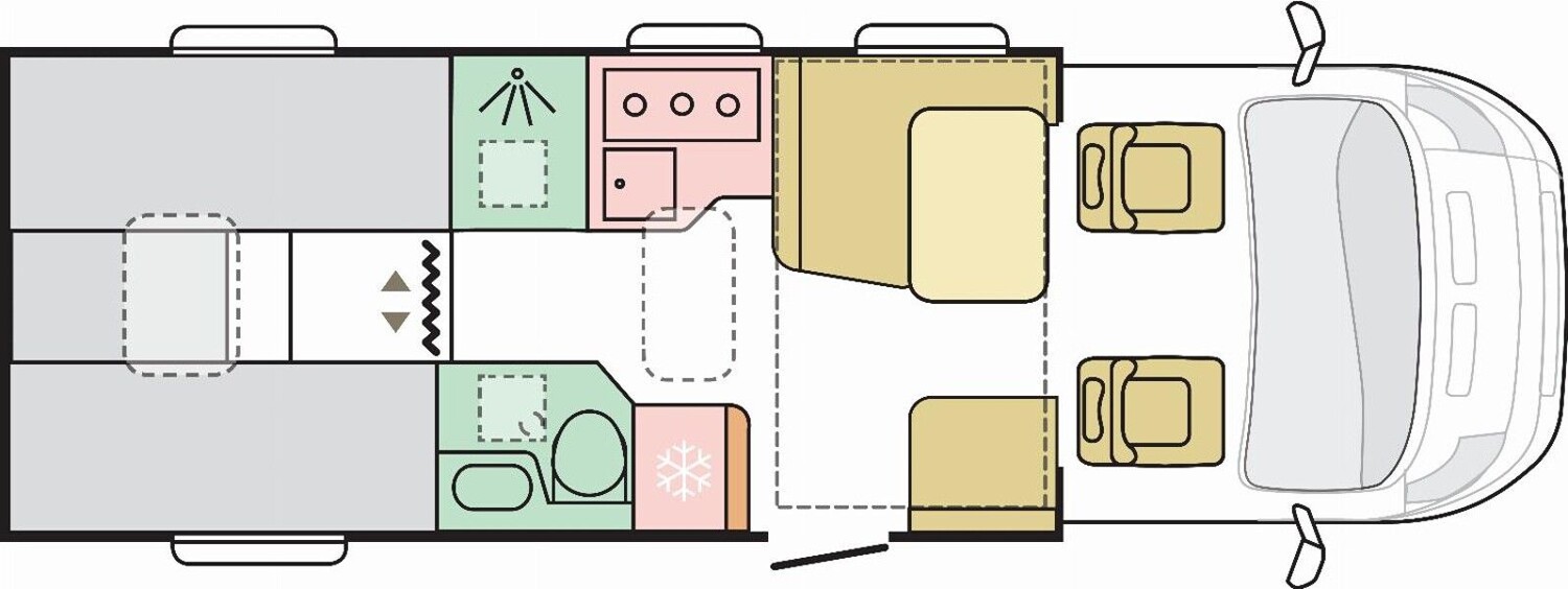 - Einzelbetten im Heck inkl. Bettverbreiterung, Kleiderschränken darunter und Dachstauschränken