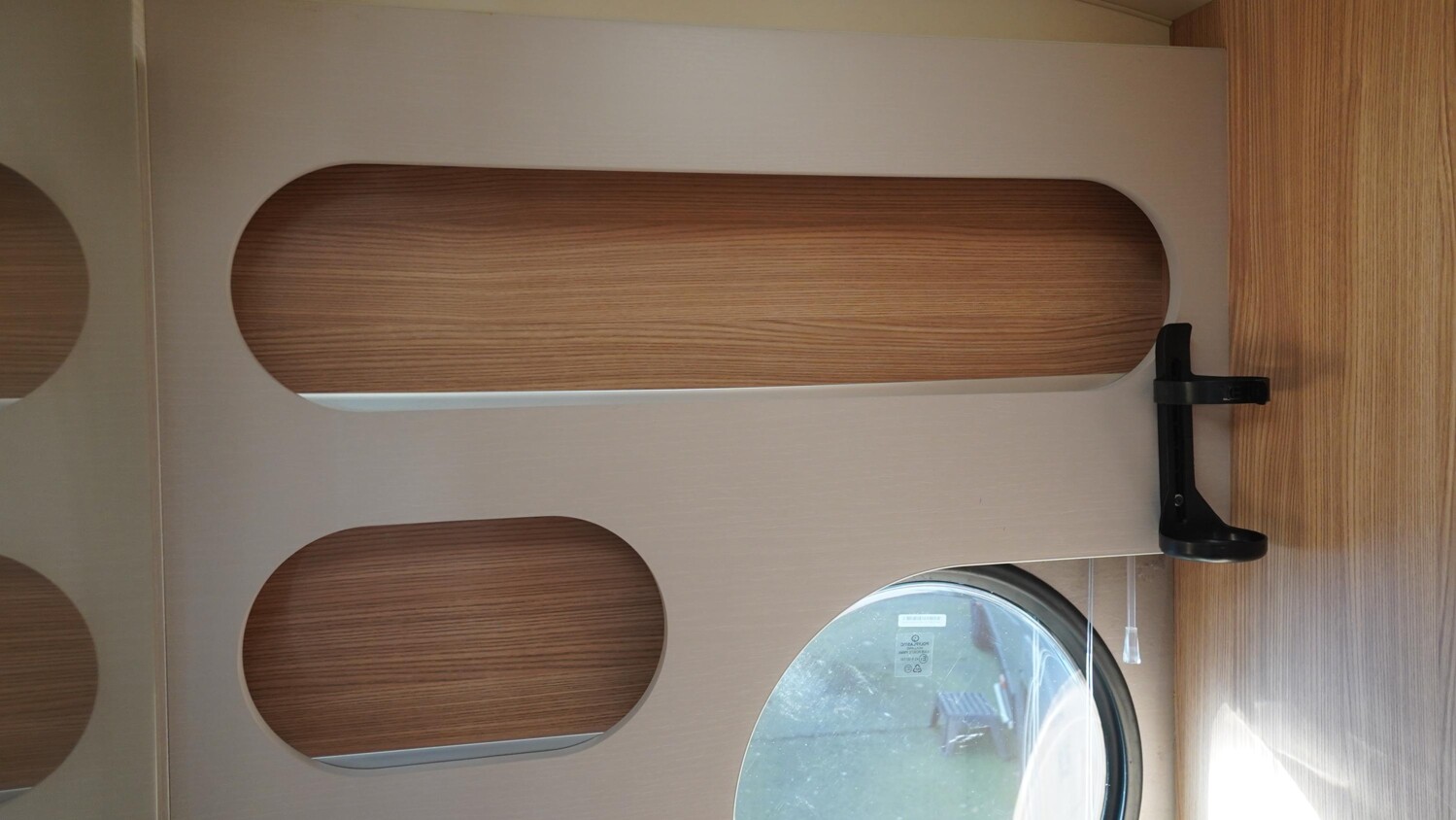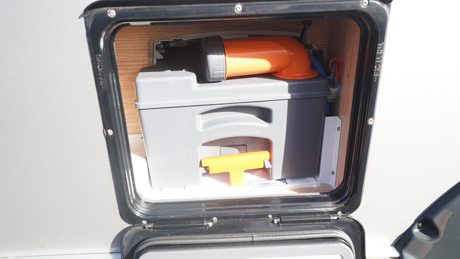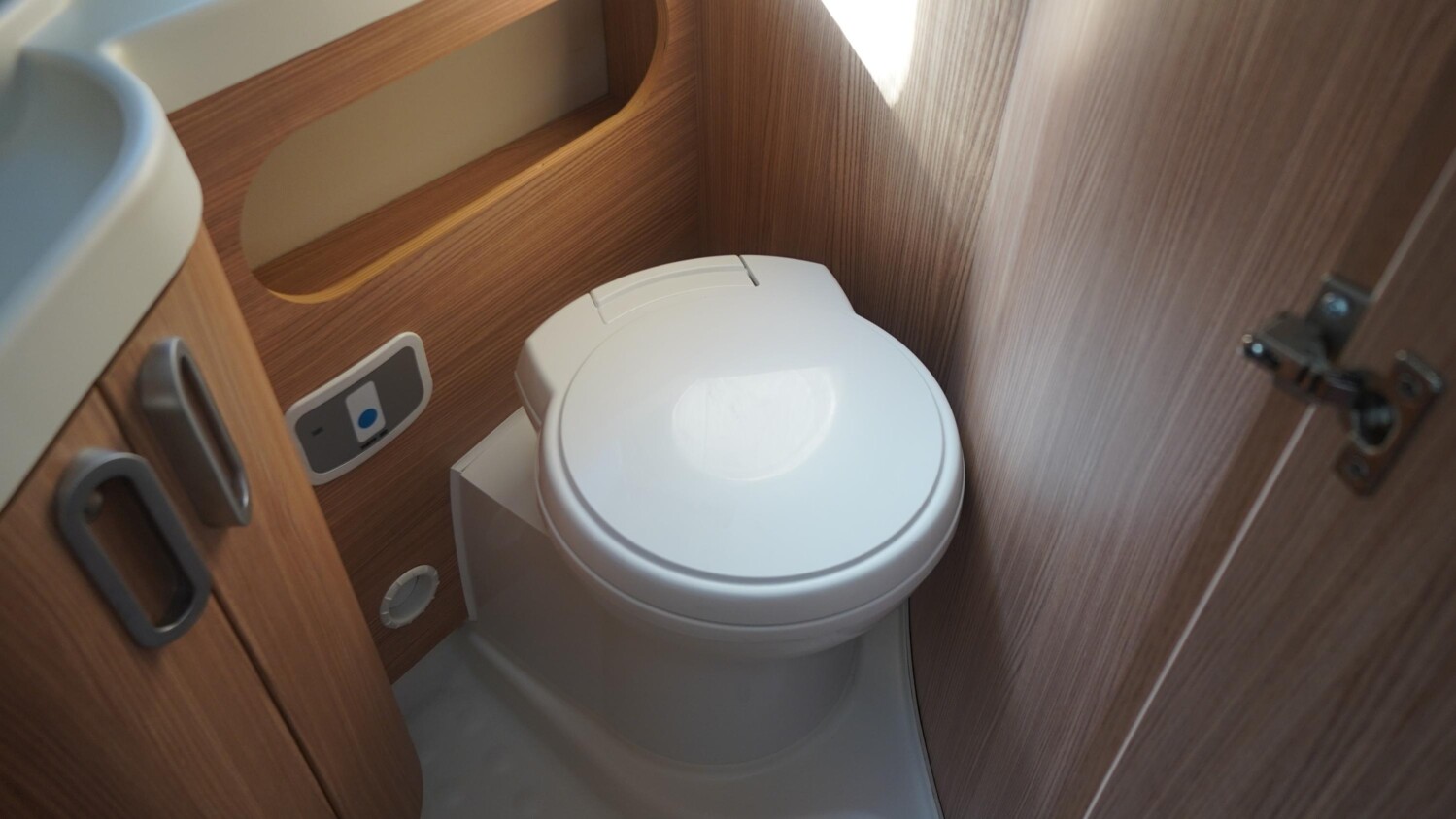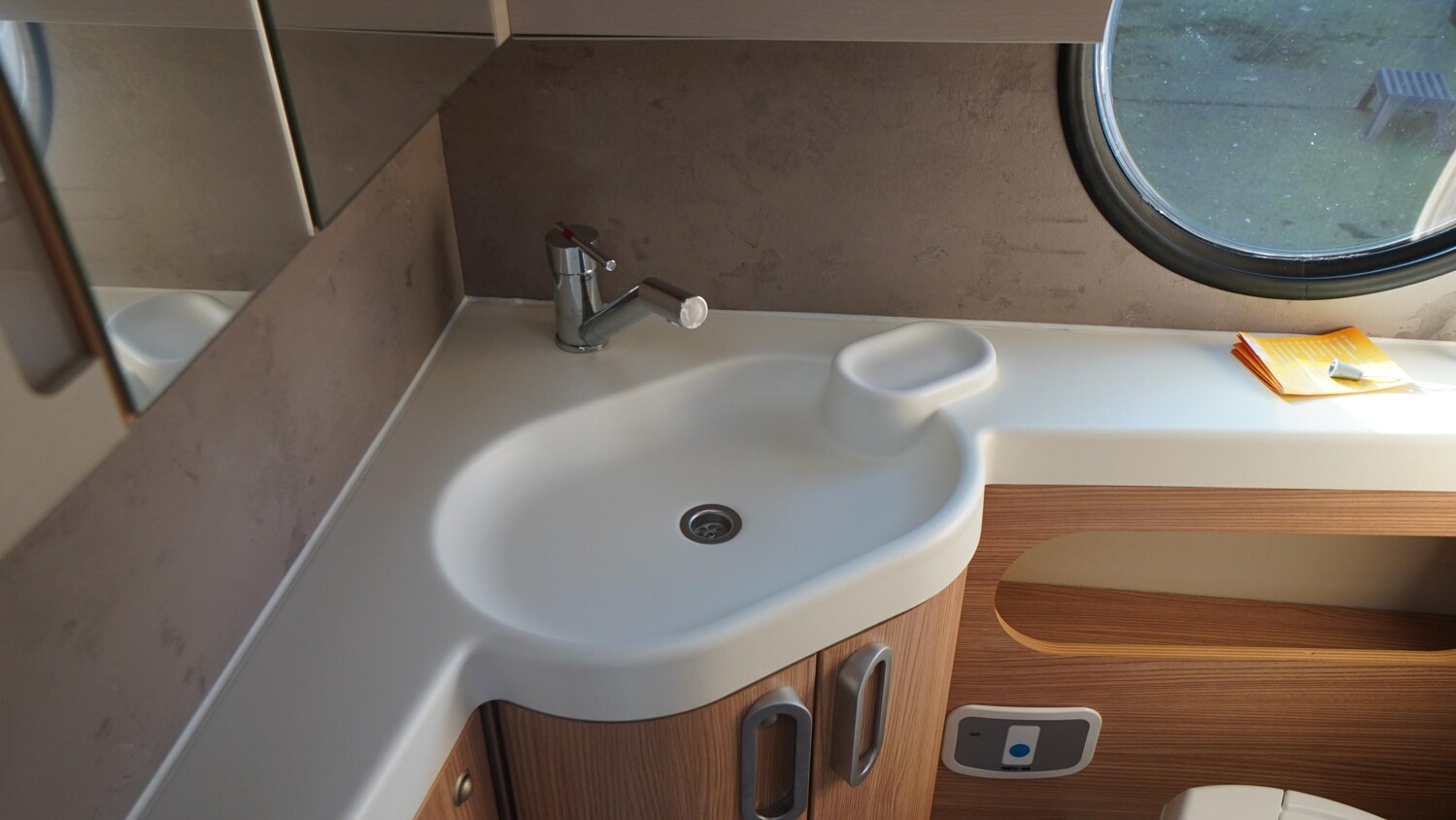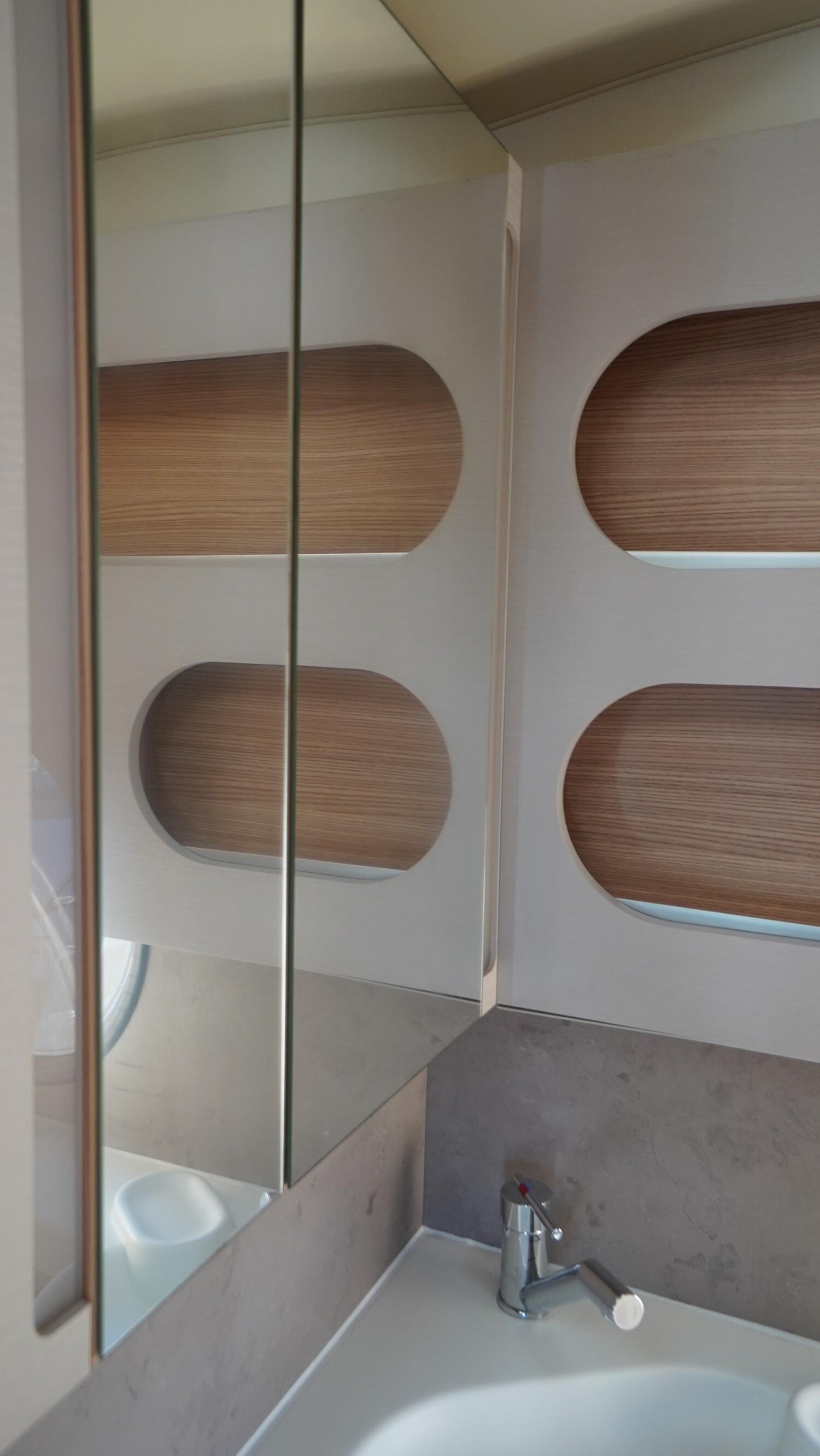 - Nasszelle mit einer Cassettentoilette von Thetford, Bullaugenfenster, Spiegel, Stauschränke und einem Waschbecken