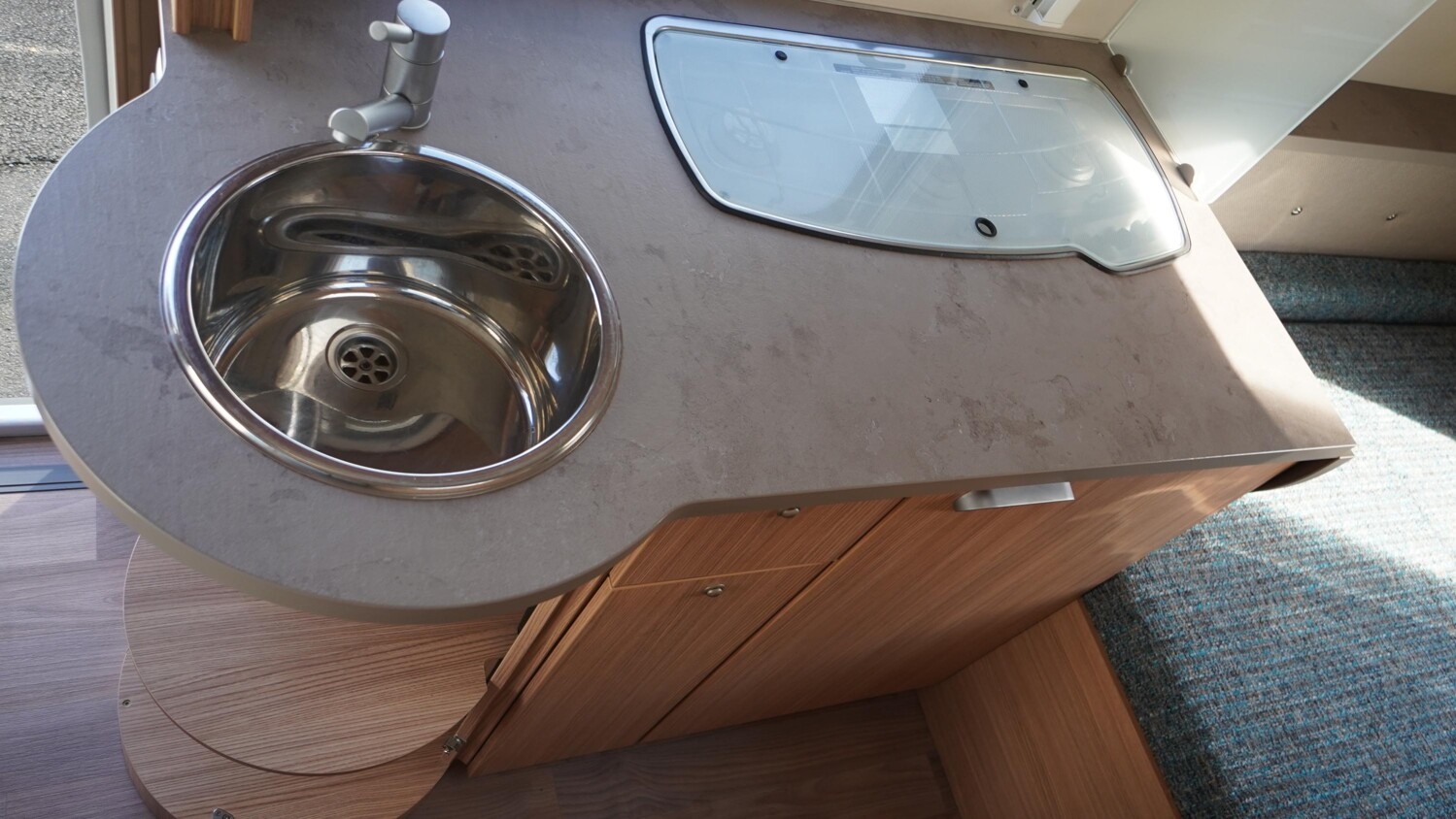 - Küchenzeile mit einem 3-Flammenkocher inkl. Glasabdeckung, Spüle, Stauschänken und einem Kühlschrank inkl. kleinem Eisfach