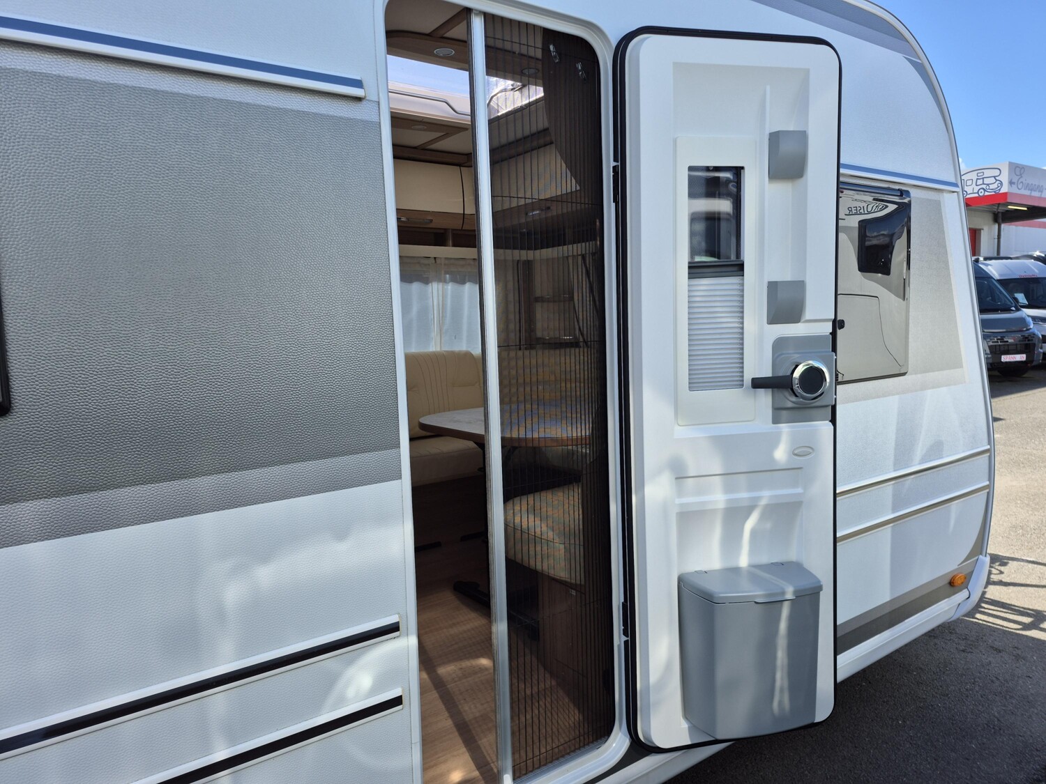 - Aufbautür mit einem Fliegenschutzgitter, einem Fenster inkl. Plissee und einem Abfalleimer