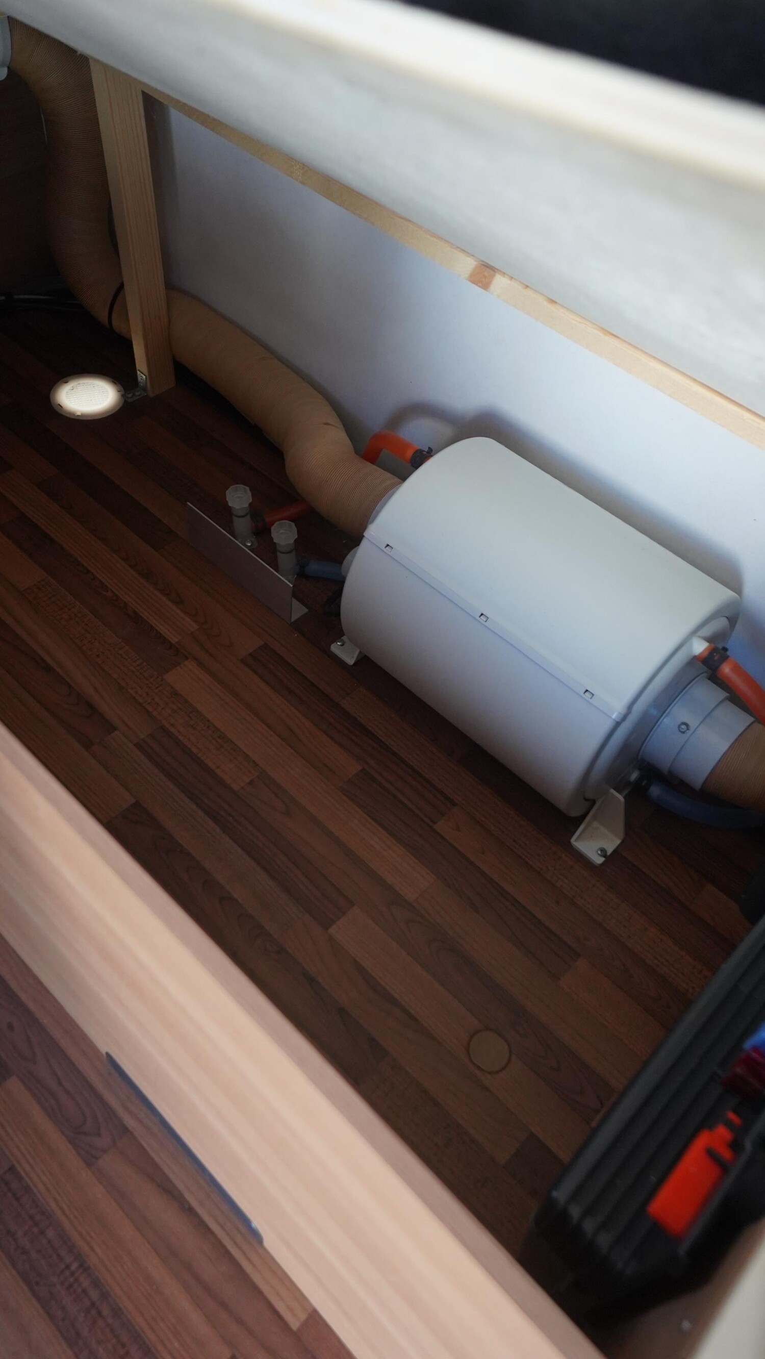 - Nasszelle mit einer Cassettentoilette von Thetford, Waschbecken, Duschwanne, Spiegel und Stauschränken