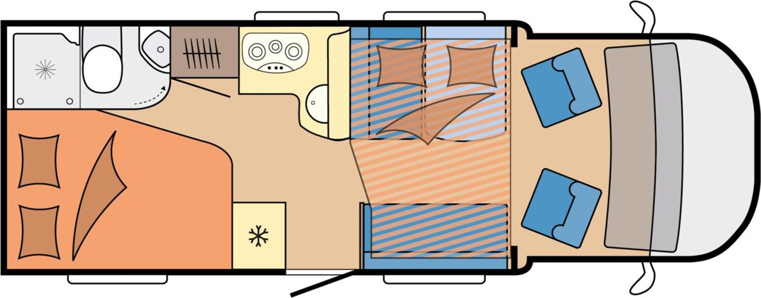 - Französisches Bett mit Leselampen, zugriff auf die Heckgarage und Stauschränken über dem Bett