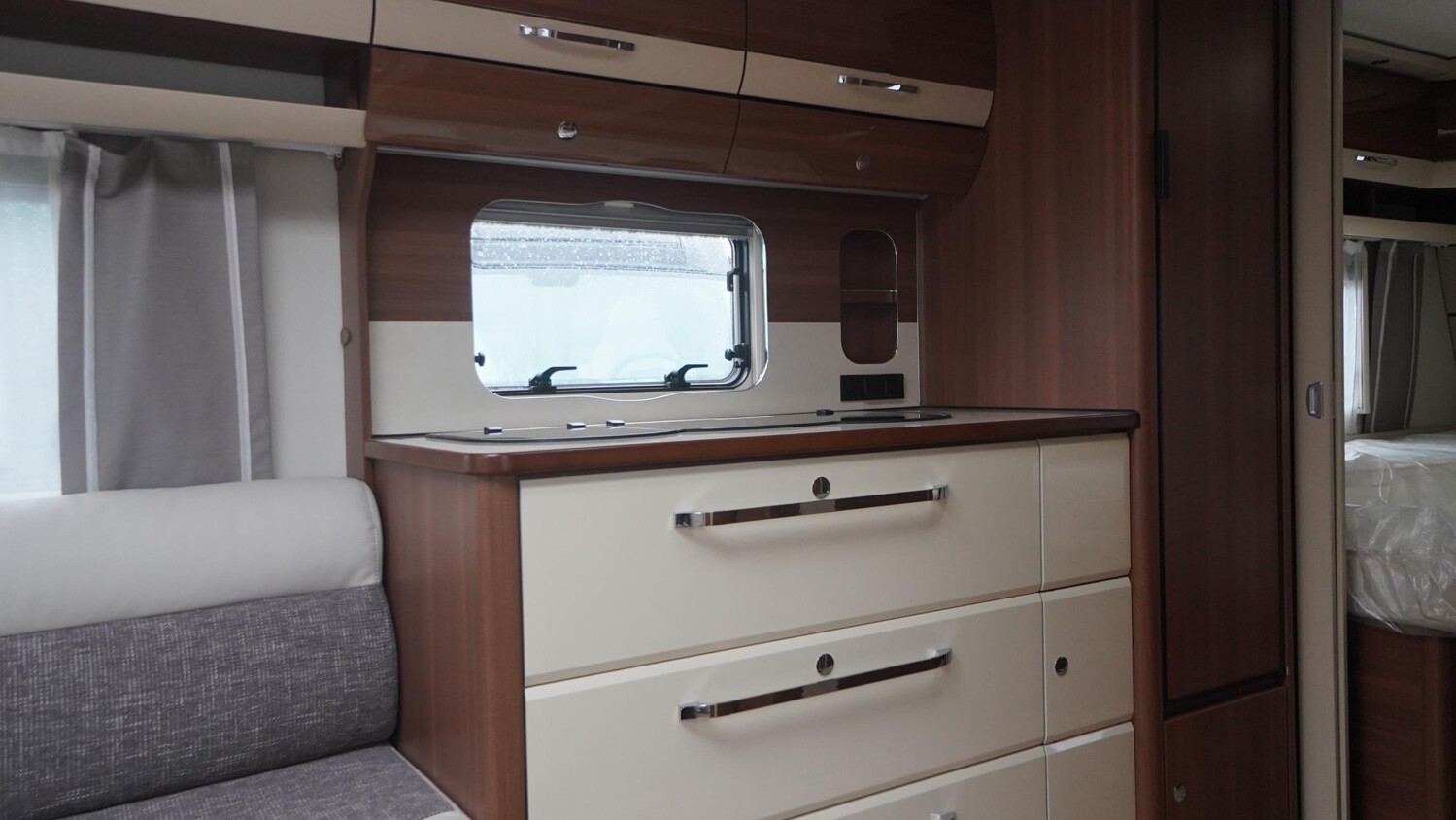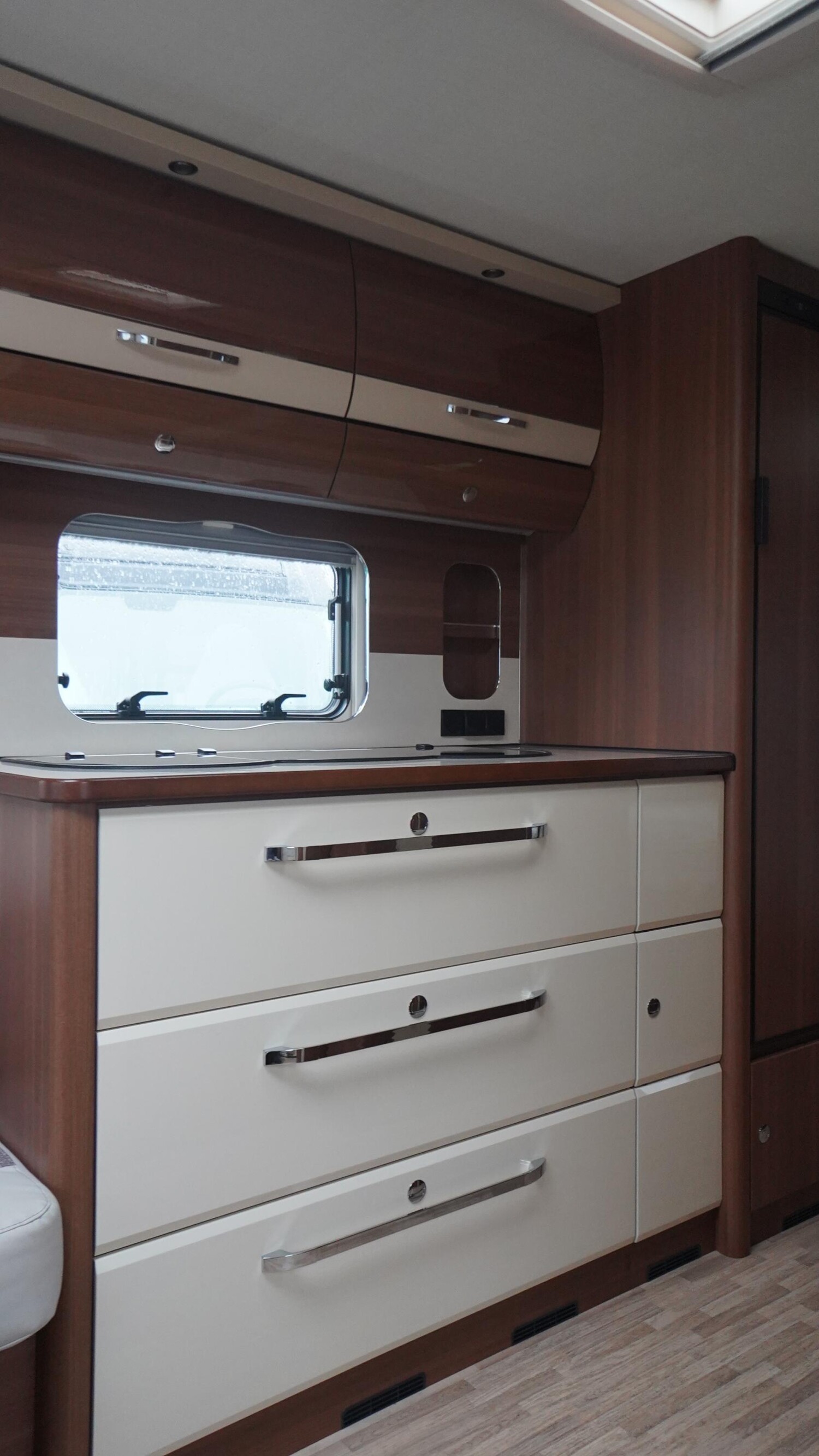 - Küchenzeile mit 3-Flammenkocher, Spülbecken, Steckdosen und umliegenden Dachstauschränken