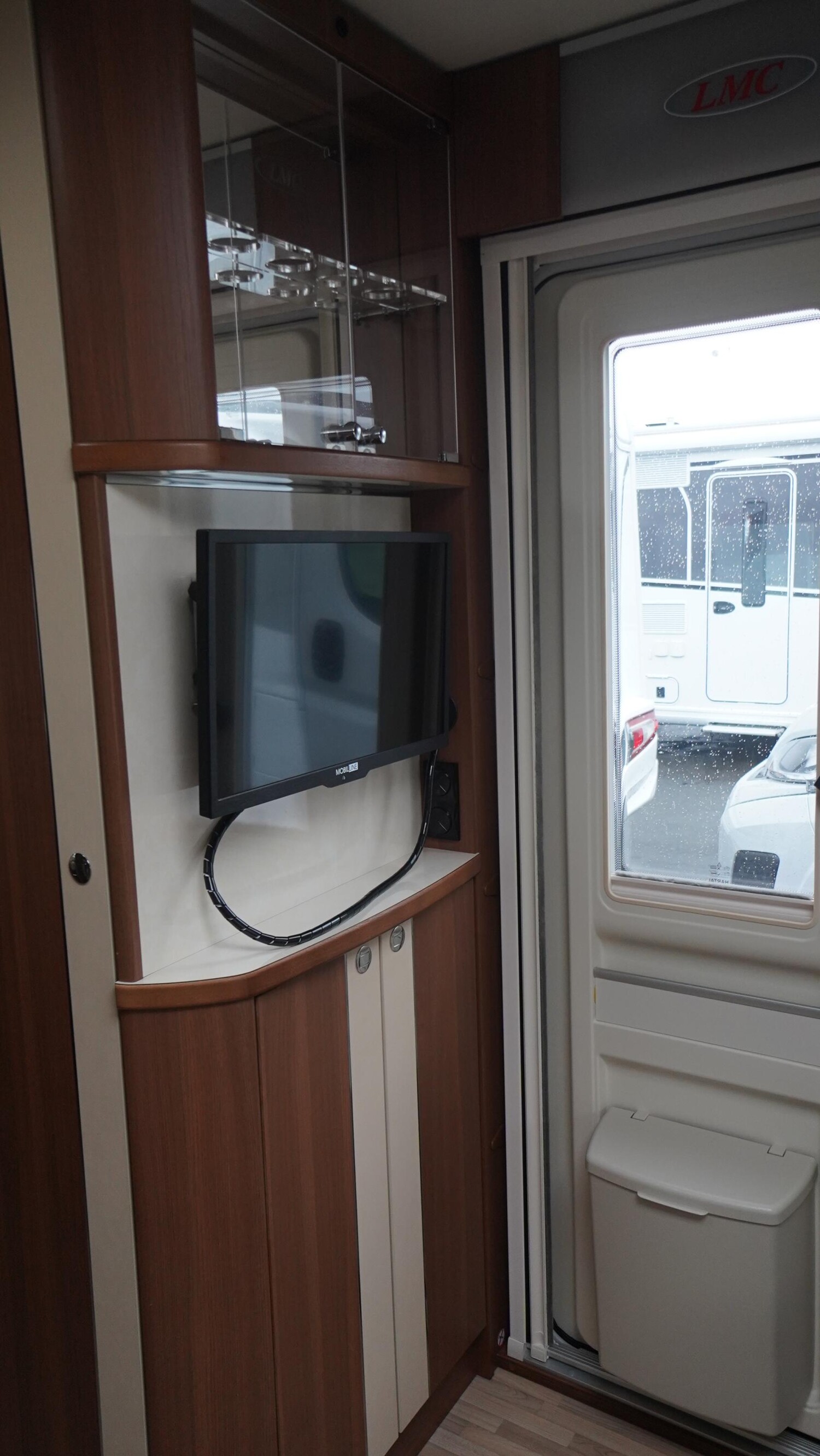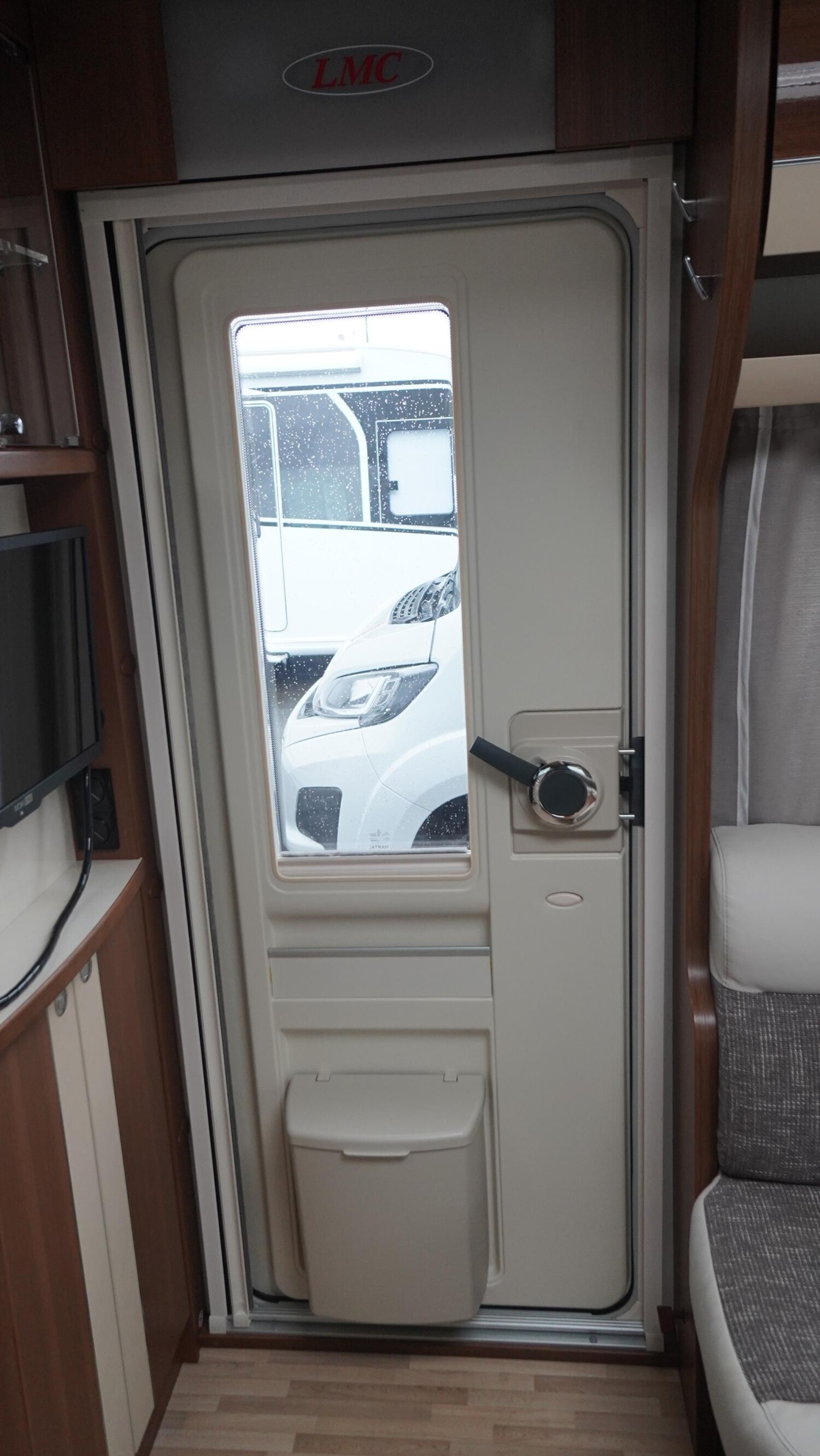 - Eingangstür mit einem Fenster inkl. einem Verdunklungsplissee und Mülleimer