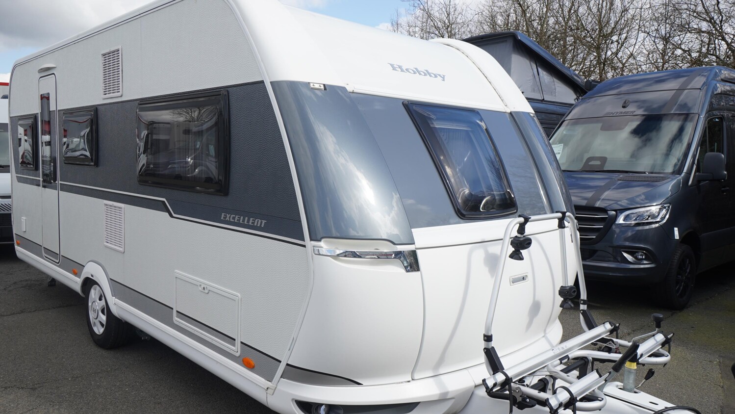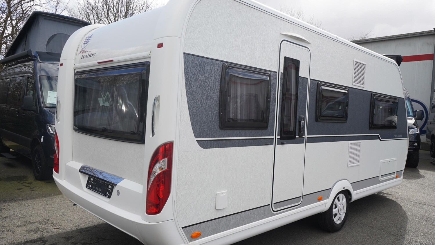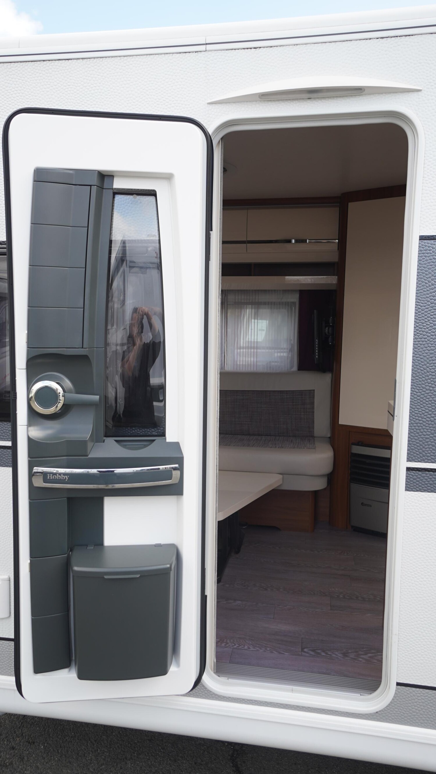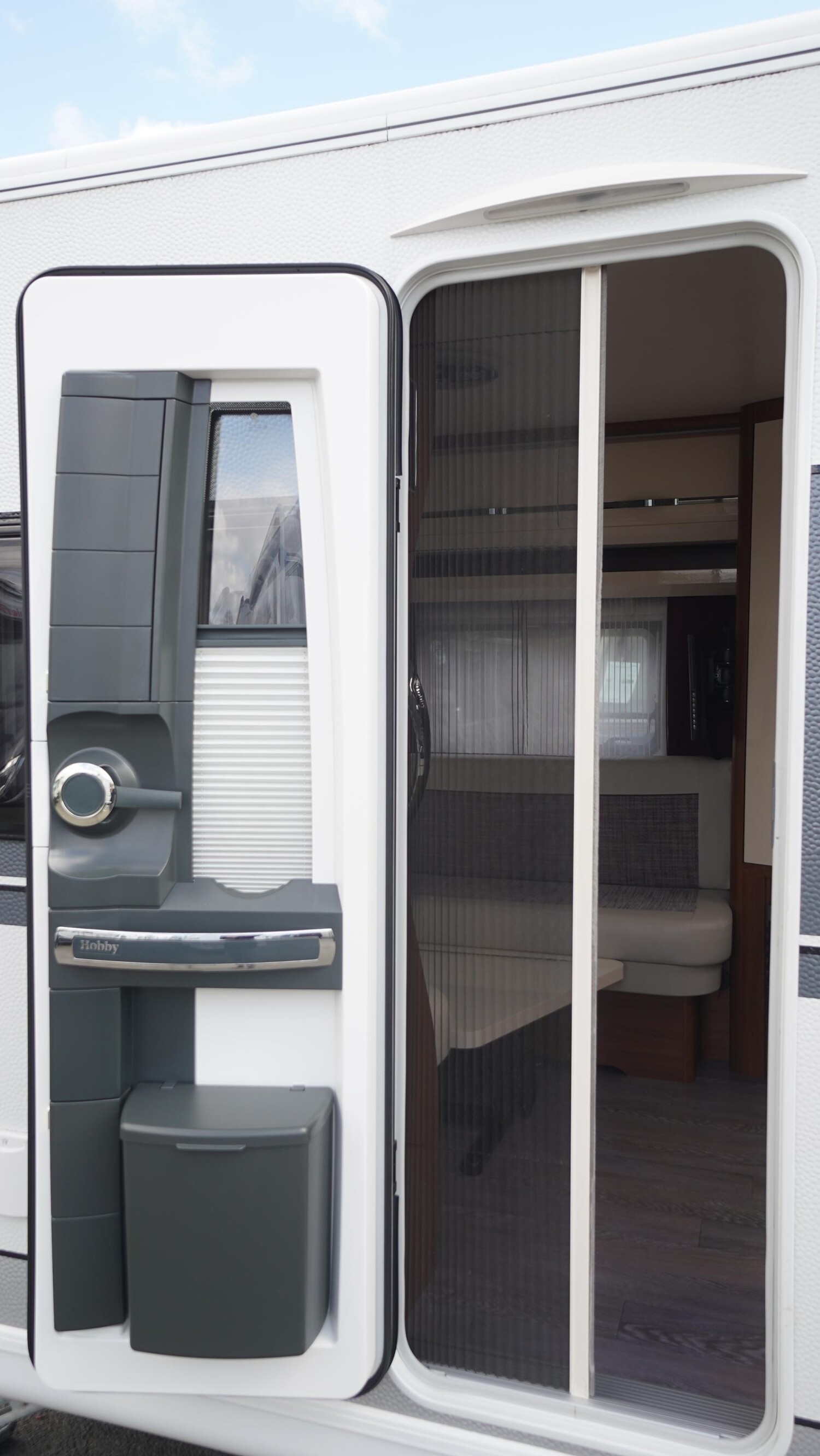 - Eingangstür mit Abfalleimer, Fenster inkl. Verdunkelungsplissee, Vorzeltleuchte und Fliegenschutztür