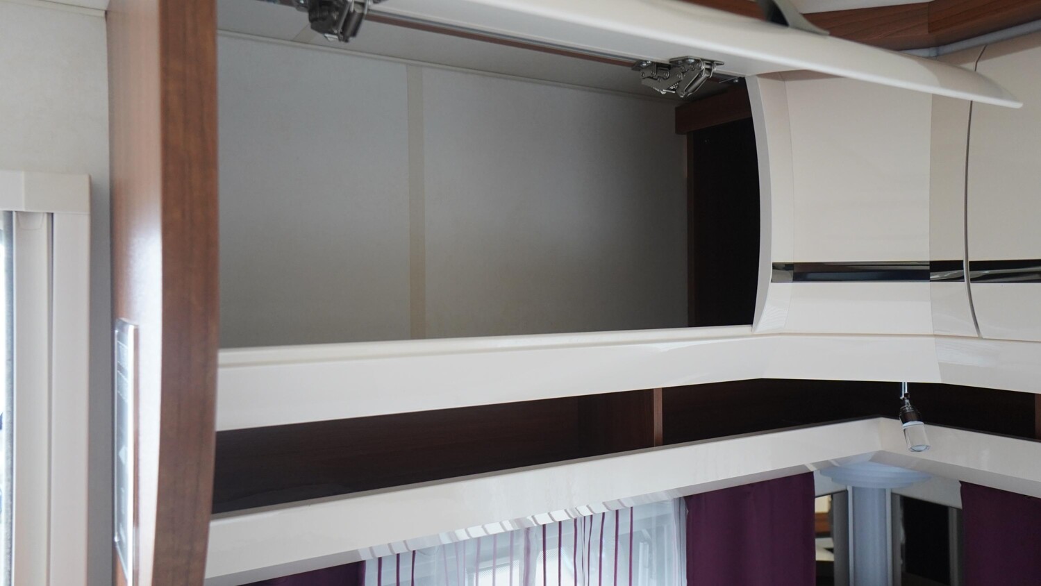 - Einzelbetten im Heck mit Stauraum darunter, Leselampen, Utensilienfächern und umliegenden Dachstauschränken