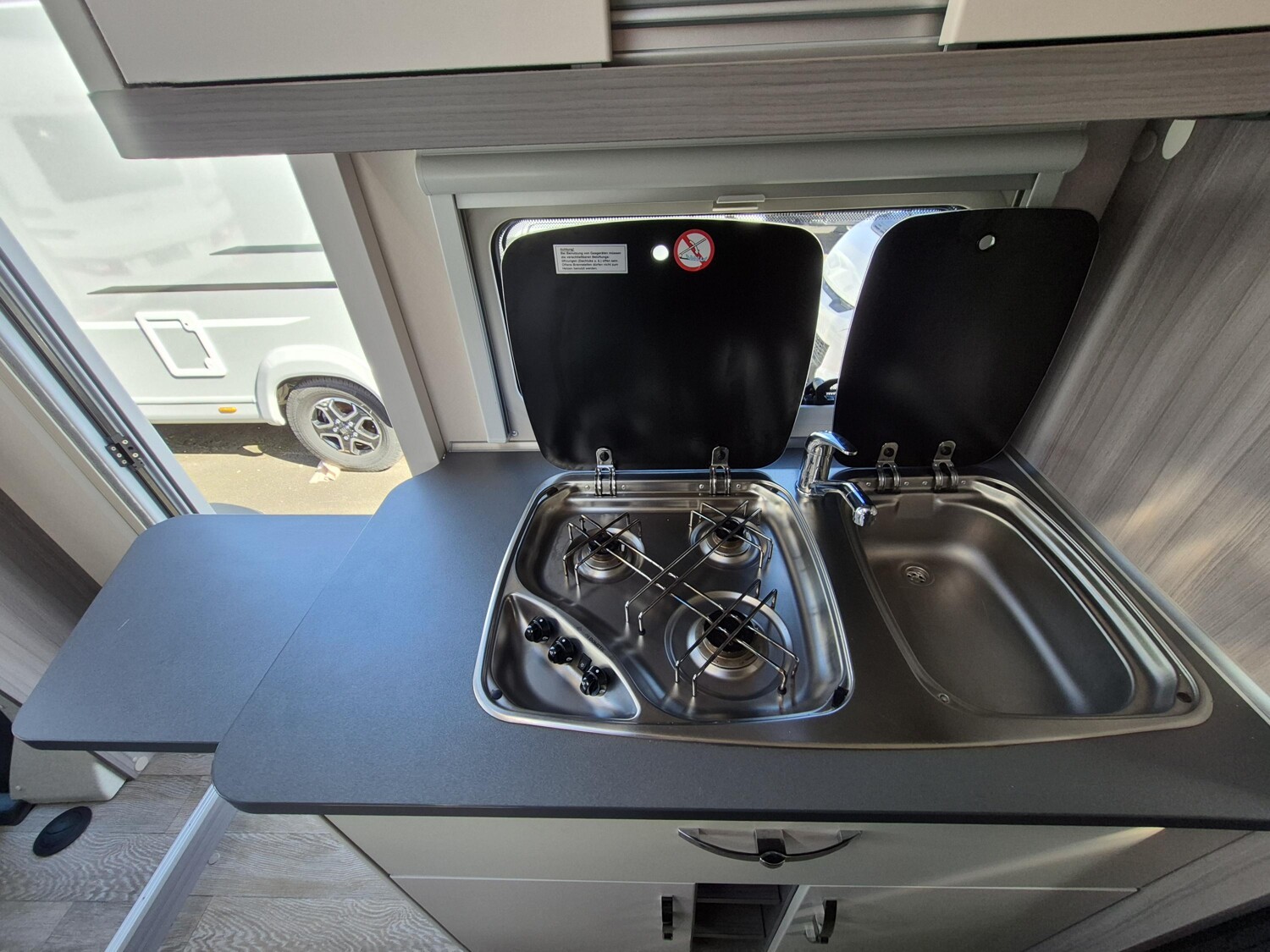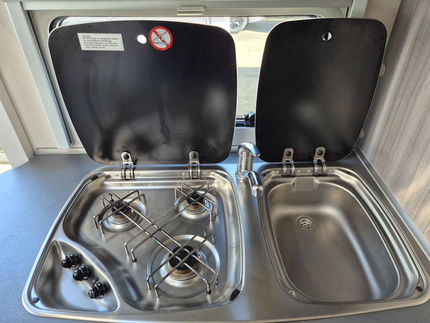 - Küchenzeile mit einem 3-Flammenkocher, einer Arbeitsflächenerweiterung, Stauschränke und Staufächern und einem Kühlschrank inkl. Eisfach