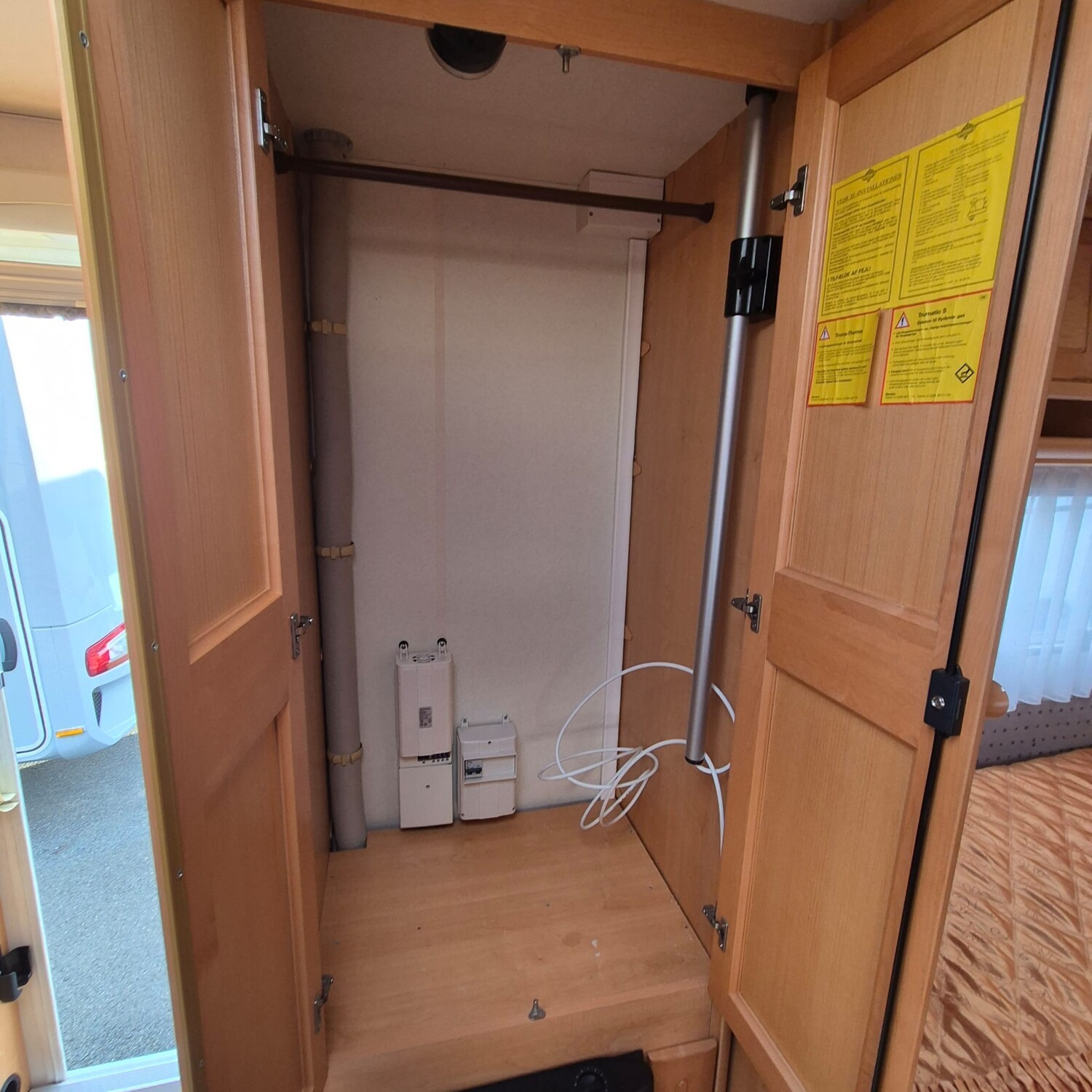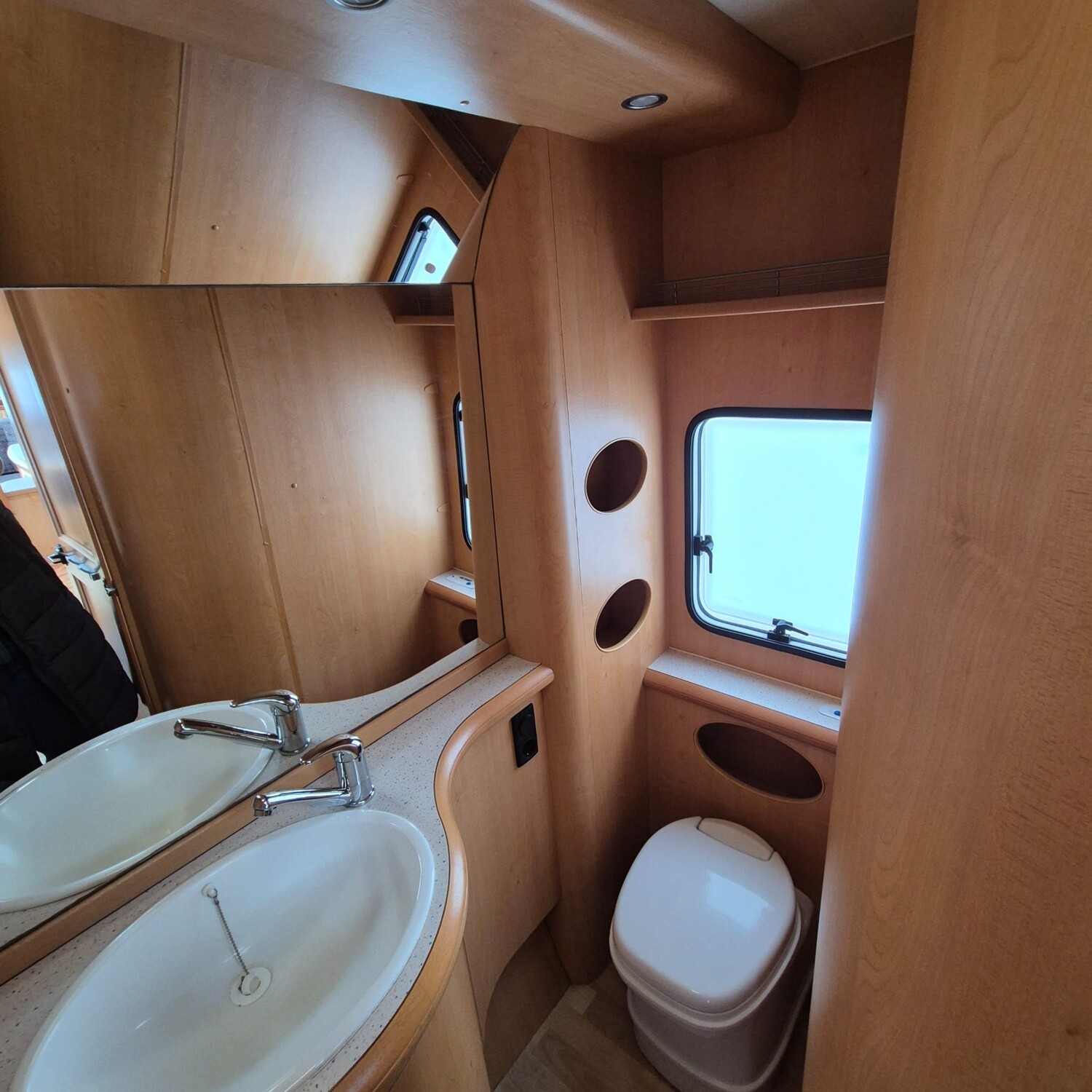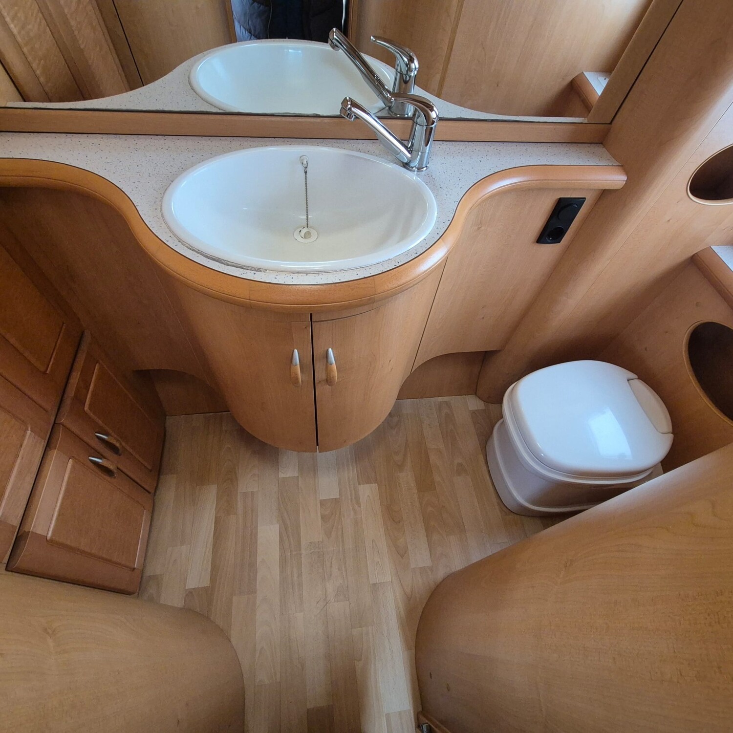 - Heckbad mit einer Thetford Toilette, einem Waschbecken, einem großem Spiegel, einem Seitenfenster und einem großen Eckschrank