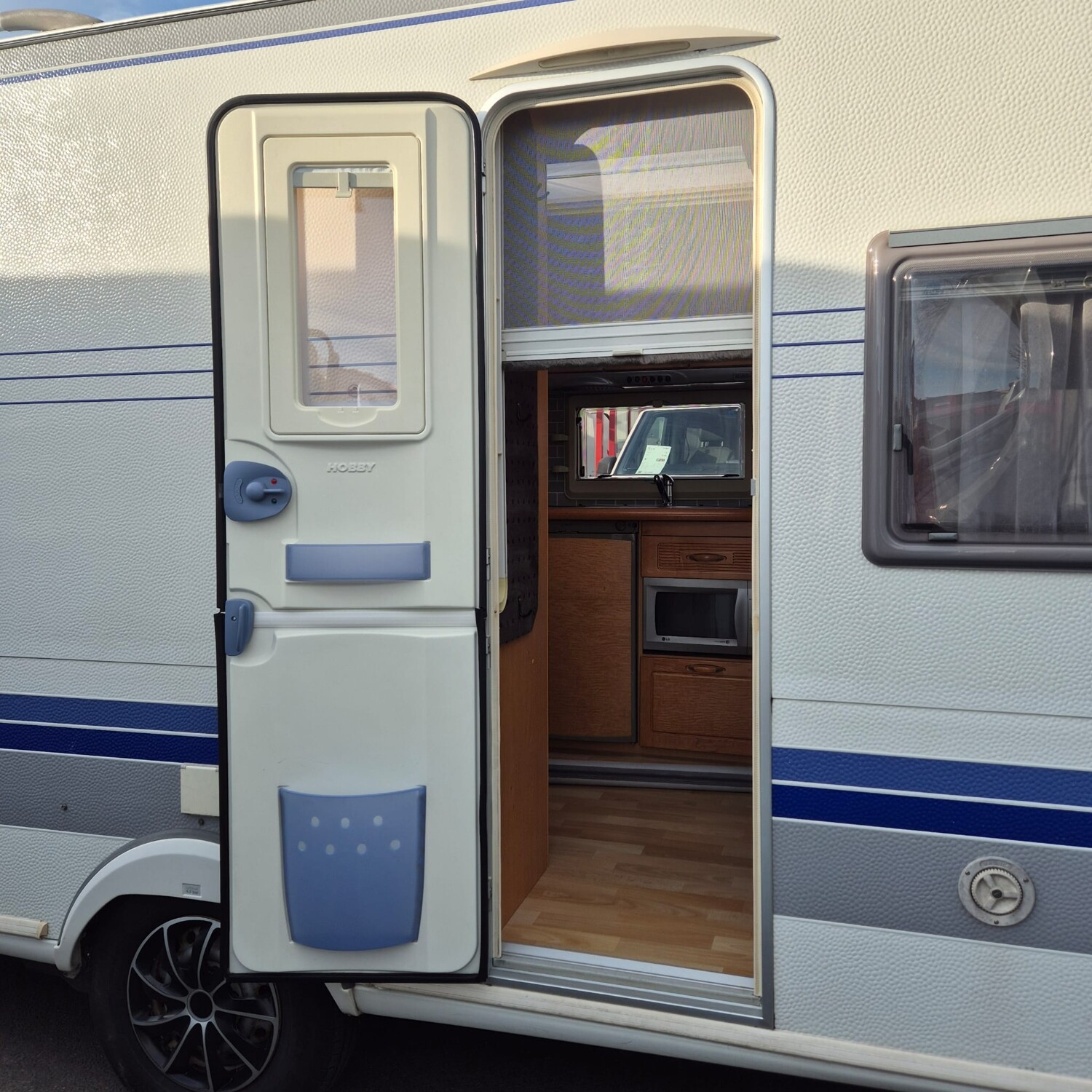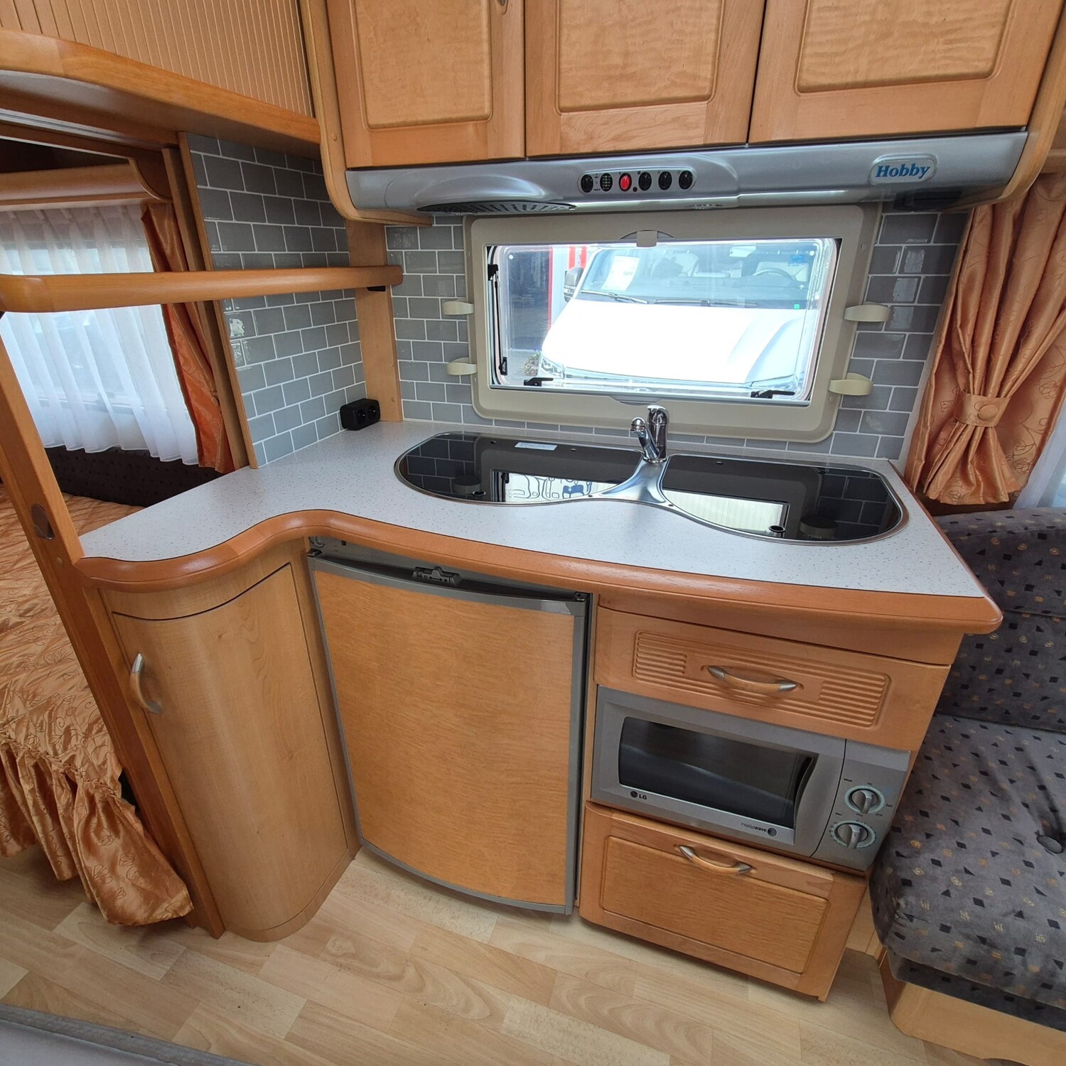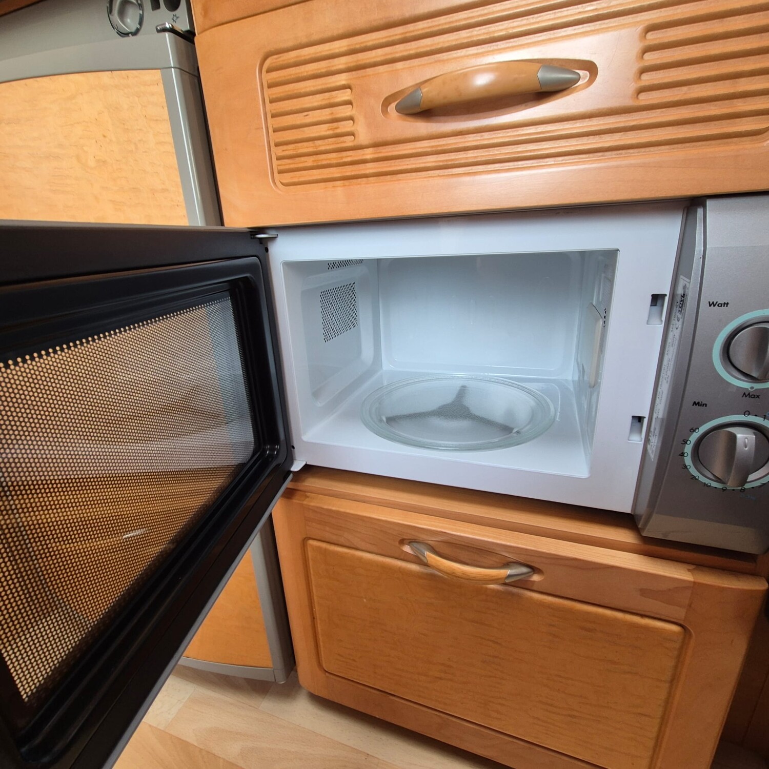 - Küchenzeile mit einem 3 Flammenkocher und einer Spüle mit Glasabdeckung, einer Mikrowelle, Stauschränken, einer Schublade und einem Dometic Kühlschrank mit einem kleinen Eisfach