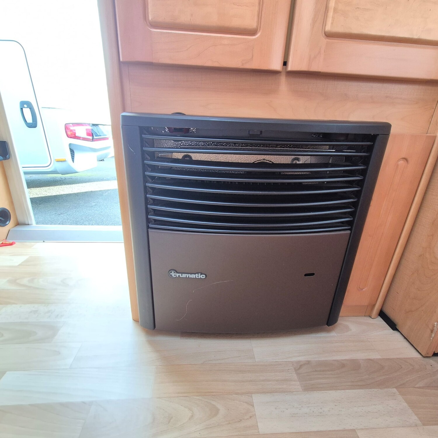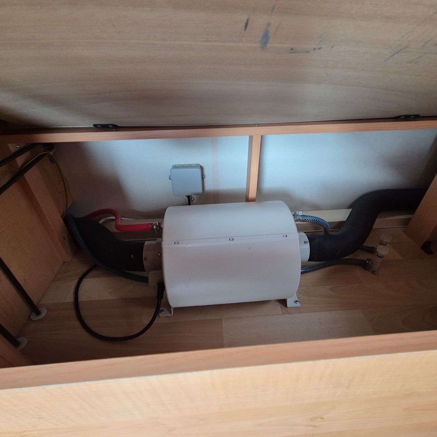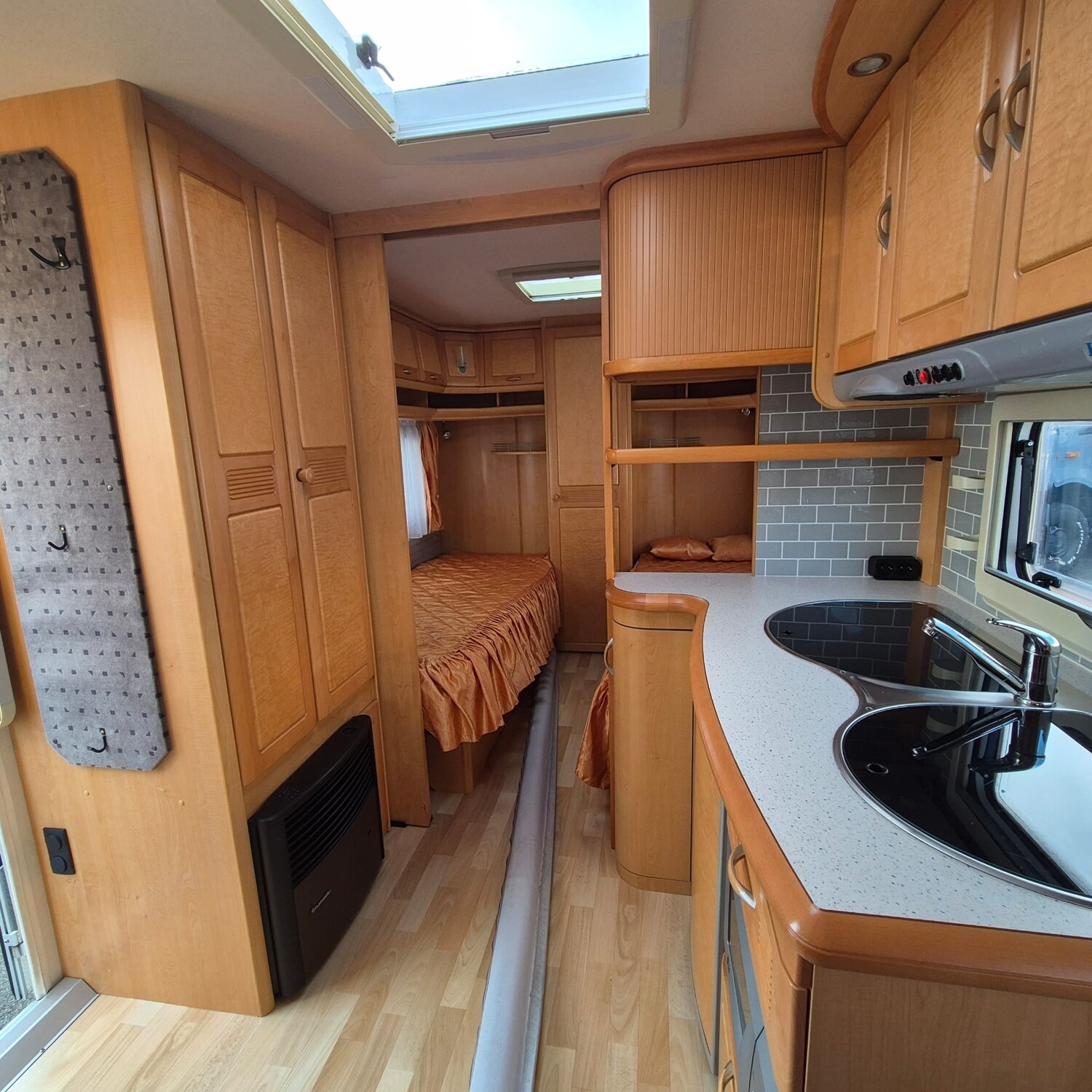 - Küchenzeile mit einem 3 Flammenkocher und einer Spüle mit Glasabdeckung, einer Mikrowelle, Stauschränken, einer Schublade und einem Dometic Kühlschrank mit einem kleinen Eisfach
