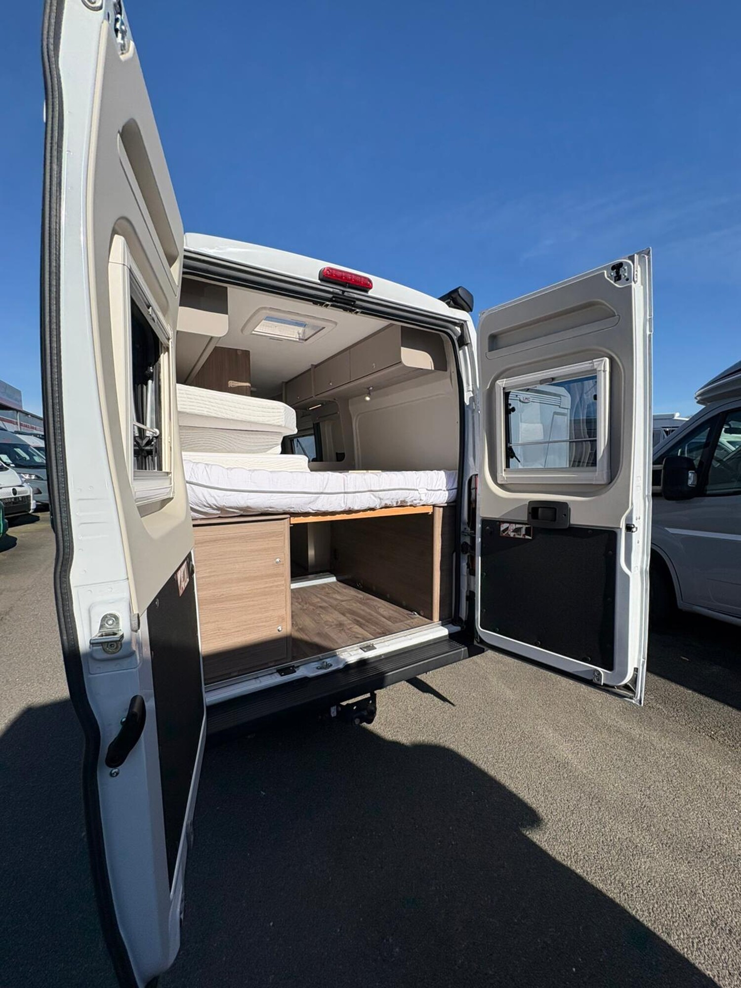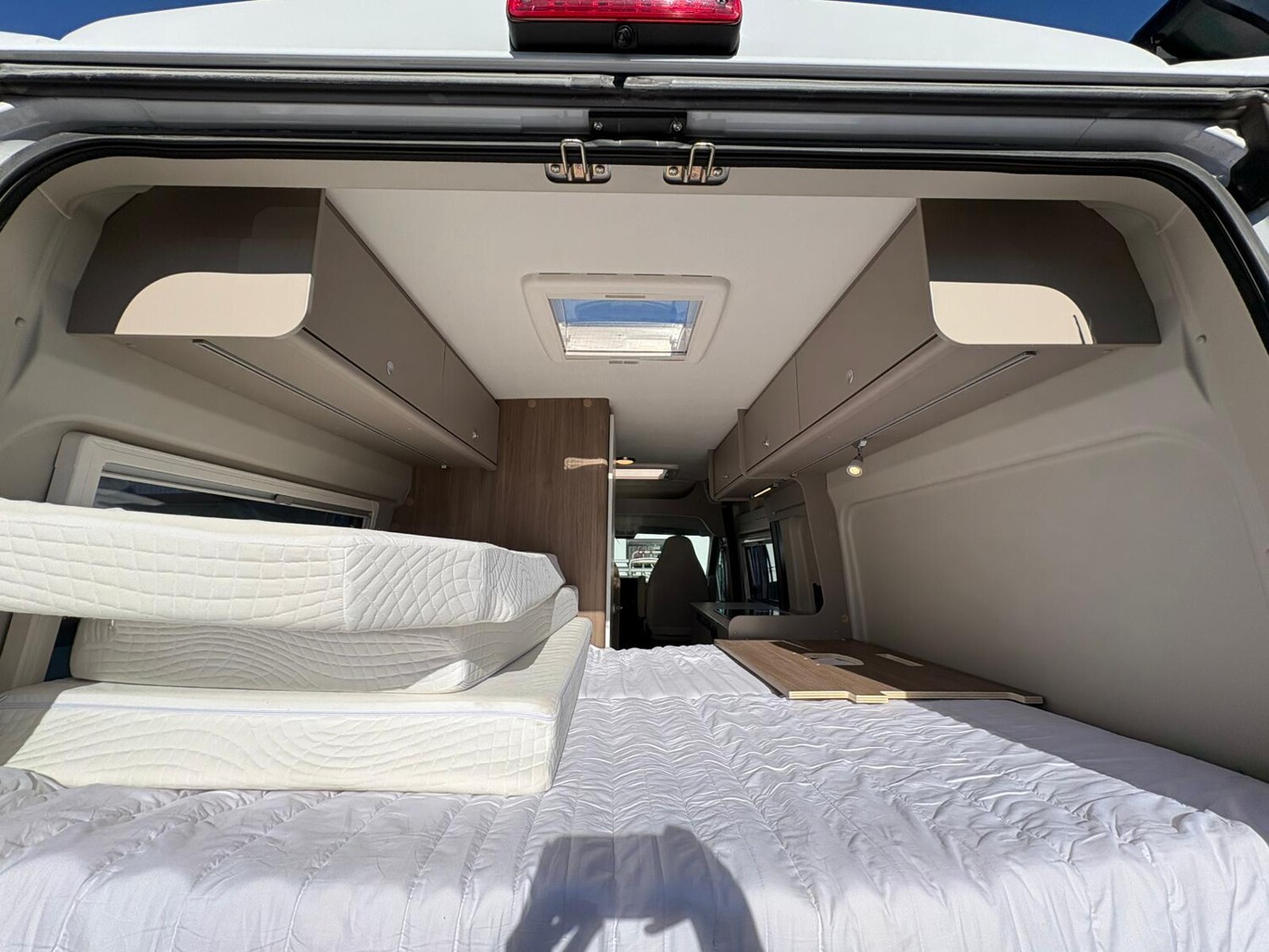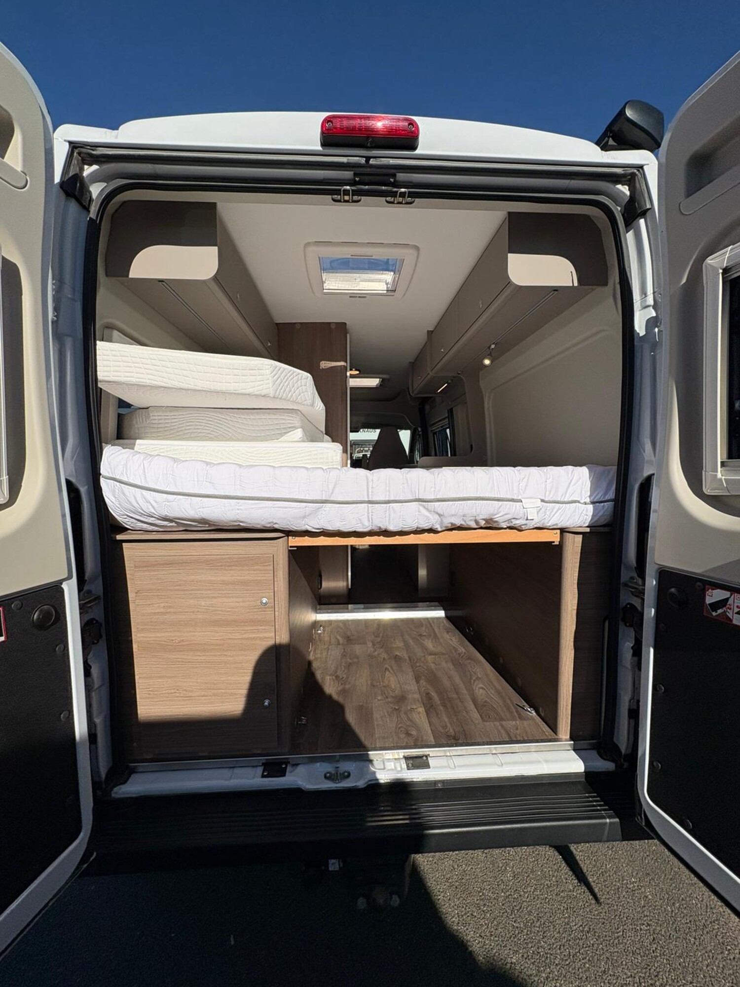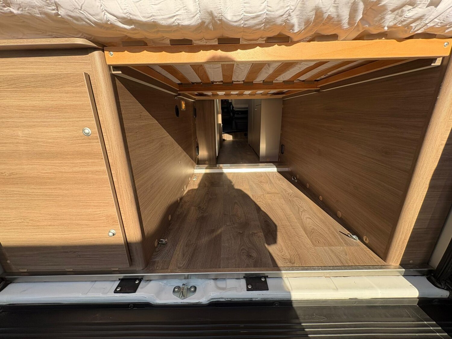 - Doppelbett im Heck mit Staufläche darunter, Leselampen, umliegenden Stauschränken
