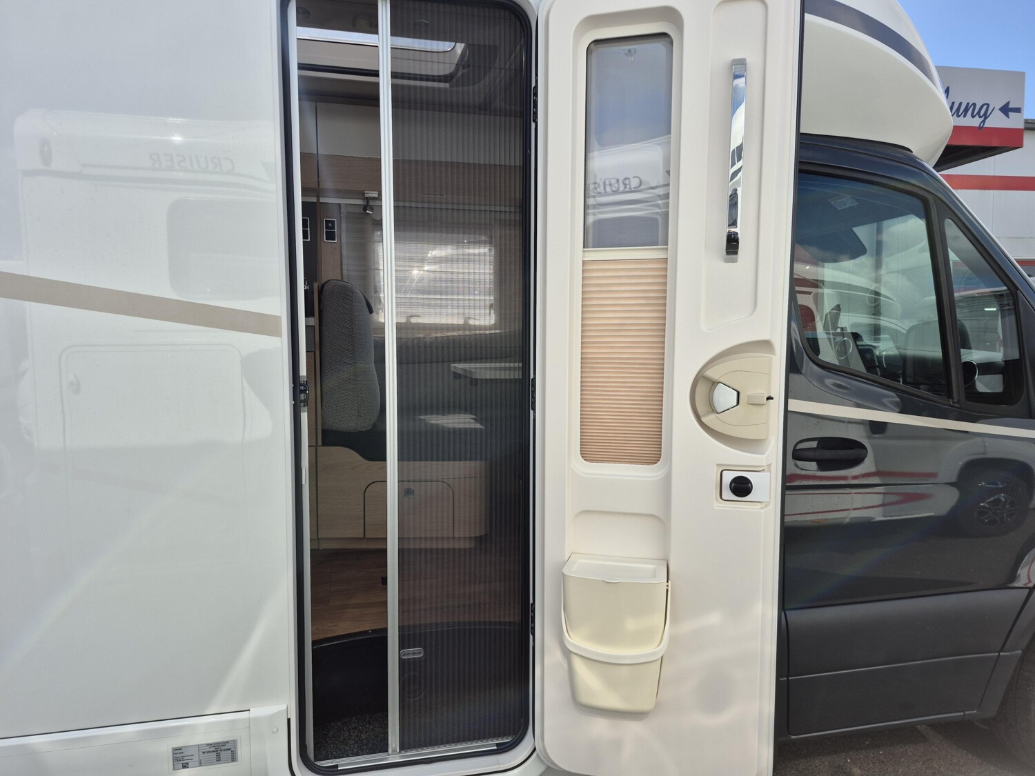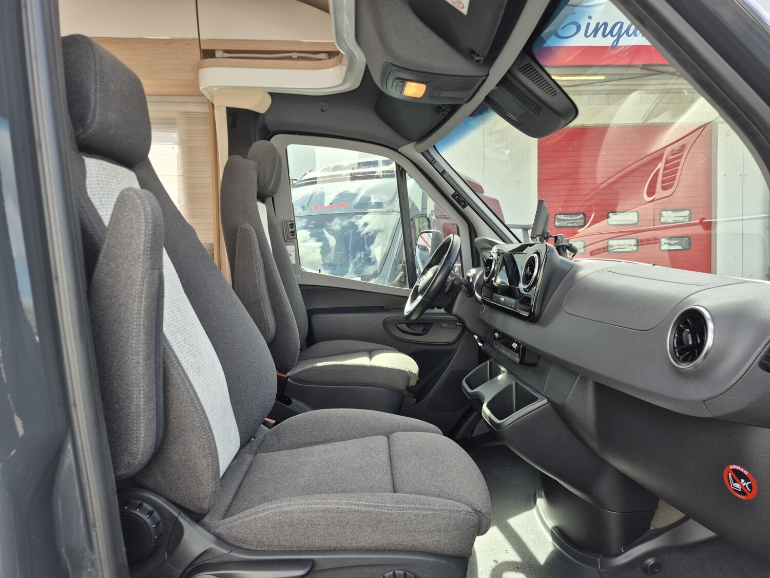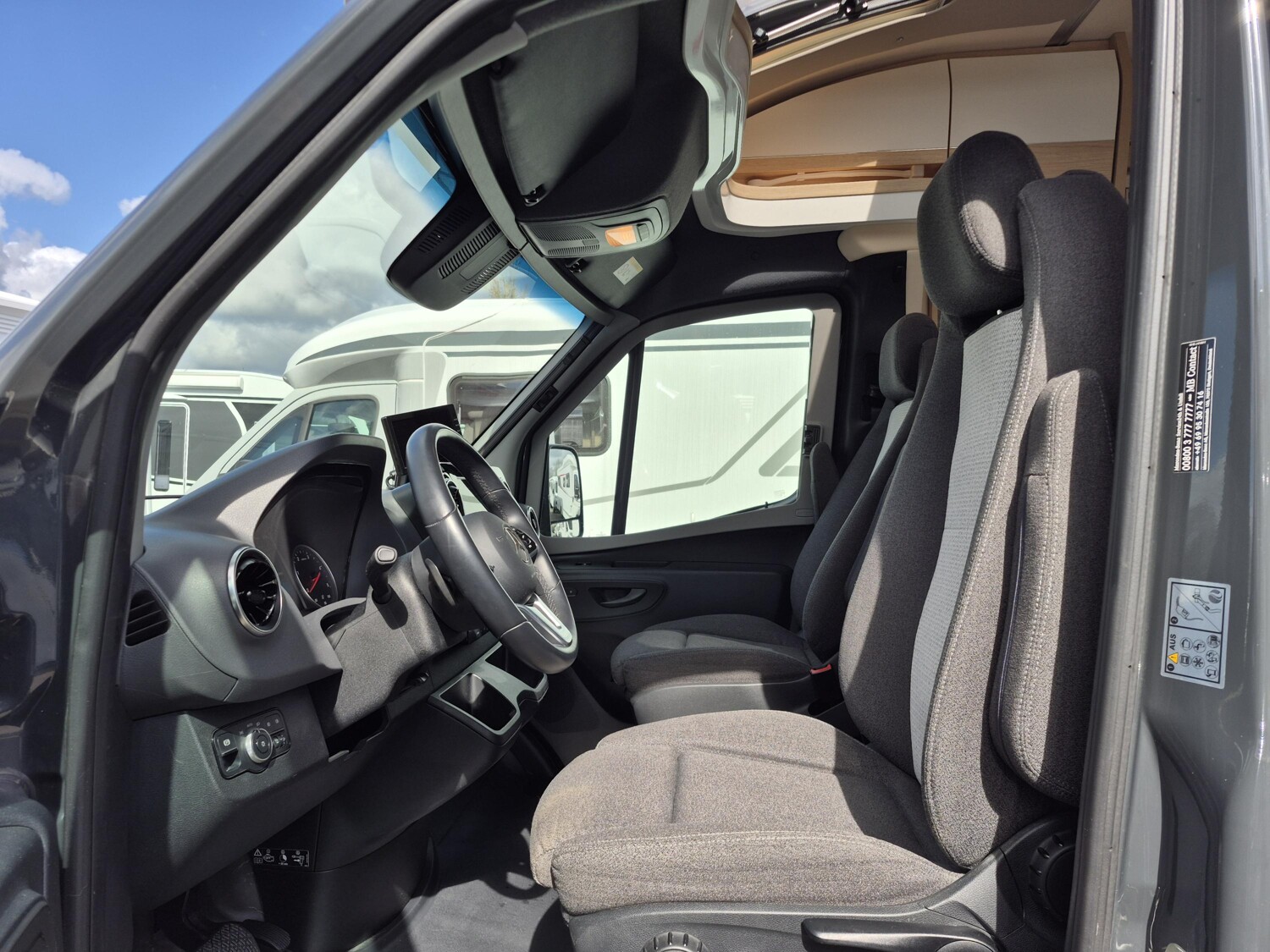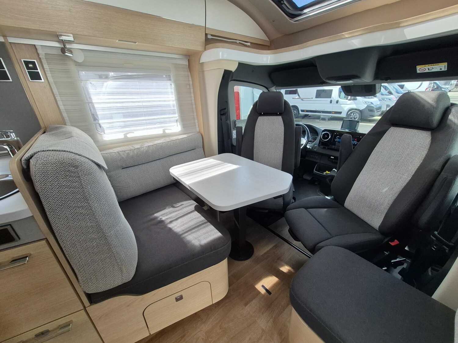 - Komfort Plus-Paket (Fliegenschutzrollo an der Eingangstür, Panoramadach über Fahrerhaus, manuell ausstellbar, Fenster mit Verdunkelungsrollo und integriertem Mülleimer in Eingangstür , Faltverdunkelung für Fahrerhaus, Schublade und Einlegewanne für Kopfstützen in der Sitzgruppe)