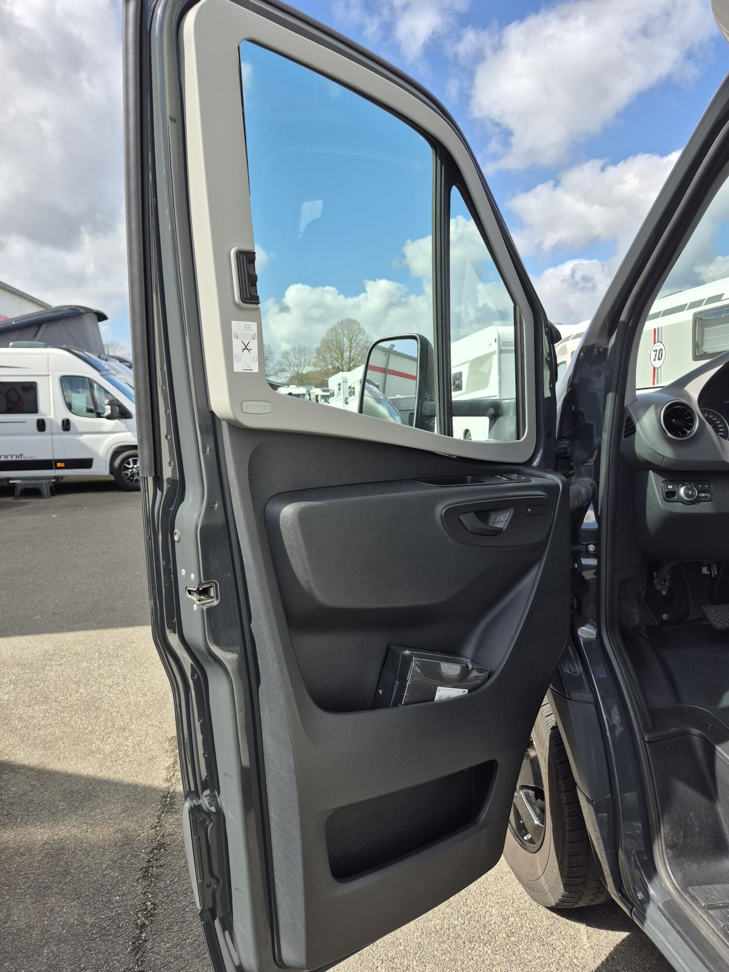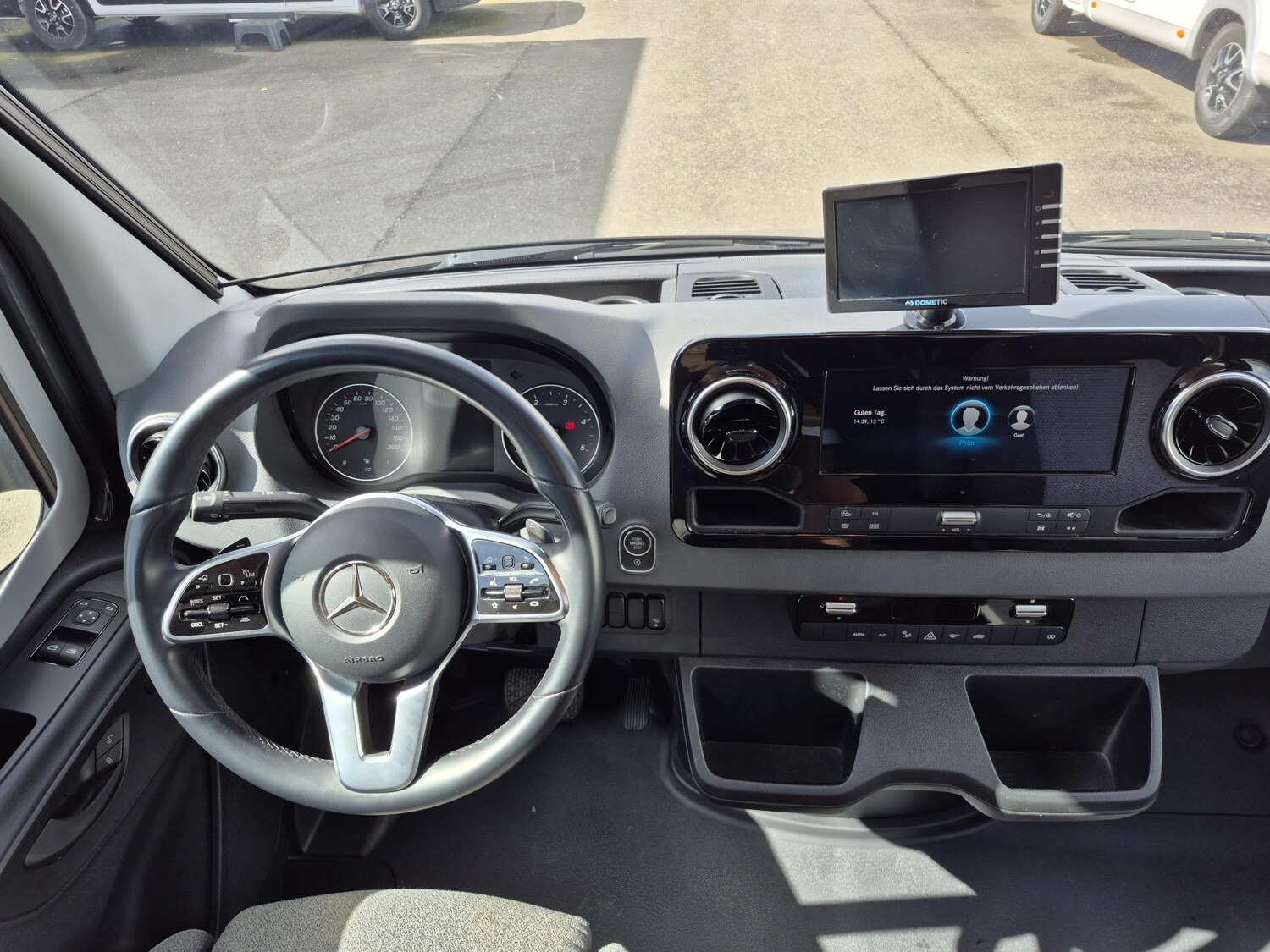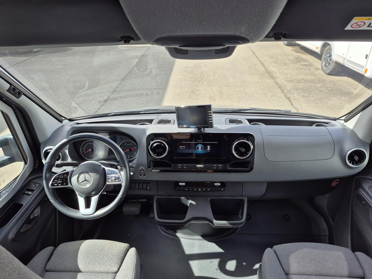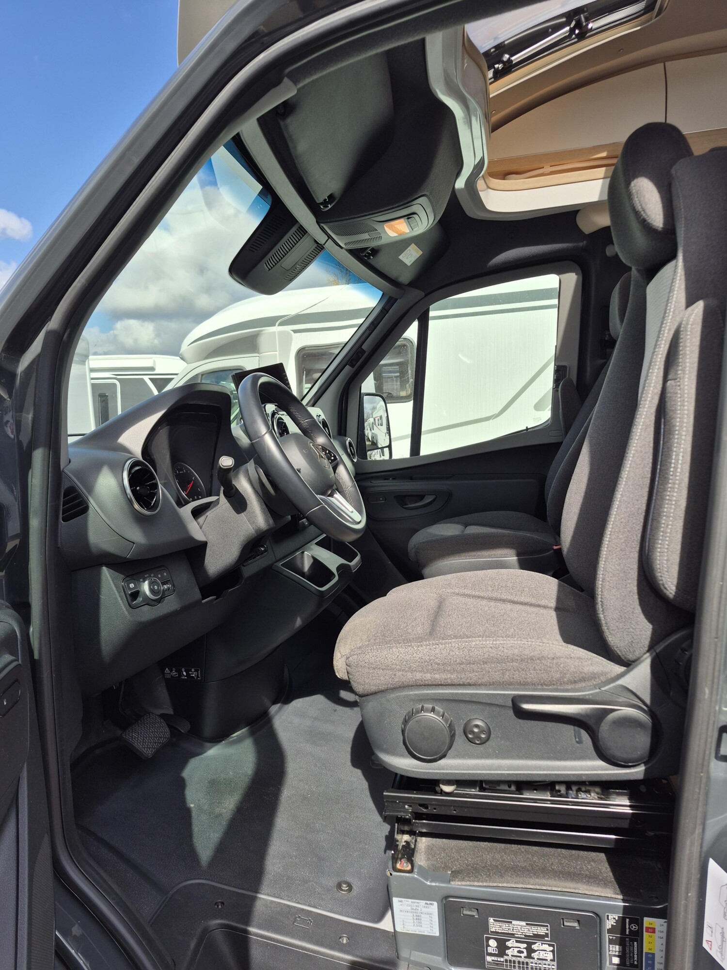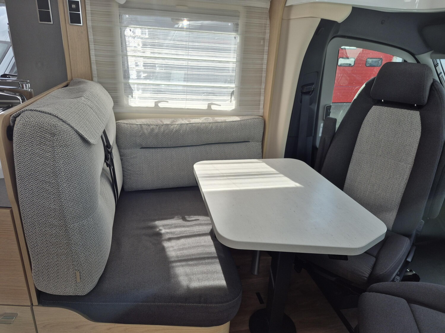 - Komfort Plus-Paket (Fliegenschutzrollo an der Eingangstür, Panoramadach über Fahrerhaus, manuell ausstellbar, Fenster mit Verdunkelungsrollo und integriertem Mülleimer in Eingangstür , Faltverdunkelung für Fahrerhaus, Schublade und Einlegewanne für Kopfstützen in der Sitzgruppe)