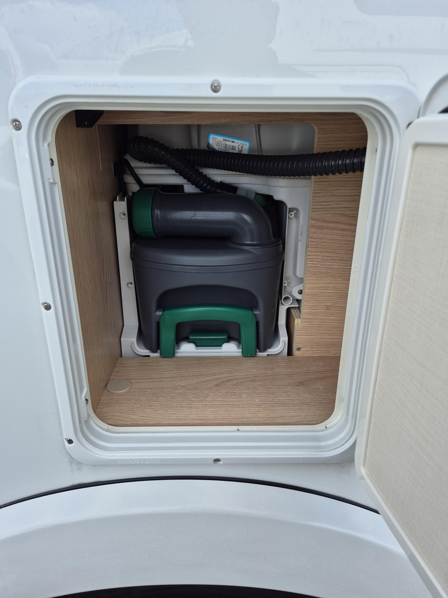 - Nasszelle mit einer Banktoilette inkl. Entlüftung, Waschbecken, Dusche und Stauschränken