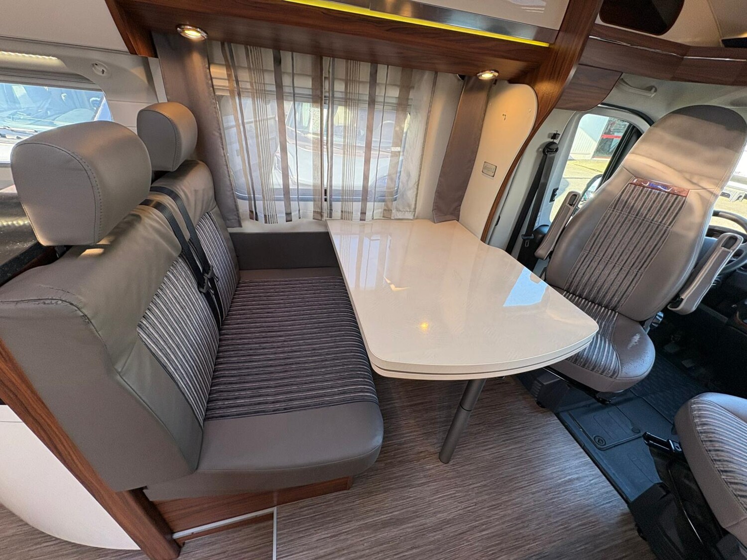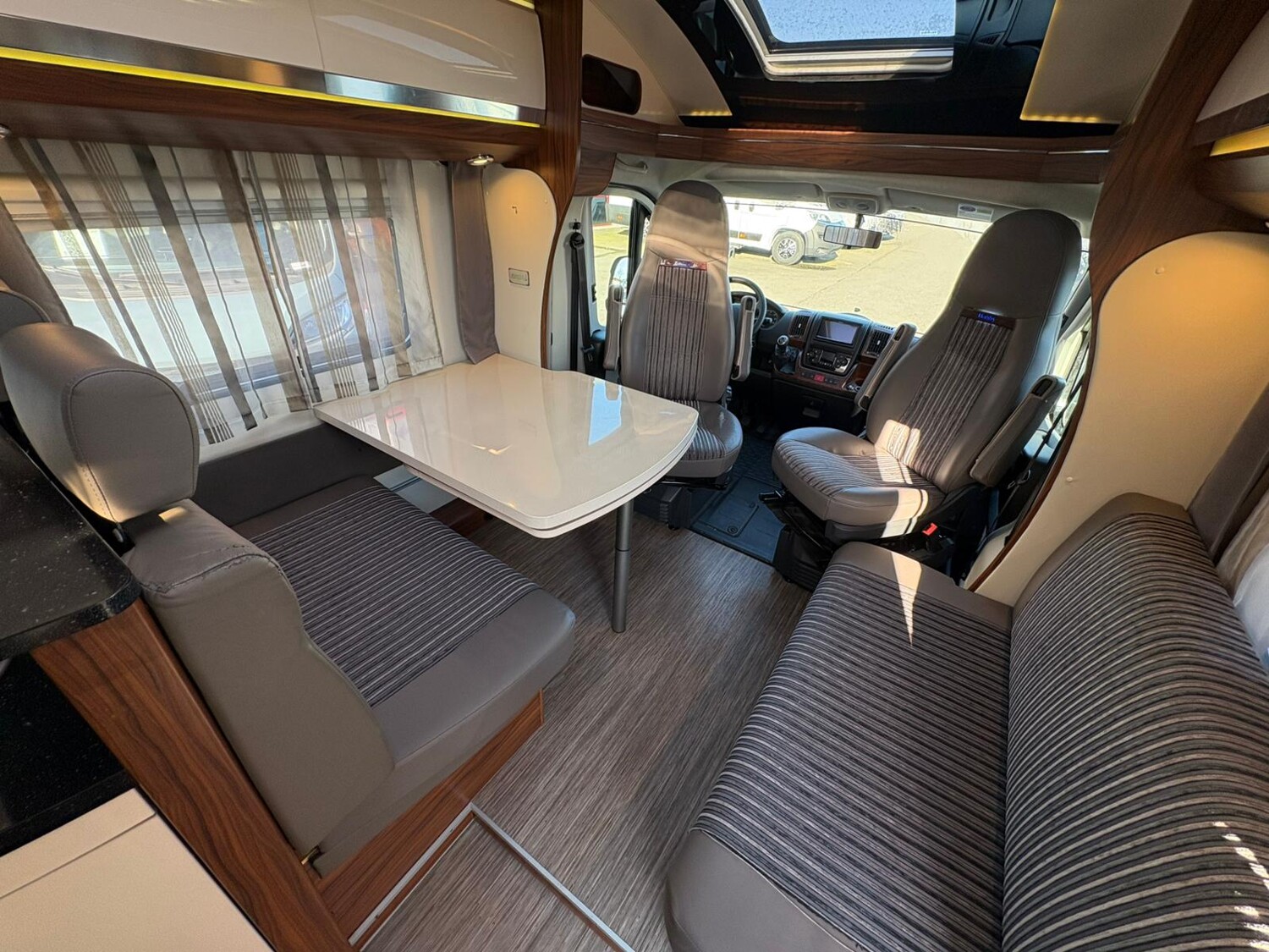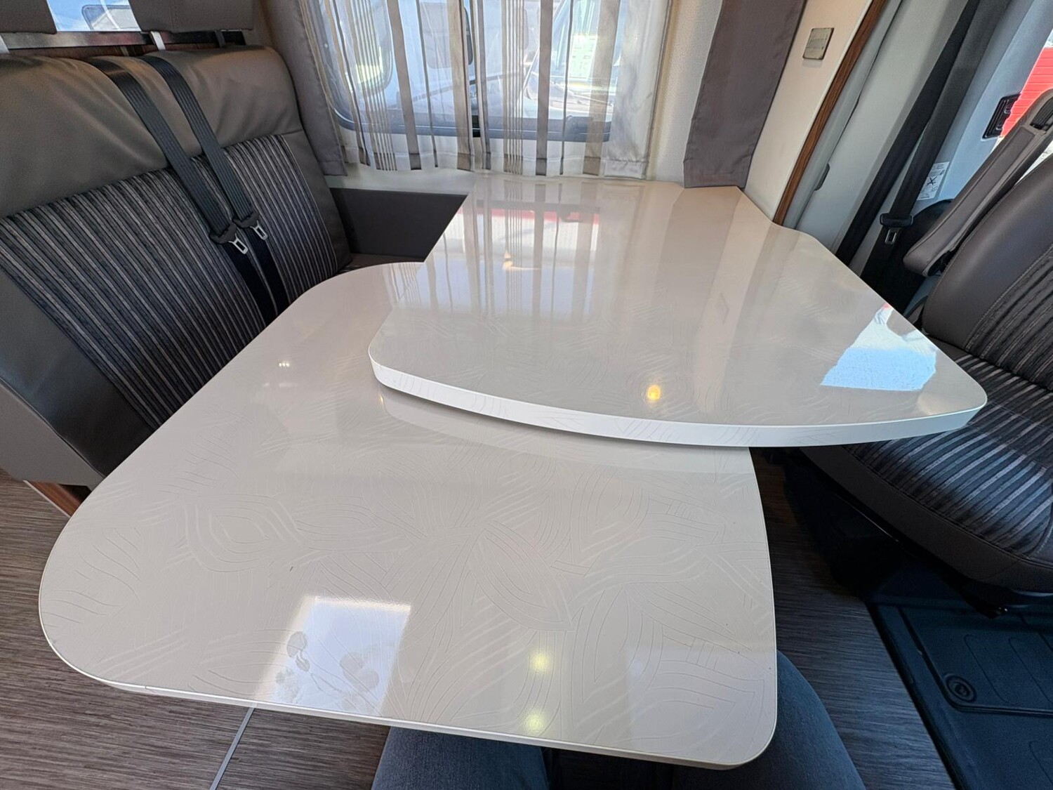 - Seitensitzgruppe inkl. Zusatzpolster für eine weitere Schlafmöglichkeit, drehbare Tischerweiterung, Stauschränke