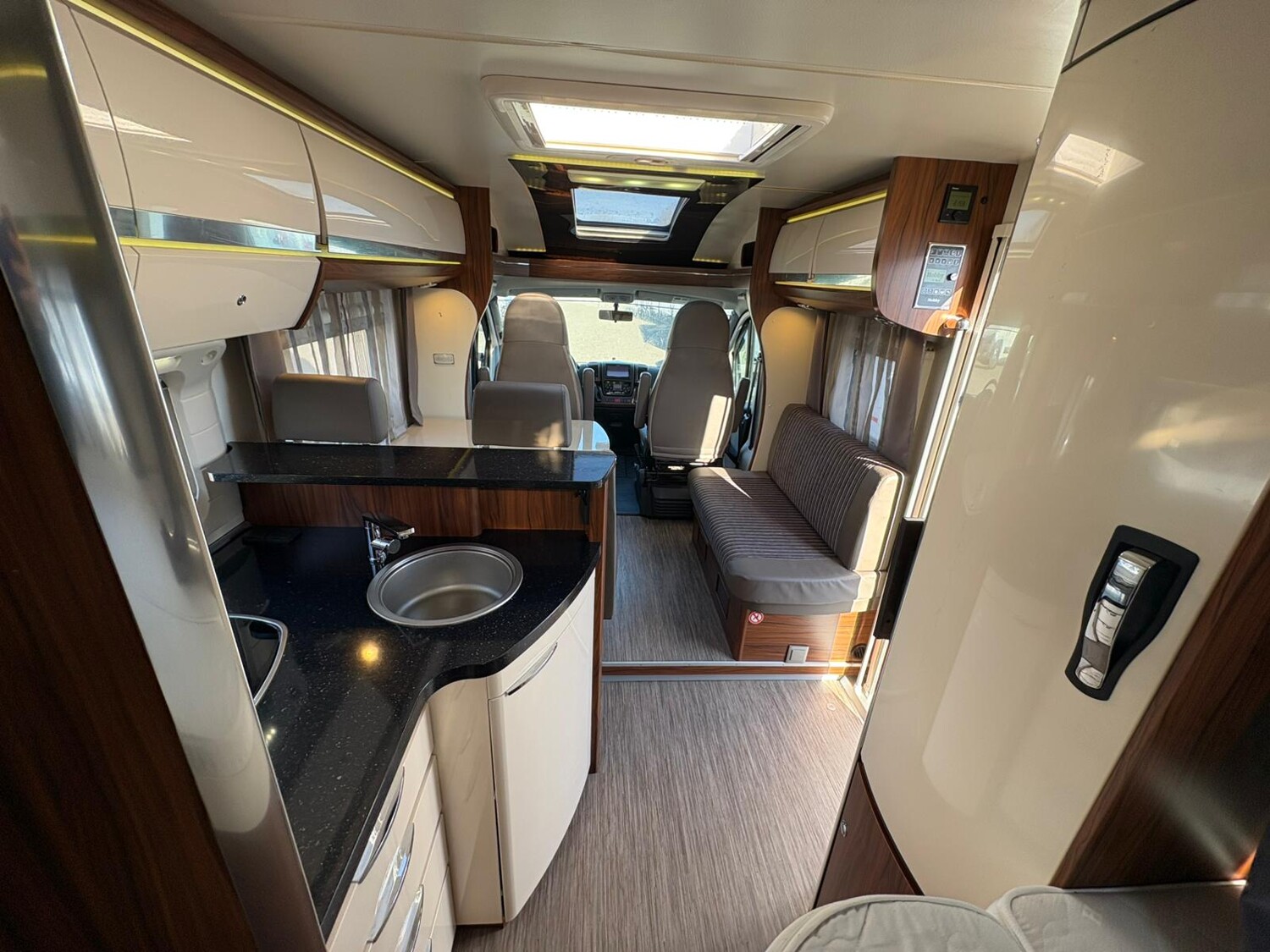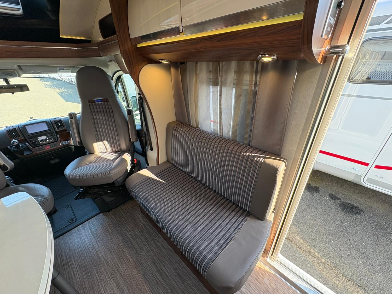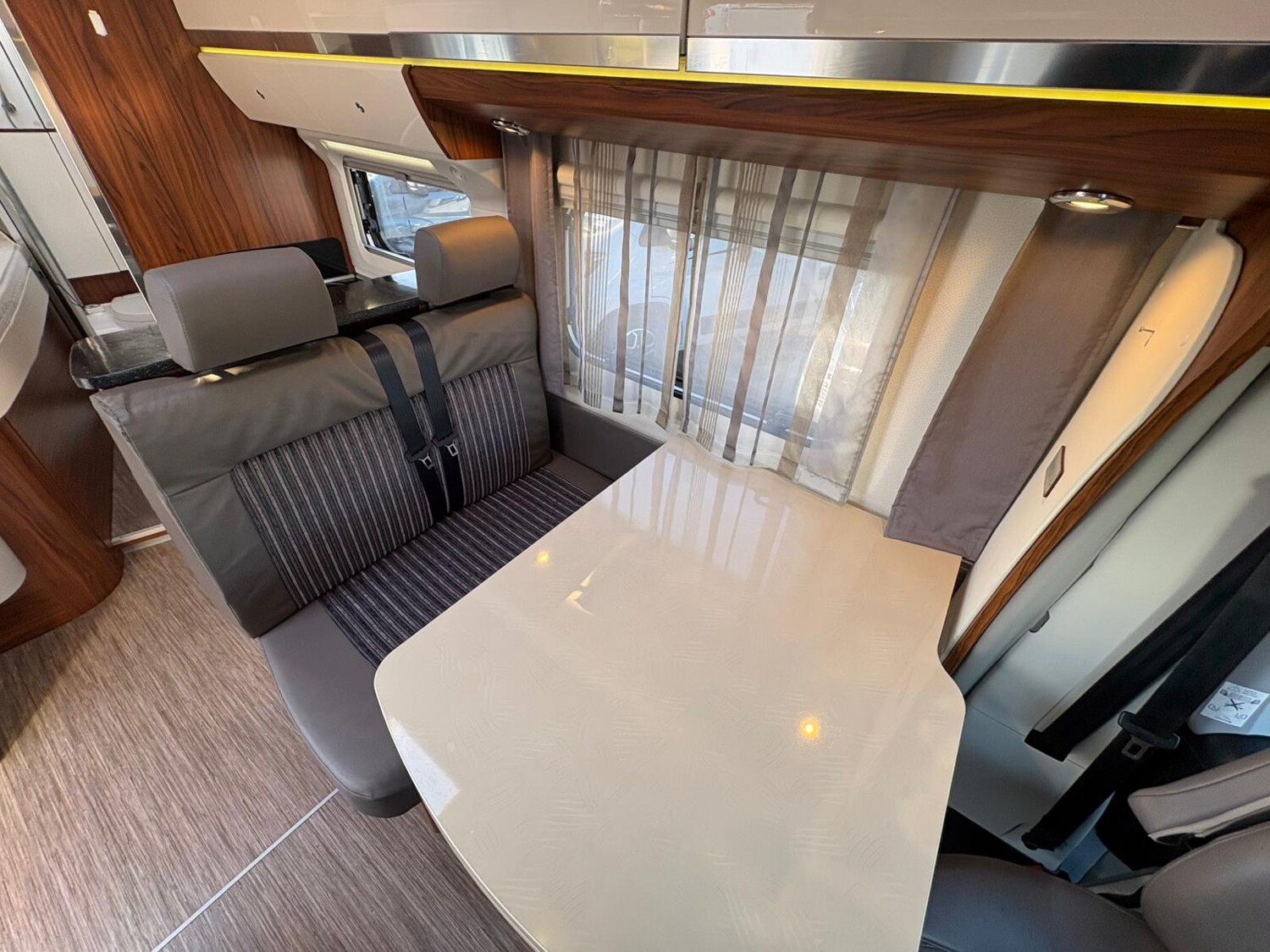 - Seitensitzgruppe inkl. Zusatzpolster für eine weitere Schlafmöglichkeit, drehbare Tischerweiterung, Stauschränke