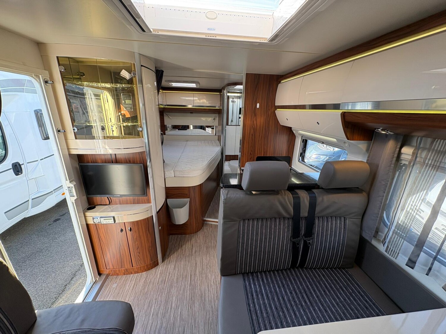 - Französisches Bett im Heck mit umliegenden Stauschränken und Leselampen