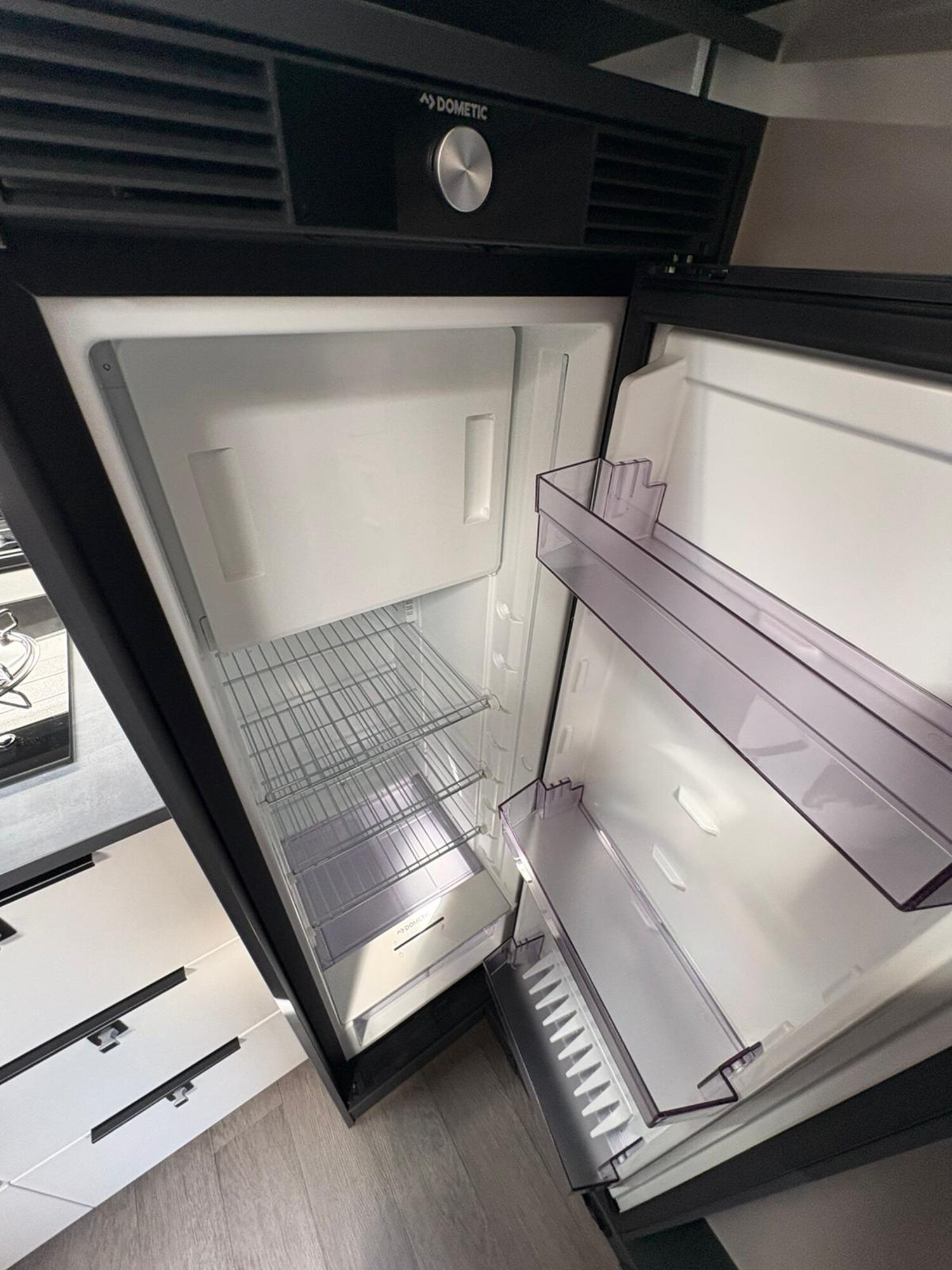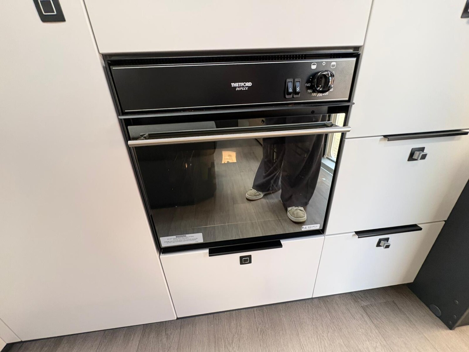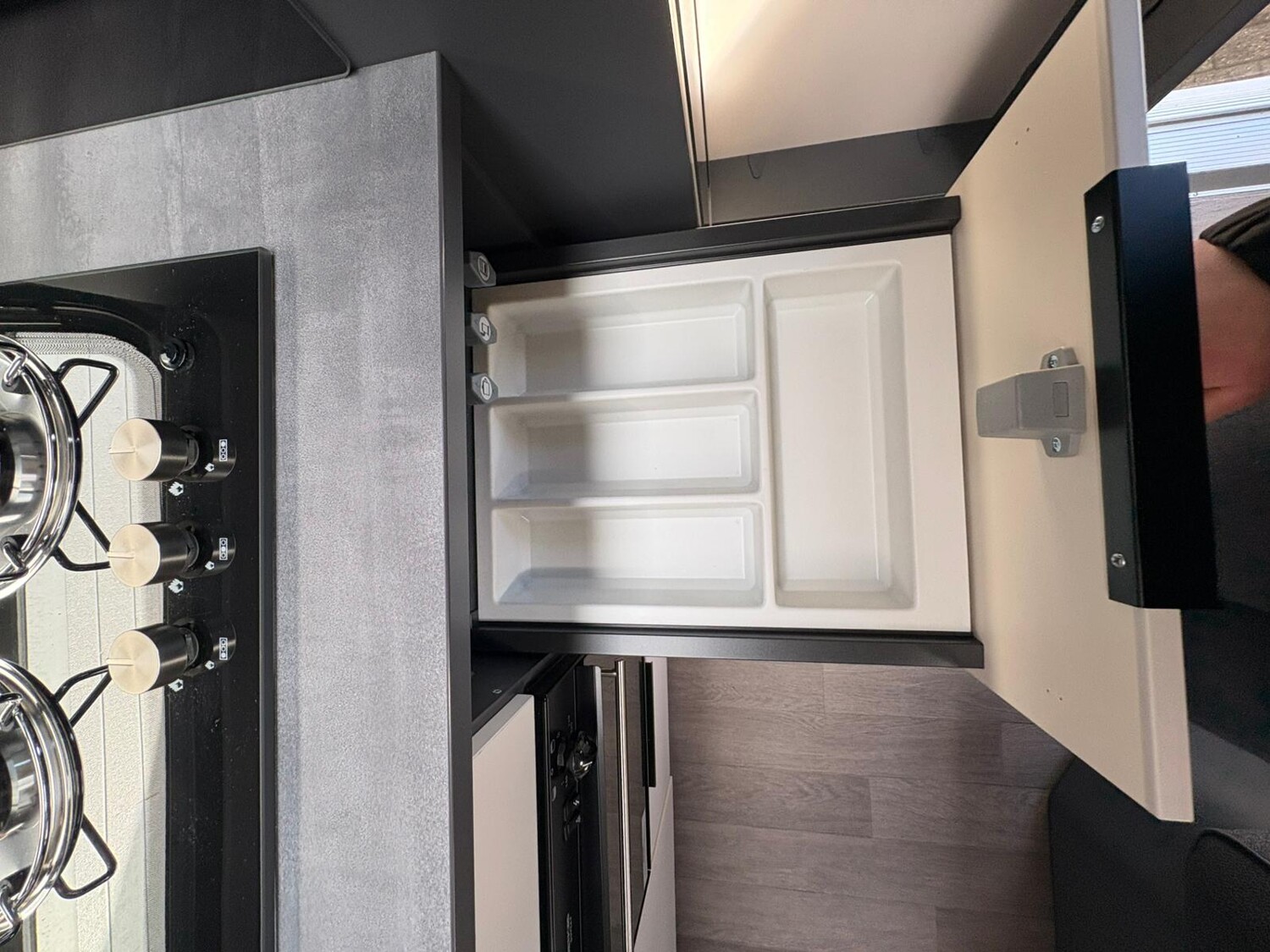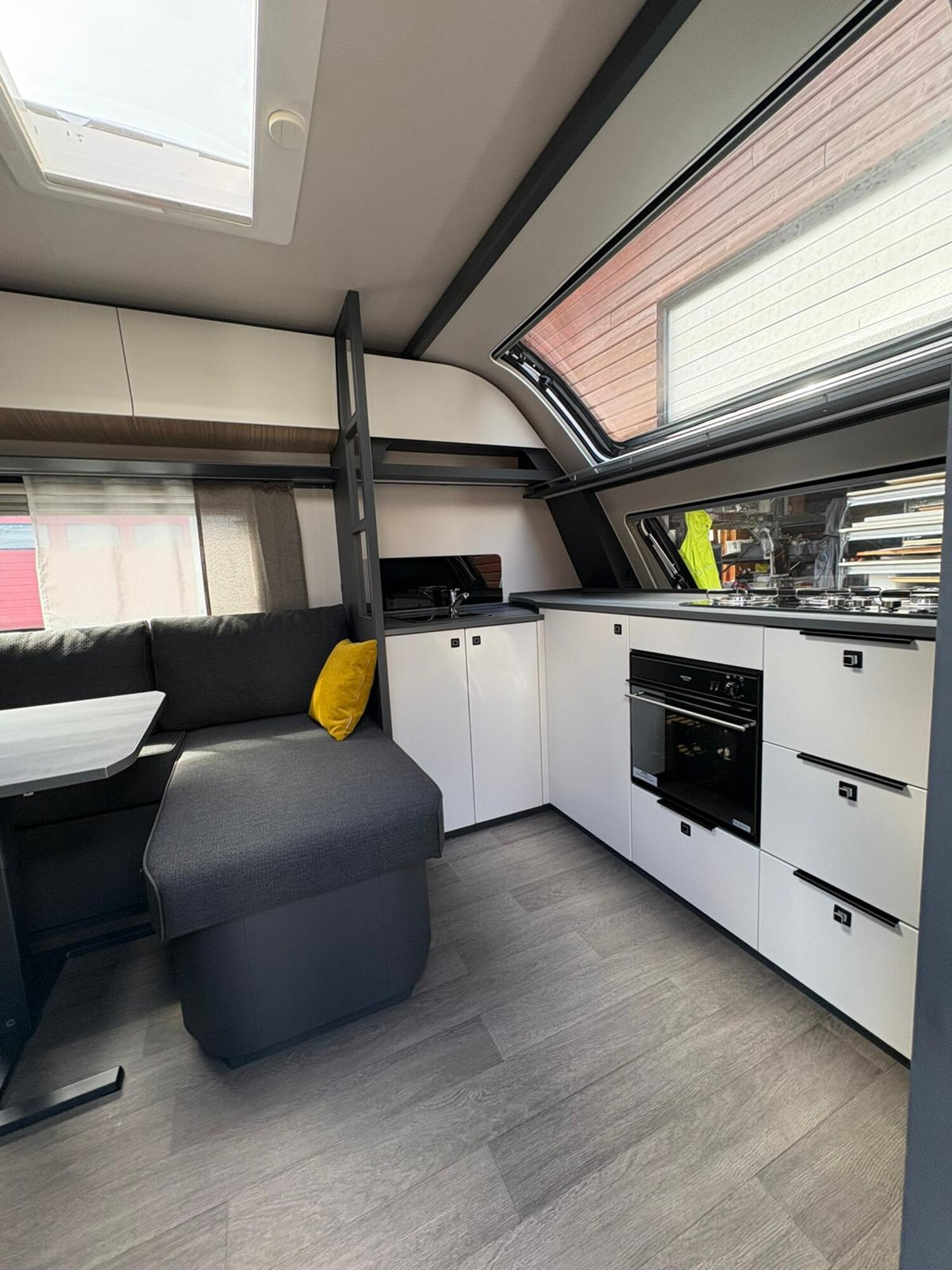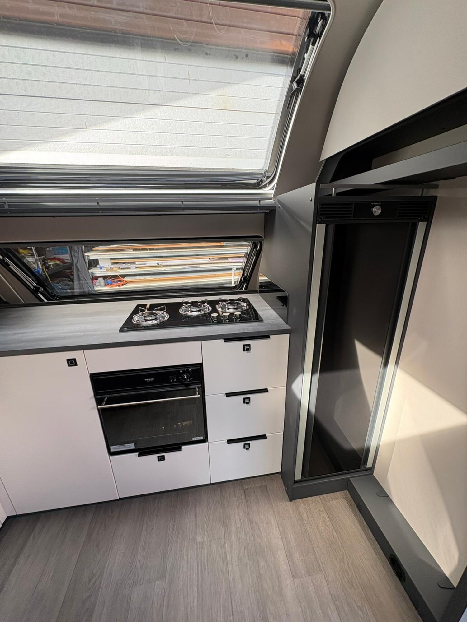 - Küche im Bug mit 3-Flammkocher, Spüle inkl. Glasabdeckung, Schubladen, Kühlschrank mit integriertem Eisfach, Panoramafenster