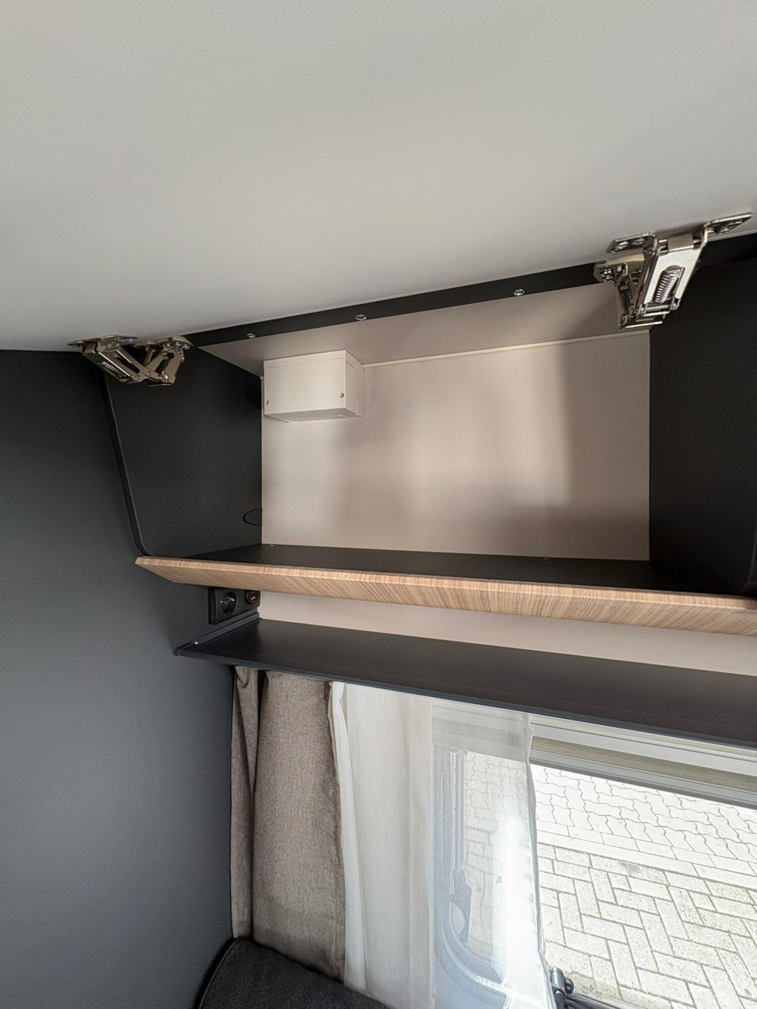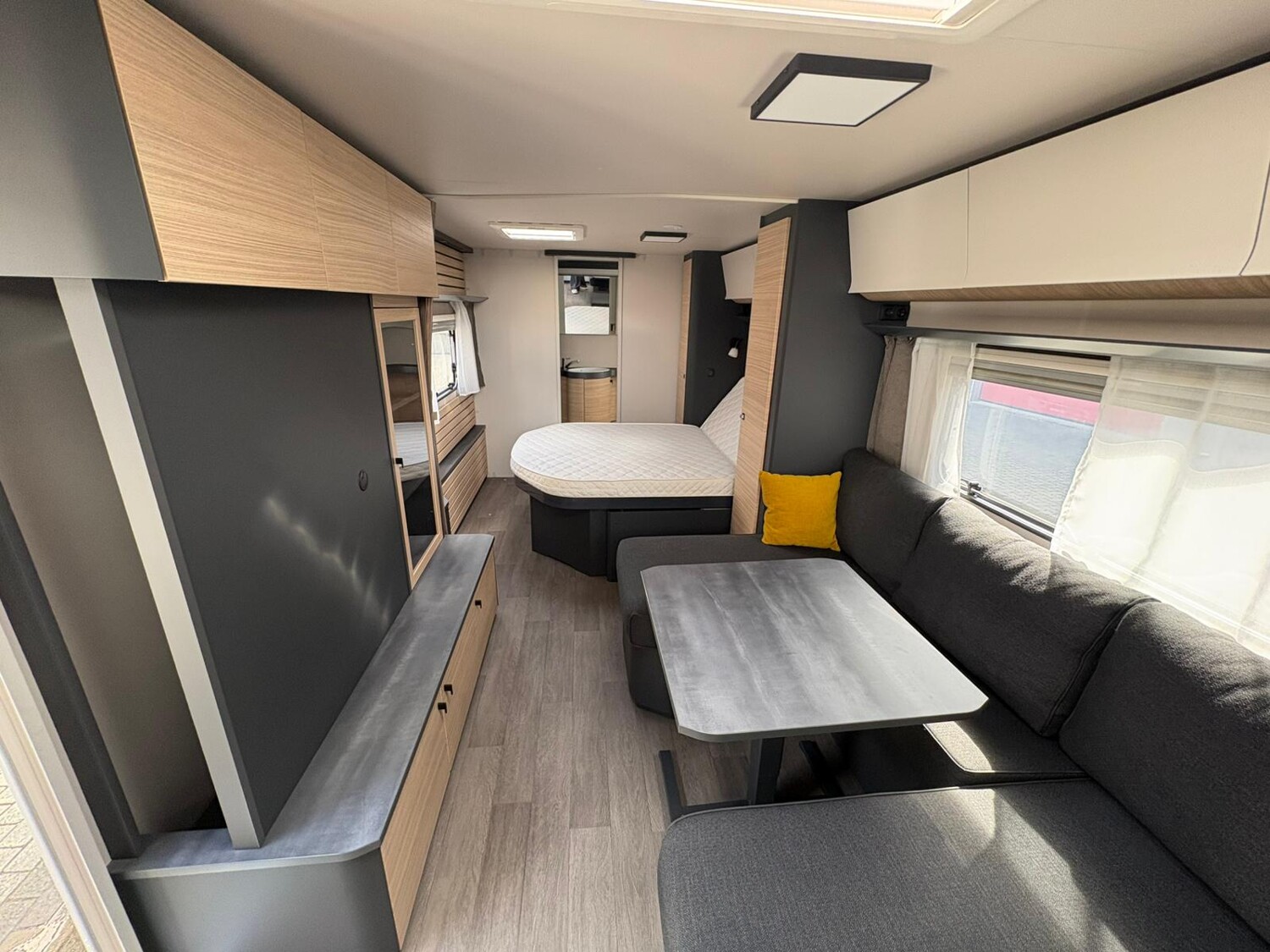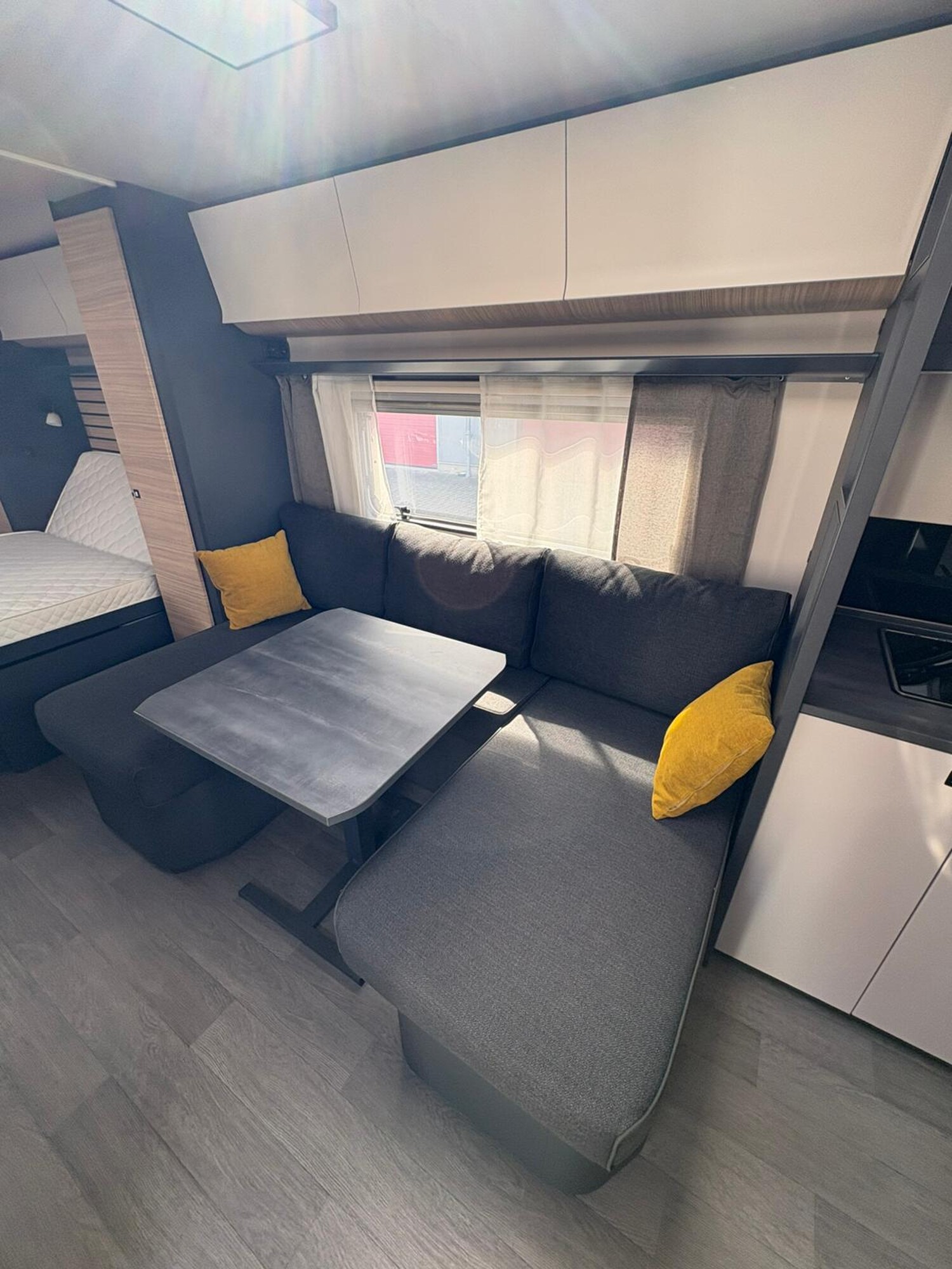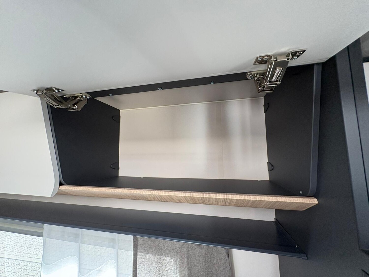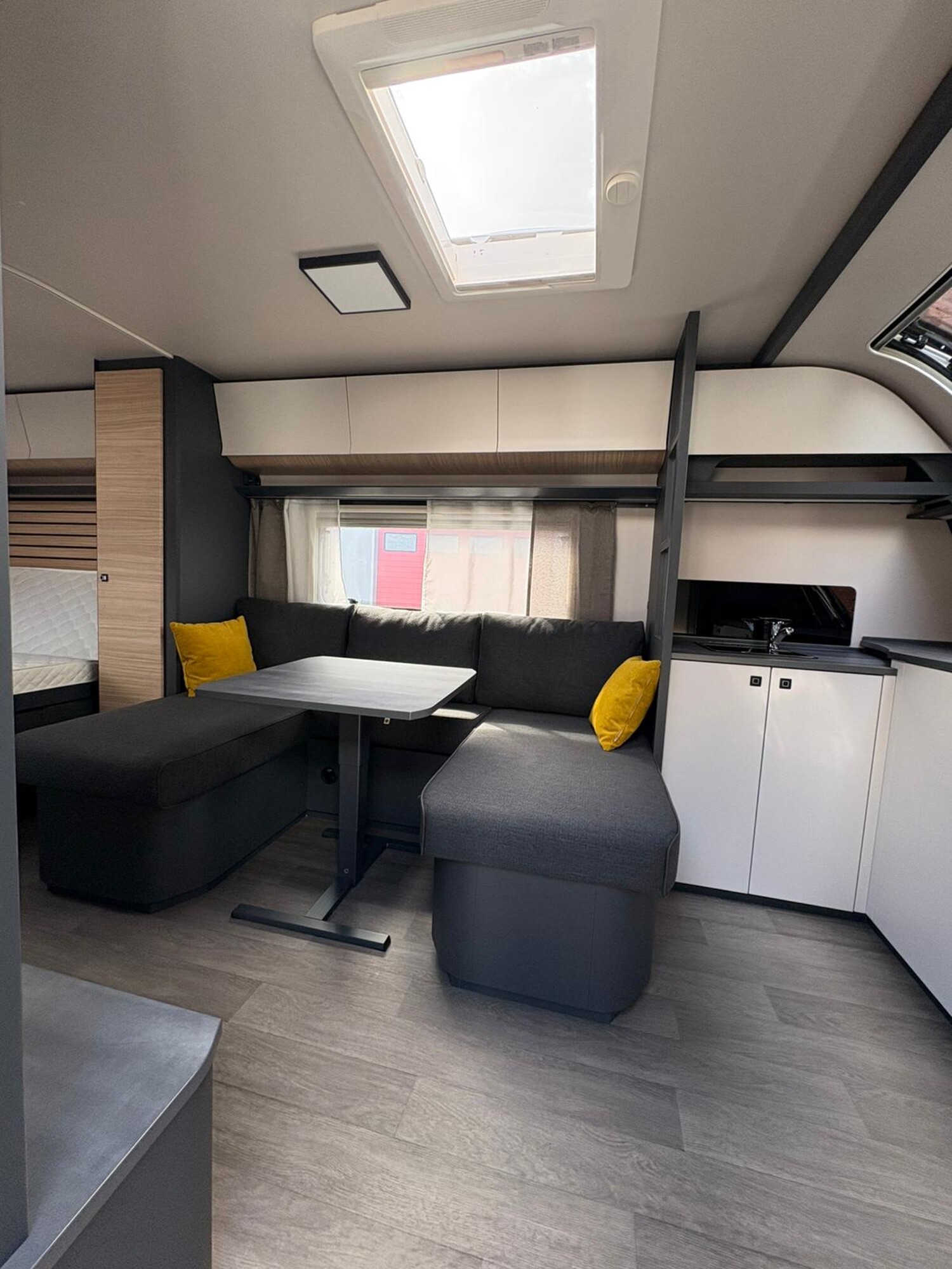 - Küche im Bug mit 3-Flammkocher, Spüle inkl. Glasabdeckung, Schubladen, Kühlschrank mit integriertem Eisfach, Panoramafenster