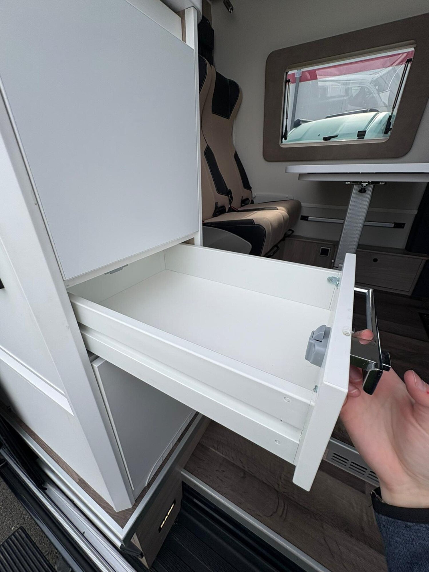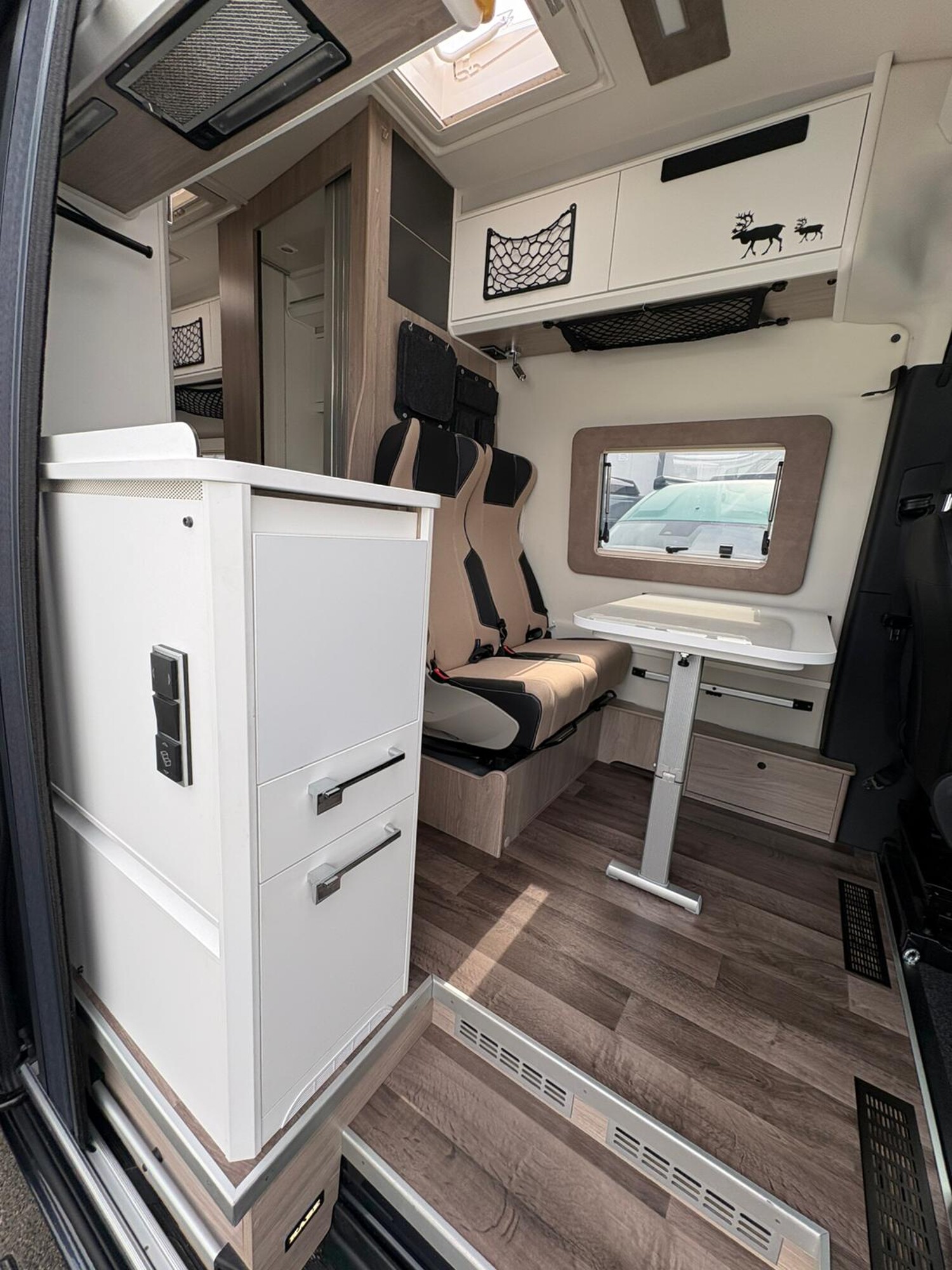- Seitensitzgruppe inkl. Zusatzpolster für eine weitere Schlafmöglichkeit, Ablagefächer, Stauschränke