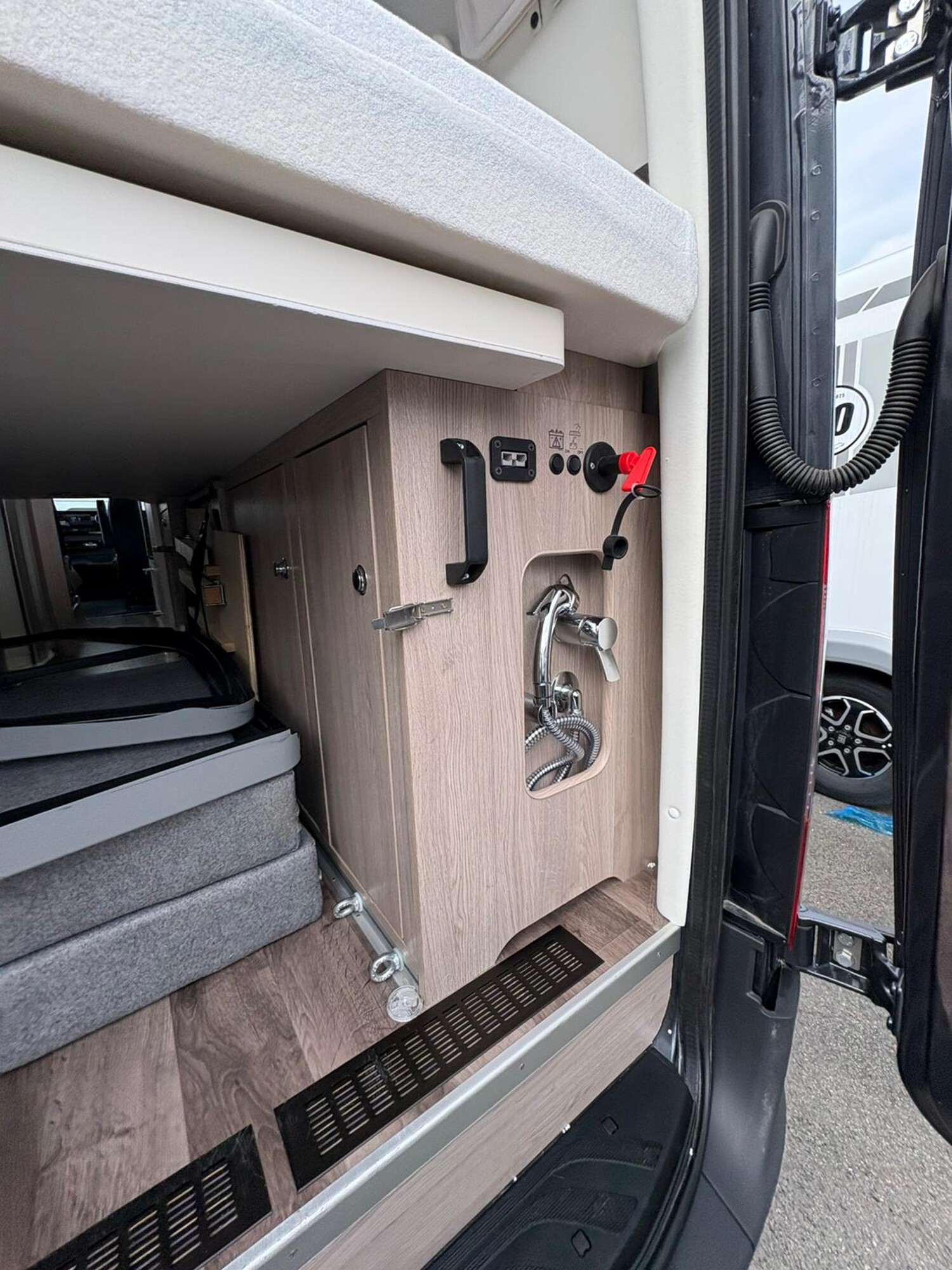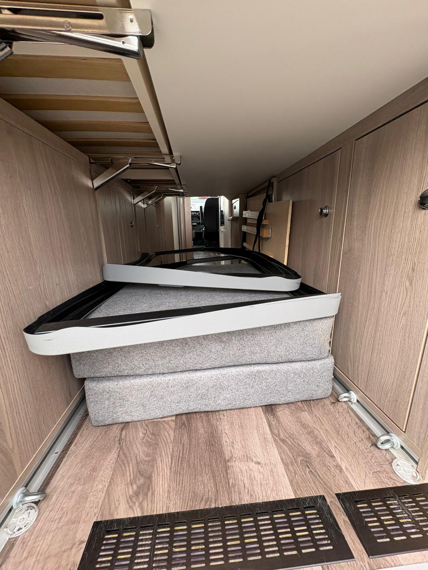- Einzelbetten im Heck mit Staufläche darunter, ausziehbarer Trittstufe, umliegenden Stauschränken, Aufbewahrungsnetze
