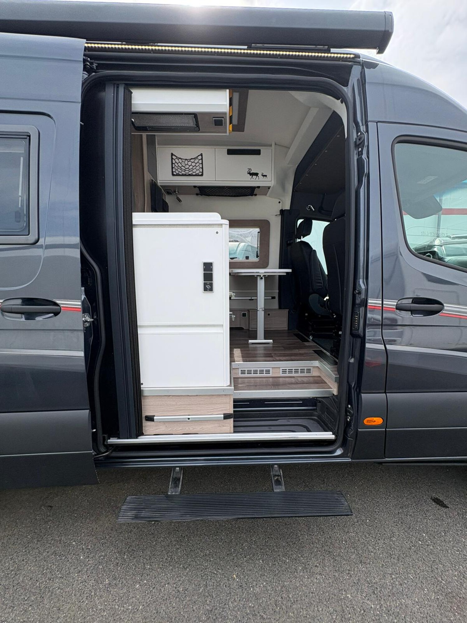 - Küchenzeile mit 2-Flammkocher und Spüle inkl. Glasabdeckung, Dunstabzugshaube, Kühlschrank mit integriertem Eisfach, Mülleimer Schubladen, Stauschränke, Küchenrollenhalter