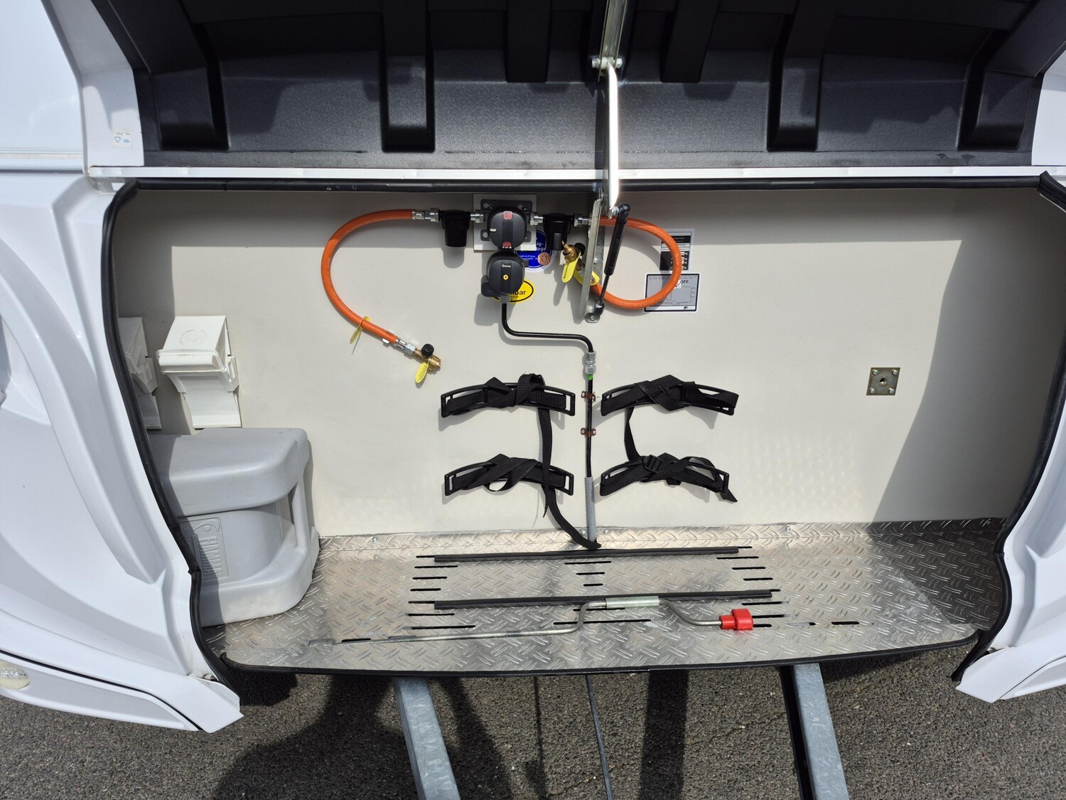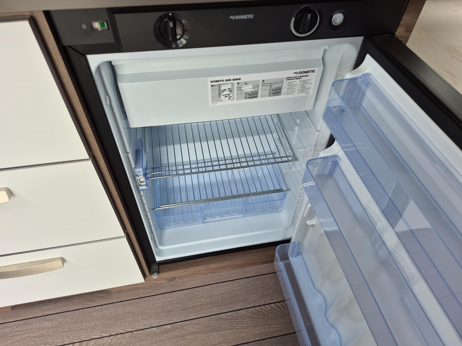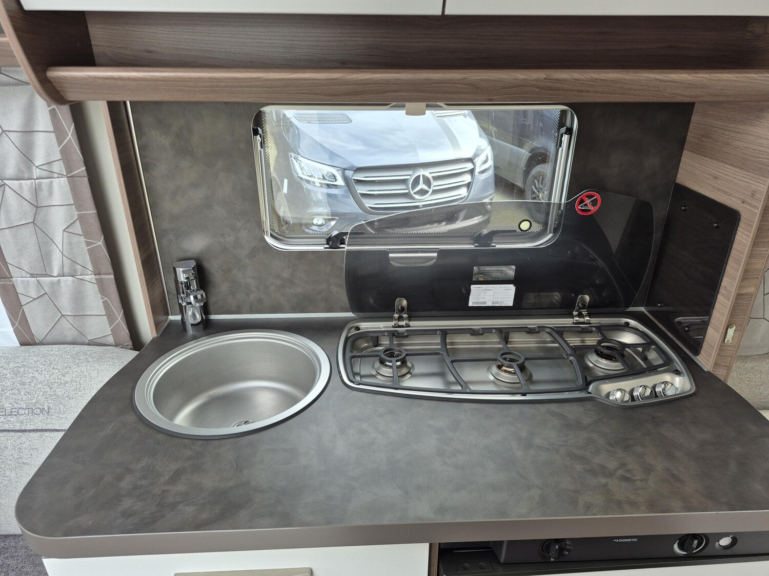 - Küchenzeile mit einem 3-Flammenkocher inkl. Glasabdeckung, einem Spülebecken, Schubladen und einem Dometic Kühlschrank