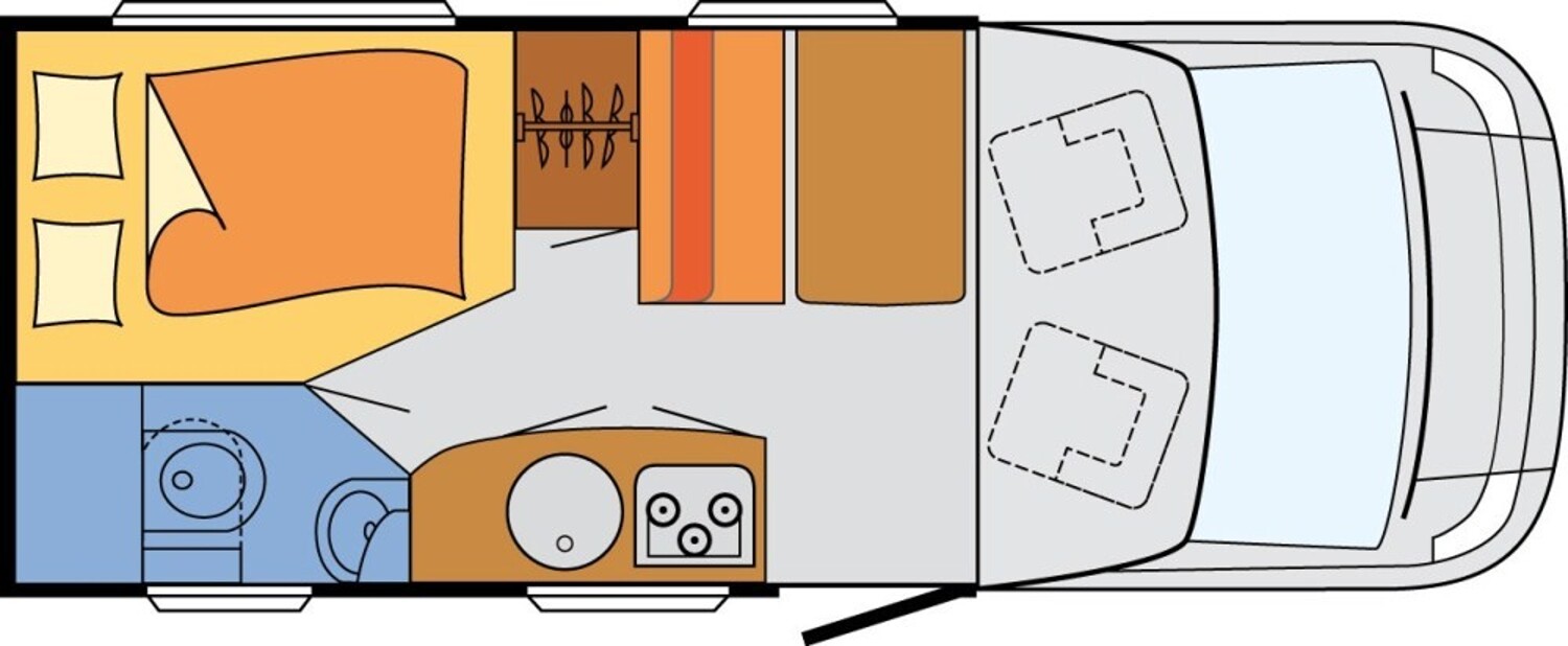 - Nasszelle mit einem Wasbecken, einer Kassetentoilette mit einem SOG Entlüftungsystem, Einer Dusche und Stauschränken
