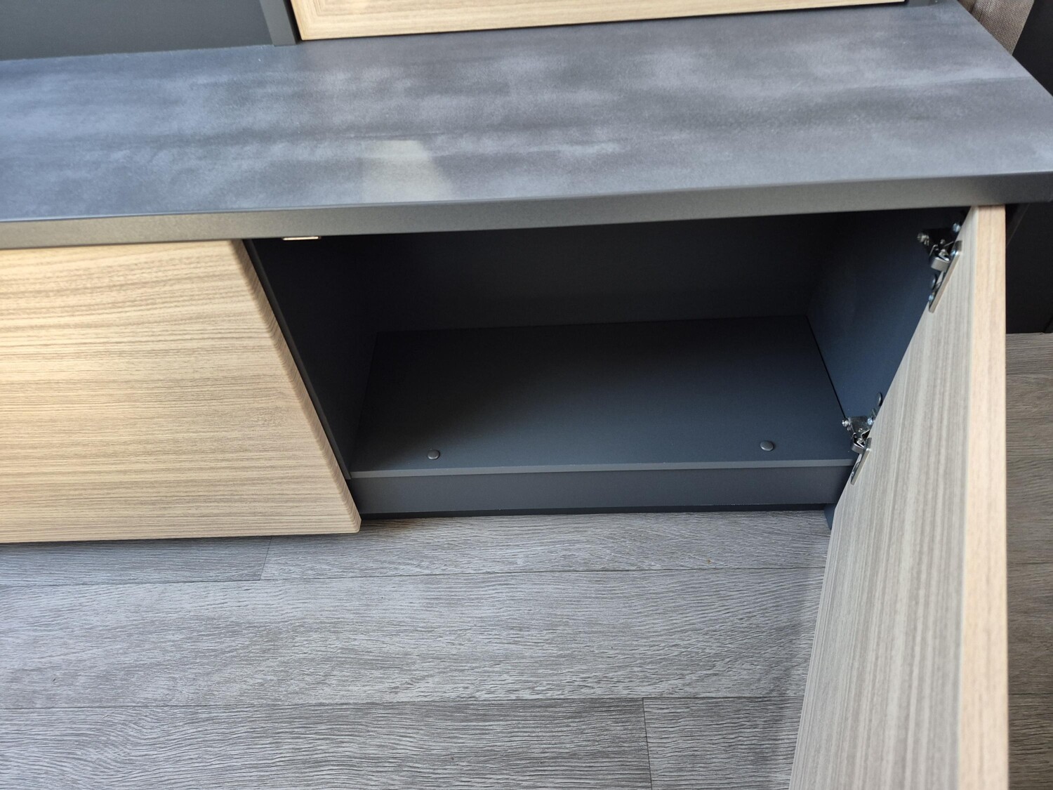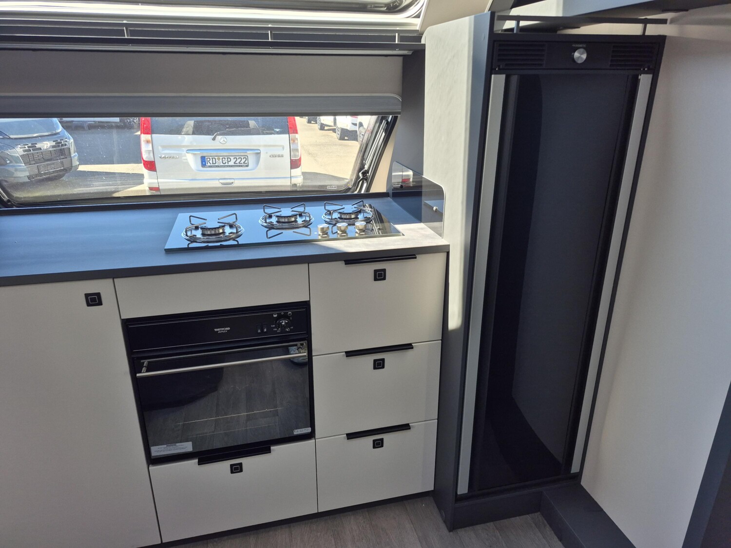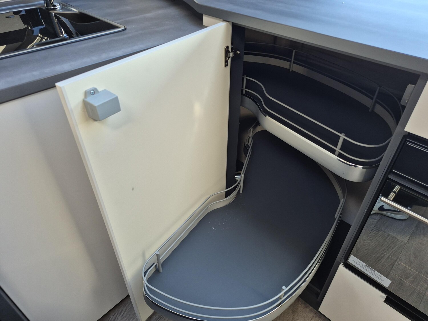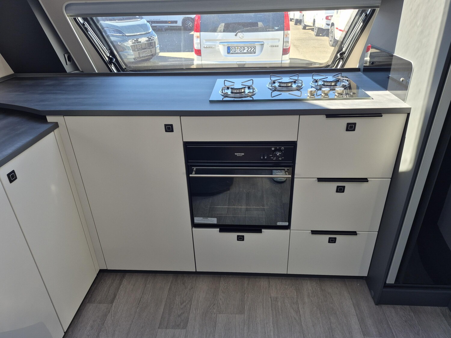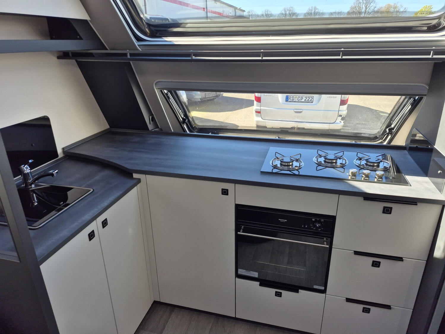 - Küchenzeile im Bug mit einem 3-Flammenkocher, einem Thetford Backofen, einem Spülbecken und vielen Stauschränke