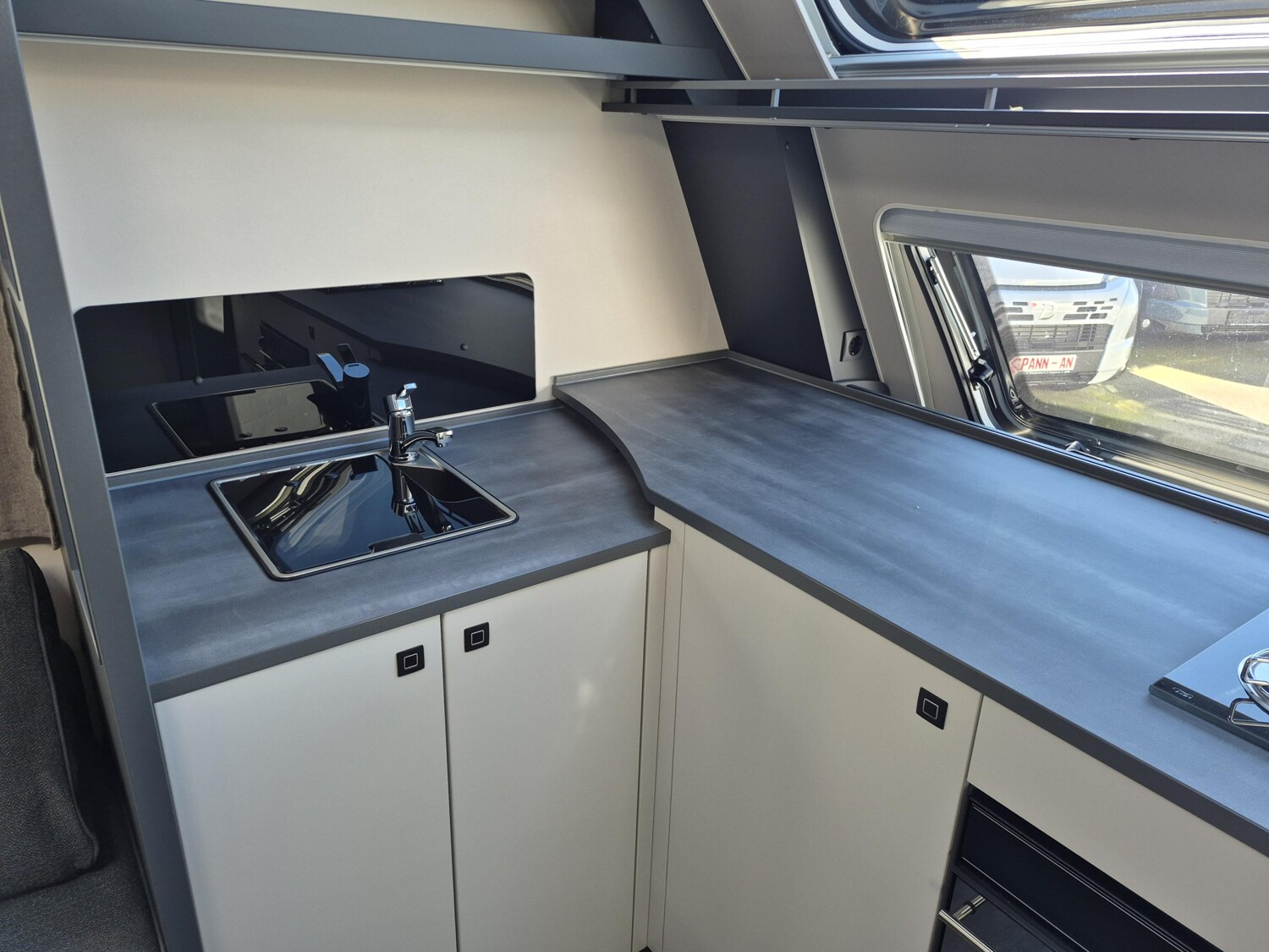 - Nasszelle im Heck mit einem Waschbecken, Kassettentoilette und einer Dusche